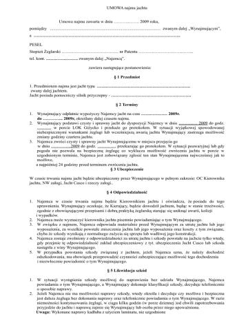 UMOWA najmu jachtu Umowa najmu zawarta w dniu ………..……. 2009 roku, pomiędzy ..................................................................................................... zwanym dalej „Wynajmującym”, a ……………………………………………………………………………………….. PESEL Stopień Żeglarski ………………………………… nr Patentu ……………………………….. tel. kont. …………………. zwanym dalej „Najemcą”. zawiera następujące postanowienia: § 1 Przedmiot 1. Przedmiotem najmu jest jacht typu ………………………………………………………. zwany dalej jachtem. Jacht posiada pomocniczy silnik przyczepny - ………………………………………………. § 2 Terminy 1. Wynajmujący odpłatnie wypożyczy Najemcy jacht na czas ……………… 2009r. do ………….. 2009r, określany dalej czasem najmu. 2. Wynajmujący podstawi czysty i sprawny jacht do dyspozycji Najemcy w dniu …………. 2009 do godz. ………. w porcie LOK Giżycko i przekaże go protokołem. W sytuacji wyjątkowej spowodowanej niebezpiecznymi warunkami żeglugi lub wcześniejszą awarią jachtu Wynajmujący zastrzega możliwość zmiany godziny czarteru jachtu. 3. Najemca zwróci czysty i sprawny jacht Wynajmującemu w miejscu przejęcia go w dniu …………..2009 do godz. …………, przekazując go protokołem. W sytuacji poawaryjnej lub gdy pogoda nie pozwala na bezpieczną żeglugę co wyklucza możliwość zwrócenia jachtu w porcie w uzgodnionym terminie, Najemca jest zobowiązany zgłosić ten stan Wynajmującemu najwcześniej jak to możliwe, a najpóźniej 24 godziny przed terminem zwrócenia jachtu. § 3 Ubezpieczenie W czasie trwania najmu jacht będzie ubezpieczony przez Wynajmującego w pełnym zakresie: OC Kierownika jachtu, NW załogi, Jacht Casco i rzeczy załogi.. § 4 Odpowiedzialność 1. Najemca w czasie trwania najmu będzie Kierownikiem jachtu i oświadcza, że posiada do tego uprawnienia. Wynajmujący oczekuje, że Kierujący, będzie dowodził jachtem, będąc w stanie trzeźwości, zgodnie z obowiązującymi przepisami i dobrą praktyką żeglarską starając się uniknąć awarii, kolizji i wypadków. 2. Najemca może wyznaczyć kierownika jachtu pisemnie powiadamiając o tym Wynajmującego. 3. W związku z najmem, Najemca odpowiada materialnie przed Wynajmującym za utratę jachtu lub jego wyposażenia, za wszelkie powstałe zniszczenia jachtu lub jego wyposażenia oraz koszty z tym związane, chyba że szkody wynikają z normalnego zużycia się sprzętu lub wadliwej jego konstrukcji. 4. Najemca zostaje zwolniony z odpowiedzialności za utratę jachtu i szkody powstałe na jachcie tylko wtedy, gdy przejmie tę odpowiedzialność zakład ubezpieczeniowy z tyt. ubezpieczenia Jacht Casco lub szkoda nastąpiła z winy Wynajmującego. 5. W przypadku powstania szkody związanej z jachtem, jeżeli Najemca uzna, że należy dochodzić odszkodowania, ma obowiązek przeprowadzić czynności zabezpieczające możliwość tego dochodzenia i niezwłocznie powiadomić o tym Wynajmującego. § 5 Likwidacja szkód 1. W sytuacji wystąpienia szkody możliwej do naprawienia bez udziału Wynajmującego, Najemca powiadamia o tym Wynajmującego, a Wynajmujący dokonuje klasyfikacji szkody, decyduje telefonicznie o sposobie naprawy. 2. Jeżeli Najemca nie ma możliwości naprawy szkody, wtedy określa i decyduje czy możliwa i bezpieczna jest dalsza żegluga bez dokonania naprawy oraz telefonicznie powiadamia o tym Wynajmującego. W razie niemożności kontynuowania żeglugi, w ciągu kilku godzin (w porze dziennej )od chwili zapotrzebowania przyjedzie do jachtu i naprawą zajmie się Wynajmujący lub osoba przez niego upoważniona. Uwaga: Wykonane naprawy kadłuba z użyciem laminatu, nie uzgodnione z Wynajmującym będą uznane za dodatkowe szkody powstałe z winy Najemcy. § 6 Ograniczenia 1. Akwen żeglugi podczas trwania najmu ogranicza się do Szlaku Wielkich Jezior Mazurskich. Żegluga na jachcie może się odbywać przy sile wiatru do 5 stopni wg skali Beauforta, co oznacza zakaz wyjścia z portu podczas silniejszego wiatru lub w miarę możliwości bezpieczne przerwanie żeglugi. 2. Najemca nie ma prawa najmu jachtu innym osobom pod karą równą podwójnej opłacie czarterowej. § 7 Zapłata i sposób zapłaty 1. Zaliczka została wpłacona na konto mjacht.pl. 2. Pozostała kwota ……… ……….. /słownie/………………………………………… zostanie wpłacona przez wynajmującego w dniu odbioru jachtu. § 8 Zerwanie umowy i kary Zerwanie umowy wymaga formy pisemnej. • 1N. Jeżeli Najemca wycofa się z umowy na 30 dni przed podstawieniem jachtu do czarteru wówczas nie przysługuje mu zwrot wpłaconych kwot, a w razie rezygnacji 14dni przed najmem, Wynajmującemu przysługuje od Najemcy łącznie 2/3 całkowitej opłaty czarterowej • 2N. Najemca na skutek przekroczenia terminu zwrócenia jachtu, o którym mowa w §3 umowy, jest zobowiązany do zapłacenia Wynajmującemu kary za zwłokę w wysokości 20,-PLN za każdą godzinę zwłoki przez pierwsze 8 godzin, a w przypadku zwłoki dłuższej niż 3 godzin Najemca zobowiązany jest do pokrycia wszystkich strat Wynajmującego wynikających z braku jachtu na czas dla następnego Najemcy, z którym umowa została podpisana na takich jak niniejsze zasadach. • lW. Jeżeli Wynajmujący rażąco zaniedba postanowienia niniejszej umowy dotyczące wyposażenia jachtu lub nie ubezpieczy jachtu., Najemca ma prawo zerwać umowę i natychmiast otrzymać wszystkie kwoty zapłacone Wynajmującemu. Taka sytuacja może być traktowana jak sprawa sporna. • 2W. Jeżeli Wynajmujący przekroczy termin podstawienia jachtu o co najmniej 4 godziny wówczas Najemca może uznać, że Wynajmujący zerwał niniejszą umowę. • 3W. Jeśli Wynajmujący wycofa się z umowy do dnia terminu podstawienia jachtu do najmu włącznie,