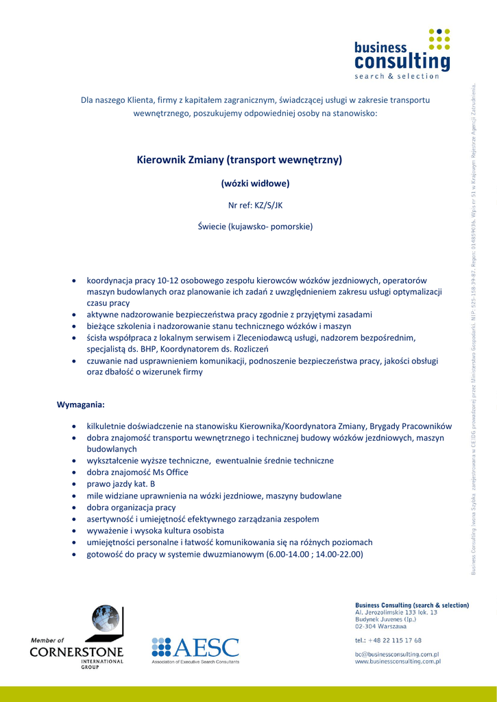 Dla naszego Klienta, firmy z kapitałem zagranicznym, świadczącej usługi w zakresie transportu wewnętrznego, poszukujemy odpowiedniej osoby na stanowisko: Kierownik Zmiany (transport wewnętrzny) (wózki widłowe) Nr ref: KZ/S/JK Świecie (kujawsko- pomorskie) koordynacja pracy 10-12 osobowego zespołu kierowców wózków jezdniowych, operatorów maszyn budowlanych oraz planowanie ich zadań z uwzględnieniem zakresu usługi optymalizacji czasu pracy aktywne nadzorowanie bezpieczeństwa pracy zgodnie z przyjętymi zasadami bieżące szkolenia i nadzorowanie stanu technicznego wózków i maszyn ścisła współpraca z lokalnym serwisem i Zleceniodawcą usługi, nadzorem bezpośrednim, specjalistą ds. BHP, Koordynatorem ds. Rozliczeń czuwanie nad usprawnieniem komunikacji, podnoszenie bezpieczeństwa pracy, jakości obsługi oraz dbałość o wizerunek firmy Wymagania: kilkuletnie doświadczenie na stanowisku Kierownika/Koordynatora Zmiany, Brygady Pracowników dobra znajomość transportu wewnętrznego i technicznej budowy wózków jezdniowych, maszyn budowlanych wykształcenie wyższe techniczne, ewentualnie średnie techniczne dobra znajomość Ms Office prawo jazdy kat. B mile widziane uprawnienia na wózki jezdniowe, maszyny budowlane dobra organizacja pracy asertywność i umiejętność efektywnego zarządzania zespołem wyważenie i wysoka kultura osobista umiejętności personalne i łatwość komunikowania się na różnych poziomach gotowość do pracy w systemie dwuzmianowym (6.00-14.00 ; 14.00-22.00) Oferujemy: pracę w prężnie rozwijającej się firmie o ustabilizowanej sytuacji rynkowej narzędzia niezbędne do pracy na tym stanowisku zatrudnienie na umowę o pracę Aplikacje zawierające: cv , list motywacyjny (wersja w jęz. polskim), numer referencyjny oraz wypełnione Oświadczenie BC o przetwarzaniu danych osobowych prosimy przesyłać za pośrednictwem poniższego linku: http://www.businessconsulting.com.pl/pages/job/1163 Informujemy, że skontaktujemy się tylko z wybranymi kandydatami, a nadesłane aplikacje nie będą kandydatom zwracane. Aplikacje nie zawierające wypełnionego Oświadczenia BC nie będą rozpatrywane. 2