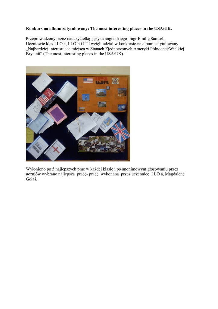 Konkurs na album zatytułowany: The most interesting places in the USA/UK. Przeprowadzony przez nauczycielkę języka angielskiego- mgr Emilię Samsel. Uczniowie klas I LO a, I LO b i I TI wzięli udział w konkursie na album zatytułowany „Najbardziej interesujące miejsca w Stanach Zjednoczonych Ameryki Północnej/Wielkiej Brytanii” (The most interesting places in the USA/UK). Wyłoniono po 5 najlepszych prac w kaŜdej klasie i po anonimowym głosowaniu przez uczniów wybrano najlepszą pracę- pracę wykonaną przez uczennicę I LO a, Magdalenę Gołaś. GRATULACJE☺
