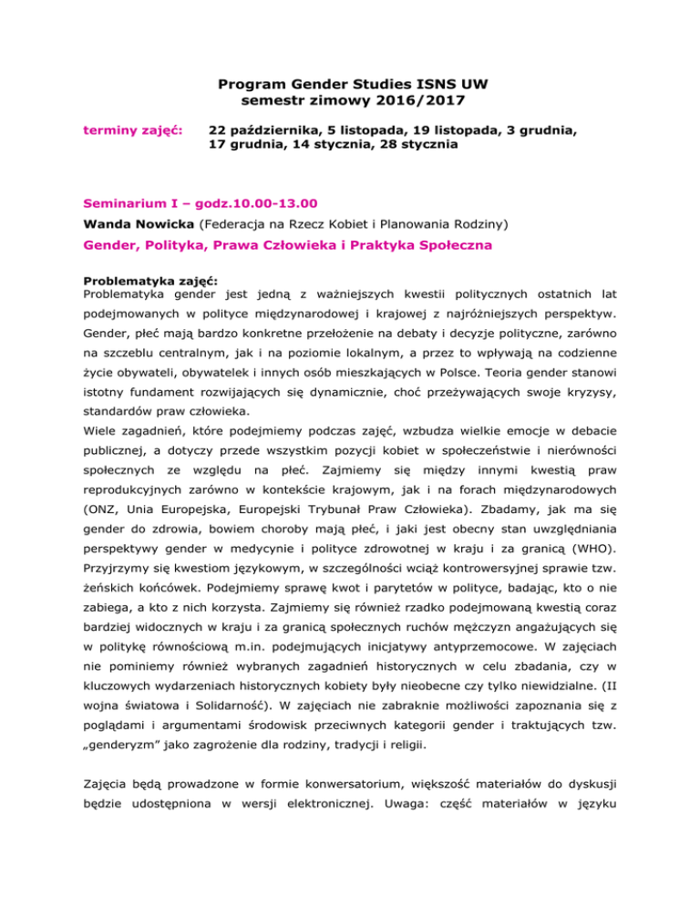 Program Gender Studies ISNS UW semestr zimowy 2016/2017 terminy zajęć: 22 października, 5 listopada, 19 listopada, 3 grudnia, 17 grudnia, 14 stycznia, 28 stycznia Seminarium I – godz.10.00-13.00 Wanda Nowicka (Federacja na Rzecz Kobiet i Planowania Rodziny) Gender, Polityka, Prawa Człowieka i Praktyka Społeczna Problematyka zajęć: Problematyka gender jest jedną z waŜniejszych kwestii politycznych ostatnich lat podejmowanych w polityce międzynarodowej i krajowej z najróŜniejszych perspektyw. Gender, płeć mają bardzo konkretne przełoŜenie na debaty i decyzje polityczne, zarówno na szczeblu centralnym, jak i na poziomie lokalnym, a przez to wpływają na codzienne Ŝycie obywateli, obywatelek i innych osób mieszkających w Polsce. Teoria gender stanowi istotny fundament rozwijających się dynamicznie, choć przeŜywających swoje kryzysy, standardów praw człowieka. Wiele zagadnień, które podejmiemy podczas zajęć, wzbudza wielkie emocje w debacie publicznej, a dotyczy przede wszystkim pozycji kobiet w społeczeństwie i nierówności społecznych ze względu na płeć. Zajmiemy się między innymi kwestią praw reprodukcyjnych zarówno w kontekście krajowym, jak i na forach międzynarodowych (ONZ, Unia Europejska, Europejski Trybunał Praw Człowieka). Zbadamy, jak ma się gender do zdrowia, bowiem choroby mają płeć, i jaki jest obecny stan uwzględniania perspektywy gender w medycynie i polityce zdrowotnej w kraju i za granicą (WHO). Przyjrzymy się kwestiom językowym, w szczególności wciąŜ kontrowersyjnej sprawie tzw. Ŝeńskich końcówek. Podejmiemy sprawę kwot i parytetów w polityce, badając, kto o nie zabiega, a kto z nich korzysta. Zajmiemy się równieŜ rzadko podejmowaną kwestią coraz bardziej widocznych w kraju i za granicą społecznych ruchów męŜczyzn angaŜujących się w politykę równościową m.in. podejmujących inicjatywy antyprzemocowe. W zajęciach nie pominiemy równieŜ wybranych zagadnień historycznych w celu zbadania, czy w kluczowych wydarzeniach historycznych kobiety były nieobecne czy tylko niewidzialne. (II wojna światowa i Solidarność). W zajęciach nie zabraknie moŜliwości zapoznania się z poglądami i argumentami środowisk przeciwnych kategorii gender i traktujących tzw. „genderyzm” jako zagroŜenie dla rodziny, tradycji i religii. Zajęcia będą prowadzone w formie konwersatorium, większość materiałów do dyskusji będzie udostępniona w wersji elektronicznej. Uwaga: część materiałów w języku angielskim; główne ich tezy zaprezentuję podczas wykładu. Warunek zaliczenia: obecność, aktywność. Warunek oceny: praca pisemna. Gender w działaniu – Wprowadzenie do wykładu Gender i język Po co nam Ŝeńskie końcówki? Czy Ŝeńskie końcówki obniŜają pozycję kobiet? Małocha-Krupa Agnieszka, (red.), „Słownik nazw Ŝeńskich polszczyzny", Wyd. Uniwersytetu Wrocławskiego (2016). Markowski Andrzej, „Zakres uŜywania form Ŝeńskich, nazw zawodów i funkcji kobiet polityków”, http://biurose.sejm.gov.pl/teksty_pdf_95/e-48.pdf http://wyborcza.pl/1,76842,13049773,Poslanki__senatorki__premierki_i_ministry_wcho dza.html Karczewski Jakub, Prezeska, adwokatka, wykładowczyni – kilka słów o Ŝeńskich formach nazw zawodów, tytułów i stanowisk, Feminoteka (2011). http://prawoaplec.wpia.uw.edu.pl/index.php?option=com_content&view=article&id=108 %3Ajakub-karczewski&catid=47%3Anasze-artykuly&Itemid=93 Stanowisko Rady Języka Polskiego (2012) (http://www.rjp.pan.pl/index.php?option=com_content&view=article&id=1359:stanowisk o-rady-jzyka-polskiego-w-sprawie-eskich-form-nazw-zawodow-i-tytuow) https://zawislawska.com/2013/03/ http://www.didaskalia.pl/113_rezyserka.htm https://literufka.wordpress.com/tag/zenskie-formy-nazw-zawodow/ http://codziennikfeministyczny.pl/graff-zenskich-koncowkach-raz-jeszcze-miejmynadzieje-ze-ostatni/ Prawa reprodukcyjne w Polsce i świecie Dokąd zmierzamy? Czy ta wojna kiedyś się skończy? Czy kobiety zyskują czy tracą? Goldberg Michelle, „Wojny Reprodukcyjne, Płeć, Władza, a Przyszłość Świata”, Czarna Owca (2011). Strony 181-209 i 347-385. Graff Agnieszka, „Świat bez Kobiet”, WAB, (2001, 2011). Rozdział „Znikająca kobieta – czyli polskie rozmowy o prawie do aborcji”. Mishtal Joanna, „The Politics of Morality, The Church, the State, and Reproductive Rights in Postsocialist Poland”, Ohio University Press(2015). Strony 17-35. Pollit Katha. „PRO, Odzyskajmy prawo do aborcji”, Wyd. Krytyki Politycznej (2015). Wyrok Europejskiego Trybunału Praw Człowieka w spr. Alicji Tysiąc (2007) http://programy.hfhr.pl/orzeczenia/tresc-wyroku-ws-tysiac-przeciwko-polsce/ . Od pocz. Zwłaszcza punkt 103-130. Programme of Action, adopted at the International Conference on Population and Development, Cairo, 5-13 1994 (https://www.unfpa.org/sites/default/files/eventpdf/PoA_en.pdf) strony 22-28, 45-53. Kobiety, polityka, kwoty i parytety Kobiety w polityce, polityka kobiet. Kto zabiega o parytety, a kto z nich korzysta? Środa Magdalena, „Kobiety i władza”, WAB (2009). Strony 341-382. Krasowski R. „Po południu, upadek elit solidarnościowych po zdobyciu władzy”, Czerwone i Czarne, Warszawa (2012). Strony 20-30 i 117-133. Gretkowska Manuela, „Obywatelka”, Ustawa parytetowa http://orka.sejm.gov.pl/Druki7ka.nsf/0/1CB0067C03B6104EC1257B26003C98E0/%24Fil e/1146.pdf Pekińska Platforma działania (1995) (Beijing Declaration and Platform for Action, Beijing) http://www.unwomen.org/~/media/headquarters/attachments/sections/csw/pfa_e_final_ web.pdf Women in Power and Decision-Making, Chapter IV G. Strategic Engagement for Gender Equality 2016-2020, European Commission https://ec.europa.eu/antitrafficking/sites/antitrafficking/files/strategic_engagement_for_gender_equality_en.pdf Kobiety w historii Nieobecne czy tylko niewidzialne? Grzebalska Weronika, „Płeć Powstania Warszawskiego”, Lupa obscura (2013). Strony 4162. Penn S. Sekret