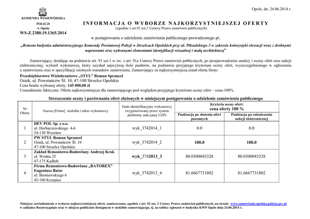 Opole, dn. 24.06.2014 r. KOMENDA WOJEWÓDZKA POLICJI w Opolu INFORMACJA O WYBORZE NAJKORZYSTNIEJSZEJ OFERTY (zgodnie z art.92 ust.2 Ustawy Prawo zamówień publicznych) WS-Z.2380.19.1365.2014 w postępowaniu o udzielenie zamówienia publicznego prowadzonego pt. „Remont budynku administracyjnego Komendy Powiatowej Policji w Strzelcach Opolskich przy ul. Piłsudskiego 3 w zakresie kolorystyki elewacji wraz z drobnymi naprawami oraz wybranymi elementami identyfikacji wizualnej i małą architekturą” Zamawiający, działając na podstawie art. 91 ust.1 w zw. z art. 91a Ustawy Prawo zamówień publicznych, po przeprowadzeniu analizy i oceny ofert oraz aukcji elektronicznej, wyłonił wykonawcę, który uzyskał najwyższą ilość punktów, na podstawie przyjętego kryterium oceny ofert, wyszczególnionego w ogłoszeniu o zamówieniu oraz w specyfikacji istotnych warunków zamówienia. Zamawiający za najkorzystniejszą uznał ofertę firmy: Przedsiębiorstwo Wielobranżowe „STYL” Roman Sprancel Osiek, ul. Powstańców Śl. 10, 47-100 Strzelce Opolskie Cena brutto wybranej oferty: 145 000,00 zł Uzasadnienie faktyczne: Oferta najkorzystniejsza dla zamawiającego pod względem przyjętego kryterium oceny ofert – cena-100%. Streszczenie oceny i porównania ofert złożonych w niniejszym postępowaniu o udzielenie zamówienia publicznego Nr Oferty 1 2 3 4 Nazwa [Firma] siedziba i adres wykonawcy DEV POL Sp. z o.o. ul. Horbaczewskiego 4-6 54-130 Wrocław PW STYL Roman Sprancel Osiek, ul. Powstańców Śl. 10 47-100 Strzelce Opolskie Zakład Remontowo-Budowlany Andrzej Krok ul. Wodna 25 47-175 Kadłub Firma Remontowo-Budowlana „BATOREX” Eugeniusz Bator ul. Broniewskiego 6 42-160 Krzepice Znak identyfikacyjny wykonawcy (wygenerowany przez system platformy aukcyjnej UZP) Kryteria oceny ofert: cena oferty 100 % Punktacja po złożeniu ofert pisemnych Punktacja po zakończeniu aukcji elektronicznej wyk_3742014_1 0.0 0.0 wyk_3742014_2 100.0 100.0 wyk_3742013_3 80.0300043328 80.0300043328 wyk_3742013_4 81.6667731802 81.6667731802 Niniejsze zawiadomienie o wyborze najkorzystniejszej oferty zamieszczono, zgodnie z art. 92 ust. 2 Ustawy Prawo zamówień publicznych, na stronie www.zamowienia.opolska.policja.gov.pl w zakładce Rozstrzygnięte oraz w miejscu publicznie dostępnym w siedzibie zamawiającego, tj. na tablicy ogłoszeń w budynku KWP Opole dnia 24.06.2014 r.