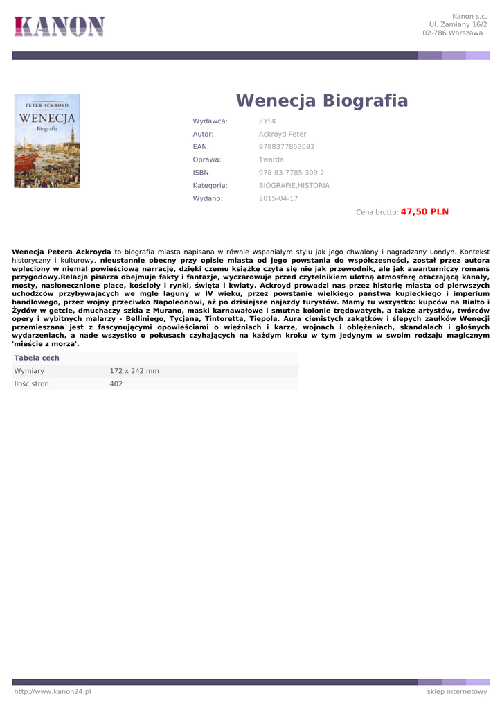 Kanon s.c. Ul. Zamiany 16/2 02-786 Warszawa Wenecja Biografia Wydawca: ZYSK Autor: Ackroyd Peter EAN: 9788377853092 Oprawa: Twarda ISBN: 978-83-7785-309-2 Kategoria: BIOGRAFIE,HISTORIA Wydano: 2015-04-17 Cena brutto: 47,50 PLN Wenecja Petera Ackroyda to biografia miasta napisana w równie wspaniałym stylu jak jego chwalony i nagradzany Londyn. Kontekst historyczny i kulturowy, nieustannie obecny przy opisie miasta od jego powstania do współczesności, został przez autora wpleciony w niemal powieściową narrację, dzięki czemu książkę czyta się nie jak przewodnik, ale jak awanturniczy romans przygodowy.Relacja pisarza obejmuje fakty i fantazje, wyczarowuje przed czytelnikiem ulotną atmosferę otaczającą kanały, mosty, nasłonecznione place, kościoły i rynki, święta i kwiaty. Ackroyd prowadzi nas przez historię miasta od pierwszych uchodźców przybywających we mgle laguny w IV wieku, przez powstanie wielkiego państwa kupieckiego i imperium handlowego, przez wojny przeciwko Napoleonowi, aż po dzisiejsze najazdy turystów. Mamy tu wszystko: kupców na Rialto i Żydów w getcie, dmuchaczy szkła z Murano, maski karnawałowe i smutne kolonie trędowatych, a także artystów, twórców opery i wybitnych malarzy - Belliniego, Tycjana, Tintoretta, Tiepola. Aura cienistych zakątków i ślepych zaułków Wenecji przemieszana jest z fascynującymi opowieściami o więźniach i karze, wojnach i oblężeniach, skandalach i głośnych wydarzeniach, a nade wszystko o pokusach czyhających na każdym kroku w tym jedynym w swoim rodzaju magicznym 'mieście z morza'. Tabela cech Wymiary 172 x 242 mm Ilość stron 402 http://www.kanon24.pl sklep internetowy