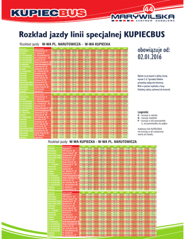 Rozkład jazdy linii specjalnej KUPIECBUS Rozkład jazdy W-WA PL. NARUTOWICZA - W-WA KUPIECKA Nazwa Ulicy Nazwa Ulicy NazwaPrzystanku Przystanku Nazwa S/N/P S/N/P S/N S/N/P S/N S/N/P S/N S/N/P S/N S/N/P S/N S/N/P Narutowicza Grójecka Al. Jerozolimskie Al. Jerozolimskie Al. Jerozolimskie Al. Jerozolimskie Al. Zieleniecka Al. Zieleniecka Targowa Al. Solidarności Szwedzka Szwedzka Odrowąża Odrowąża Wysockiego Piotra Wysockiego Piotra Marywilska Marywilska Kupiecka Pl.Narutowicza 15 Pl. Zawiszy 03 Pl. Starynkiewicza 01 Dw. Centralny 01 NŻ Centrum 05 NŻ Muzeum Narodowe 01 NŻ Rondo Waszyngtona 04 NŻ Zieleniecka 02 NŻ Ząbkowska 02 NŻ Dw. Wileński 06 NŻ Szwedzka 04 NŻ Kowieńska 02 NŻ Rondo Żaba 06 NŻ Pożarowa 02 NŻ Bartniacza 02 NŻ Bazyliańska 03 NŻ Fabrka Pomp 02 NŻ PKP Żerań 02 Kupiecka 01 6:00 6:02 6:03 6:06 6:09 6:12 6:15 6:18 6:21 6:23 6:26 6:28 6:31 6:33 6:35 6:36 6:39 6:42 6:45 07:00 07:02 7:03 07:06 07:09 07:12 07:15 07:18 07:21 07:23 07:26 07:28 07:31 07:33 07:35 07:36 07:39 07:42 07:45 07:30 07:32 7:33 07:37 07:42 07:46 07:51 07:54 07:57 07:59 08:03 08:06 08:09 08:11 08:13 08:14 08:16 08:19 08:22 08:00 08:02 8:03 08:07 08:12 08:16 08:21 08:24 08:27 08:29 08:33 08:36 08:39 08:41 08:43 08:44 08:46 08:49 08:52 08:30 08:32 8:33 08:37 08:42 08:46 08:51 08:54 08:57 08:59 09:03 09:06 09:09 09:11 09:13 09:14 09:16 09:19 09:22 09:00 09:02 9:03 09:07 09:12 09:16 09:21 09:24 09:27 09:29 09:33 09:36 09:39 09:41 09:43 09:44 09:46 09:49 09:52 09:30 09:32 9:33 09:37 09:42 09:46 09:51 09:54 09:57 09:59 10:03 10:06 10:09 10:11 10:13 10:14 10:16 10:19 10:22 10:00 10:02 10:03 10:07 10:12 10:16 10:21 10:24 10:27 10:29 10:33 10:36 10:39 10:41 10:43 10:44 10:46 10:49 10:52 10:30 10:32 10:33 10:37 10:42 10:46 10:51 10:54 10:57 10:59 11:03 11:06 11:09 11:11 11:13 11:14 11:16 11:19 11:22 11:00 11:02 11:03 11:07 11:12 11:16 11:21 11:24 11:27 11:29 11:33 11:36 11:39 11:41 11:43 11:44 11:46 11:49 11:52 11:30 11:32 11:33 11:37 11:42 11:46 11:51 11:54 11:57 11:59 12:03 12:06 12:09 12:11 12:13 12:14 12:16 12:19 12:22 12:00 12:02 12:03 12:07 12:12 12:16 12:21 12:24 12:27 12:29 12:33 12:36 12:39 12:41 12:43 12:44 12:46 12:49 12:52 Nazwa Ulicy Nazwa Przystanku Narutowicza Grójecka Al. Jerozolimskie Al. Jerozolimskie Al. Jerozolimskie Al. Jerozolimskie Al. Zieleniecka Al. Zieleniecka Targowa Al. Solidarności Szwedzka Szwedzka Odrowąża Odrowąża Wysockiego Piotra Wysockiego Piotra Marywilska Marywilska Kupiecka Pl.Narutowicza 15 Pl. Zawiszy 03 Pl. Starynkiewicza 01 Dw. Centralny 01 NŻ Centrum 05 NŻ Muzeum Narodowe 01 NŻ Rondo Waszyngtona 04 NŻ Zieleniecka 02 NŻ Ząbkowska 02 NŻ Dw. Wileński 06 NŻ Szwedzka 04 NŻ Kowieńska 02 NŻ Rondo Żaba 06 NŻ Pożarowa 02 NŻ Bartniacza 02 NŻ Bazyliańska 03 NŻ Fabrka Pomp 02 NŻ PKP Żerań 02 Kupiecka 01 S/N S/N/P S/N S/N/P S/N S/N/P S/N S/N/P S/N S/N/P S/N S/N/P 12:30 12:32 12:33 12:37 12:42 12:46 12:51 12:54 12:57 12:59 13:03 13:06 13:09 13:11 13:13 13:14 13:16 13:19 13:22 13:00 13:02 13:03 13:07 13:12 13:16 13:21 13:24 13:27 13:29 13:33 13:36 13:39 13:41 13:43 13:44 13:46 13:49 13:52 13:30 13:32 13:33 13:37 13:42 13:46 13:51 13:54 13:57 13:59 14:03 14:06 14:09 14:11 14:13 14:14 14:16 14:19 14:22 14:00 14:02 14:03 14:07 14:12 14:16 14:21 14:24 14:27 14:29 14:33 14:36 14:39 14:41 14:43 14:44 14:46 14:49 14:52 14:30 14:32 14:33 14:37 14:42 14:46 14:51 14:54 14:57 14:59 15:03 15:06 15:09 15:11 15:13 15:14 15:16 15:19 15:22 15:00 15:02 15:03 15:07 15:12 15:16 15:21 15:24 15:27 15:29 15:33 15:36 15:39 15:41 15:43 15:44 15:46 15:49 15:52 15:30 15:32 15:33 15:37 15:42 15:46 15:51 15:54 15:57 15:59 16:03 16:06 16:09 16:11 16:13 16:14 16:16 16:19 16:22 16:00 16:02 16:03 16:07 16:12 16:16 16:21 16:24 16:27 16:29 16:33 16:36 16:39 16:41 16:43 16:44 16:46 16:49 16:52 16:30 16:32 16:33 16:37 16:42 16:46 16:51 16:54 16:57 16:59 17:03 17:06 17:09 17:11 17:13 17:14 17:16 17:19 17:22 17:00 17:02 17:03 17:07 17:12 17:16 17:21 17:24 17:27 17:29 17:33 17:36 17:39 17:41 17:43 17:44 17:46 17:49 17:52 17:30 17:32 17:33 17:37 17:42 17:46 17:51 17:54 17:57 17:59 18:03 18:06 18:09 18:11 18:13 18:14 18:16 18:19 18:22 18:00 18:02 18:03 18:07 18:12 18:16 18:21 18:24 18:27 18:29 18:33 18:36 18:39 18:41 18:43 18:44 18:46 18:49 18:52 obowiązuje od: 02.01.2016 Opłata za przejazd w jedną stronę wynosi 2 zł. Sprzedaż biletów prowadzą wyłącznie kierowcy. Bilet w postaci wydruku z kasy fiskalnej należy zachować do kontroli. Legenda: S – kursuje w soboty N – kursuje niedziele P – kursuje w dni powszednie tj. od poniedziałku do piątku Autobusy linii KUPIECBUS nie kursują w dni ustawowo wolne od handlu. Rozkład jazdy W-WA KUPIECKA - W-WA PL. NARUTOWICZA Nazwa NazwaUlicy Ulicy Nazwa NazwaPrzystanku Przystanku S/N/P S/N/P S/N S/N/P S/N S/N/P S/N S/N/P S/N S/N/P S/N S/N/P Kupiecka Marywilska Marywilska Wysockiego Piotra Wysockiego Piotra Odrowąża Odrowąża 11 - Listopada Ratuszowa Inżynierska Targowa Targowa Al. Zieleniecka Al. Jerozolimskie Al. Jerozolimskie Al. Jerozolimskie Al. Jerozolimskie Grójecka Grójecka 14:11 Kupiecka 01 PKP Żerań 01 NŻ Fabrka Pomp 01 NŻ Bazyliańska 01 NŻ Bartniacza 01 NŻ Pożarowa 01 NŻ Rondo Żaba 05 NŻ Bródnowska 01 NŻ Harnasie 01 Inżynierska 01 Dw. Wileński 51 NŻ Zieleniecka 01 NŻ Rondo Waszyngtona 03 NŻ Muzeum Narodowe 02 NŻ Centrum 06 NŻ Dw. Centralny 06 NŻ Pl. Starynkiewicza 02 Pl. Zawiszy 04 Pl. Narutowicza 02 6:45 6:49 6:53 6:56 6:57 6:59 7:01 7:04 7:06 7:08 7:10 7:13 7:16 7:20 7:23 7:25 7:27 7:28 7:30 07:50 07:54 07:58 08:01 08:02 08:04 08:06 08:09 08:11 08:13 08:15 08:18 08:21 08:25 08:28 08:30 08:32 08:33 08:35 08:30 08:34 08:38 08:41 08:42 08:44 08:46 08:49 08:51 08:53 08:55 08:58 09:01 09:05 09:08 09:10 09:12 09:13 09:15 09:00 09:04 09:08 09:11 09:12 09:14 09:16 09:19 09:21 09:23 09:25 09:28 09:31 09:35 09:38 09:40 09:42 09:43 09:45 09:30 09:34 09:38 09:41 09:42 09:44 09:46 09:49 09:51 09:53 09:55 09:58 10:01 10:05 10:08 10:10 10:12 10:13 10:15 10:00 10:04 10:08 10:11 10:12 10:14 10:16 10:19 