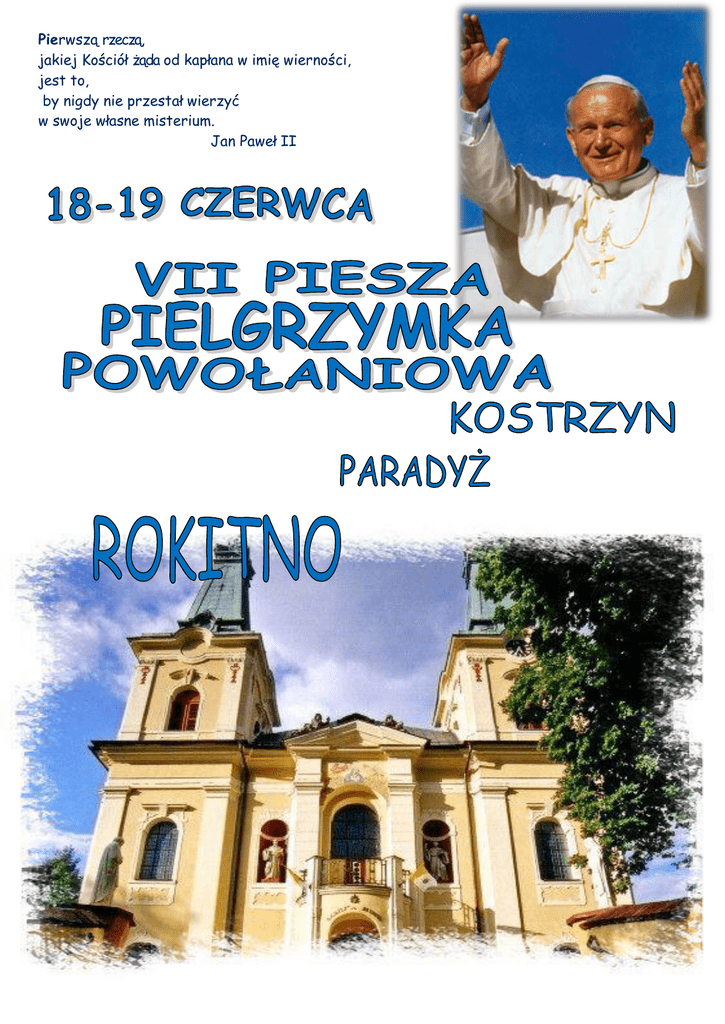 Pierwszą rzeczą, jakiej Kościół żąda od kapłana w imię wierności, jest to, by nigdy nie przestał wierzyć w swoje własne misterium. Jan Paweł II Intencja pielgrzymki: modlitwa o nowe święte powołania kapłańskie i zakonne oraz modlitwa za już powołanych kapłanów i siostry zakonne. W pielgrzymce może wziąć udział każdy, komu na sercu leży sprawa powołań i powołanych ( to nie jest tylko pielgrzymka dla księży, czy kandydatów do seminarium) Co zabrać ze sobą i jak się przygotować: śpiwór i karimatę, w małym, podręcznym plecaku: nakrycie głowy, płaszcz przeciwdeszczowy, środki opatrunkowe, leki osobiste, dokumenty, pieniądze, kubek, łyżkę, strój praktyczny, wygodny i skromny (zasłonięte ramiona i kolana), zalecane leki: bandaż elastyczny, opatrunki z plastrem, wygodne obuwie Koszt pielgrzymki : 50 zł Cena obejmuje: pełne wyżywienie, transport bagażu, autokar do Trzemeszna i z Rokitna do Kostrzyna. Bliższe informacje i zapisy: ks. Robert Tomalka ul. Wyszyńskiego 2/1 Kostrzyn nad Odrą tel. 95-7520501 kom. 667857967 s. Katarzyna ul. Wyszyńskiego 2/2 Kostrzyn nad Odrą tel. 507594311 Trasa pielgrzymki: I DZIEŃ 18.06.2011 KOSTRZYN – PARADYŻ (25 KM) 07.30: zbiórka koło kościoła p.w. NMP Matki Kościoła; zdajemy bagaż i siadamy do autokaru 08.00: wyjazd autokarem do Trzemeszna 09.15: modlitwa w kościele w Trzemesznie na rozpoczęcie pielgrzymki; 09.30: planowane wyjście pieszej pielgrzymki 1 etap: Trzemeszno – Wielowieś ( 9 km) 2 etap: Wielowieś - Zarzyń ( 5 km) posiłek 3 etap: Zarzyń - Staropole ( 5,5 km) 4 etap: Staropole – Paradyż (9 km) Dojście około godz. 18.00 19.00: posiłek 20.30: msza w kościele seminaryjnym zakończona apelem 22.00: cisza nocna II DZIEŃ 19.06.2011 PARADYŻ – ROKITNO (29,5 KM) Wyjście o godz. 7:00 1 etap: Paradyż – Sosnówka (8,km) 2 etap: Sosnówka – Kuźnik (4,5 km) obiad 3 etap: Kuźnik – Żółwin (5,5 km) 4 etap: Żółwin – Kalsko (6 km) 5 etap: Kalsko – Rokitno (5,5 km) Dojście około godz. 17.00 18:00 UROCZYSTA MSZA ŚWIĘTA Po mszy powrót do Kostrzyna