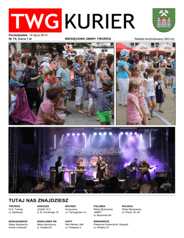TWG KURIER Poniedziałek, 14 lipca 2014 Nr 74, Cena 1 zł MIESIĘCZNIK GMINY TWORÓG Nakład kontrolowany 500 szt. TUTAJ NAS ZNAJDZIESZ TWORÓG G.S. Tworóg ul. Zamkowa HANUSEK „Dżelfa” S.C. ul. B. Chrobrego 16 BRYNEK Husqvarna ul. Tarnogórska 7a POŁOMIA Sklep Spożywczy „MART” ul. Bytomska 64 WOJSKA Sklep Spożywczy ul. Powst. Śl. 64 BORUSZOWICE Sklep Spożywczy Aniela Lukoszek NOWA WIEŚ TW. Sklep Spożywczy ul. Wiejska 61 KOTY Mini Market „Mix” ul. Potępska 2 ŚWINIOWICE Piekarnia-Cukiernia M. Szyguła ul. Wiejska 27 TWG KURIER WSTĘPNIAK OD REDAKCJI SPIS TREŚCI DRODZY MIESZKAŃCY, TABLICA………………………………………………….str.3 POD LUPĄ……………………………………………….str.4 – Gmina Tworóg lasem i chlebem pachnąca HOBBYSTA……………………………………………...str.6 – Kostkomaniacy KULTURALNIE………………………………….………str.7 – Bookcrossing w Tworogu – Spotkanie z Afryką w Wojsce – Spacer po Kraju Kwitnącej Wiśni – Program regionalny w przedszkolu – Koncertowy piątek – Dzieci listy piszą – Stowarzyszenie na Rzecz Rozwoju Gminy Tworóg informuje – Autobus na wakacje – Plac im. ks. Hoschecka – VI Dni Tworoga – Uwaga remont! – Historia Boruszowca NA BIEŻĄCO………………………………….……….str.12 – Przedsiębiorczy potencjał – Razem na zawsze – Młodzi zdolni – Konkurs biblijny – dziesiąta edycja – Trafić do celu – Podsumowanie roku szkolnego w Wojsce – Podsumowanie roku szkolnego w SP w Tworogu – Była piaskowa, jest asfaltowa – Jak wakacje to „Brzeźnica”! – Odpady komunalne – terminy na drugie półrocze 2014 r. – PSZOK – sposób na śmieci w wakacyjnym wydaniu „TWG Kuriera” poznacie nazwiska młodych i zdolnych, czyli gimnazjalistów z najwyższymi średnimi. Bohaterami tego numeru są również seniorzy, którzy w czerwcu obchodzili złote i diamentowe gody. O mieszkańcach gminy piszemy w dziale „Na bieżąco”. Naszym lokalnym produktem eksportowym z pewnością może być chleb. Zdaniem wójta pieczywo z gminnych piekarń zasługuje na najwyższą ocenę. Jest znane i cenione na terenie całego Śląska. Kto i jak produkuje smaczne chleby? „Pod lupę” bierzemy trzy piekarnie z terenu gminy. Piszemy również o VI Dniach Tworoga. W tym roku bawiliśmy się na placu za tworoskim zamkiem. Zakończenie rewitalizacji budynku było jednym z powodów świętowania. Ponadto podsumowujemy rok szkolny, poznajemy tajemnice kostki Rubika i przypominamy o atrakcjach jakie czekają na terenie „Brzeźnicy”. Życzymy udanych wakacji. Do zobaczenia we wrześniu! Zapraszamy do lektury! www.twg-kurier.pl [email protected] REDAKCJA redaktor naczelna: Marta Kobędza-Krain dziennikarze: Grażyna Chmiel Agata Frączek Ewa Jaruszowic KREACJA Łukasz Krain MECENAT Grażyna Chmiel – dyrektor Gminnego Ośrodka Kultury GOŚCINNIE Teresa Adamczyk, Karolina Gatys, Grażyna Nierychło, Hanna Pawełczyk, Kornelia Sobel, Jolanta Winkler WYDAWCA Gminny Ośrodek Kultury w Tworogu, ul. Zamkowa 1, 42-690 Tworóg, tel. (32) 285 74 92 DRUK Foto&druk Damian Zymela Redakcja zastrzega sobie prawo do redagowania i skracania tekstów przesyłanych do druku. 2 TWG KURIER TABLICA R KANALIZACJA W BRYNKU E K L A M A Budowa kanalizacji w Brynku jest już prawie zakończona. Trwają prace odbiorowe inwestycji wykonanej przy wsparciu środków unijnych z PROW. Fundusze pozyskał Zakład Usług Komunalnych w Tworogu przy współpracy z Urzędem Gminy. ZUK informuje, że 48 posesji ma możliwość podłączenia do nowo wybudowanej kanalizacji sanitarnej. W przypadku samodzielnego wykonania przyłącza kanalizacyjnego, należy poinformować ZUK o podłączeniu przed zasypaniem ułożonych rur kanalizacyjnych ze względu na konieczność dokonania odbioru technicznego. Wszelkie pytania należy kierować pod nr tel.: 32 285 73 67 (oczyszczalnia ścieków) lub 381 00 50 i 284 67 93 (biuro). RADIOWY ODCZYT LICZNIKÓW Zakład Usług Komunalnych w Tworogu wprowadził system zdalnego odczytu liczników wody. Nowoczesne rozwiązanie umożliwi nie tylko szybkie, ale i dokładne odczytanie zużycia przez inkasenta, który może dokonać odczytu jadąc samochodem. ZUK ma 4 lata na założenie nakładek do radiowego odczytu na wodomierze u wszystkich odbiorców. Jednak już dziś każdy odbiorca wody ma możliwość założenia konta do elektronicznego biura obsługi klienta (EBOK). Za pośrednictwem nowoczesnego rozwiązania bez wychodzenia z domu można dokonać płatności. Konto daje możliwość m.in. podania odczytu wodomierza, wzglądu do faktur, aktualnych cen wody i ścieków, dokonania płatności, analiz i zestawień. – Coraz więcej instytucji korzysta z tego rozwiązania. Jest wygodne i sprawne – mówi Adam Chmiel, prezes ZUK. ŚWIĘTO PIECZENIA CHLEBA Aby założyć konto należy zgłosić się do Zakładu Usług Komunalnych celem wypełnienia formularza akceptacji korespondencji elektronicznej. Formularz można również pobrać ze strony internetowej zakładu. Pod patronatem Piekarni-Cukierni Małgorzaty Szyguła PODZIĘKOWANIE 19 lipca w Świniowicach Niniejszym pismem, jako Rodzice Filipa Szeląga, pragniemy serdecznie podziękować Zastępcy Wójta Gminy Tworóg Panu Klaudiuszowi Wieder za inicjatywę, którą podjął by nagrodzić wyniki sportowe naszego syna. Na Pana ręce składamy również podziękowania dla Wójta Gminy Pana Eugeniusza Gwóźdź oraz Rady Gminy Tworóg za poparcie i ufundowanie nagrody. Program: • • • Wyróżnienie to ma tym większe znaczenie, ponieważ łucznictwo jest w naszym kraju sportem niszowym, lecz ostatnimi czasy coraz więcej osób interesuje się tą dyscypliną. • Nagroda, którą syn od Państwa otrzymał dopinguje go do dalszych treningów, czego skutkiem będą kolejne sukcesy, czego Państwu i sobie życzymy. godz. 14 – pieczenie chleba w wiejskim „piekarnioku” godz