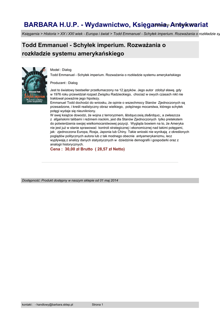 Utworzono Antykwariat : 07 marzec 2017 BARBARA H.U.P. - Wydawnictwo, Księgarnia, Księgarnia > Historia > XX i XXI wiek - Europa i świat > Todd Emmanuel - Schyłek imperium. Rozważania o rozkładzie sy Todd Emmanuel - Schyłek imperium. Rozważania o rozkładzie systemu amerykańskiego Model : Dialog Todd Emmanuel - Schyłek imperium. Rozważania o rozkładzie systemu amerykańskiego Producent : Dialog Jest to światowy bestseller przetłumaczony na 12 języków. Jego autor zdobył sławę, gdy w 1976 roku przewidział rozpad Związku Radzieckiego, chociaż w owych czasach nikt nie traktował poważnie jego hipotezy. Emmanuel Todd dochodzi do wniosku, że opinie o wszechmocy Stanów Zjednoczonych są przesadzone, i kreśli realistyczny obraz wielkiego, potężnego mocarstwa, którego schyłek potęgi wydaje się nieunikniony. W swej książce dowodzi, że wojna z terroryzmem, „osią zła”, a zwłaszcza z afgańskimi talibami i reżimem irackim, jest dla Stanów Zjednoczonych tylko pretekstem do potwierdzenia swojej wielkomocarstwowej pozycji. Wygląda bowiem na to, że Ameryka nie jest już w stanie sprawować kontroli strategicznej i ekonomicznej nad takimi potęgami, jak: zjednoczona Europa, Rosja, Japonia lub Chiny. Takie wnioski nie wynikają z określonych poglądów politycznych autora lub z tak modnego obecnie antyamerykanizmu, lecz wypływają z analizy danych statystycznych w dziedzinie demografii i gospodarki oraz z analogii historycznych. Cena : 30,00 zł Brutto ( 28,57 zł Netto) Dostępność: Produkt dostępny w naszym sklepie od 01 maj 2014 kontakt : - [email protected] Strona 1