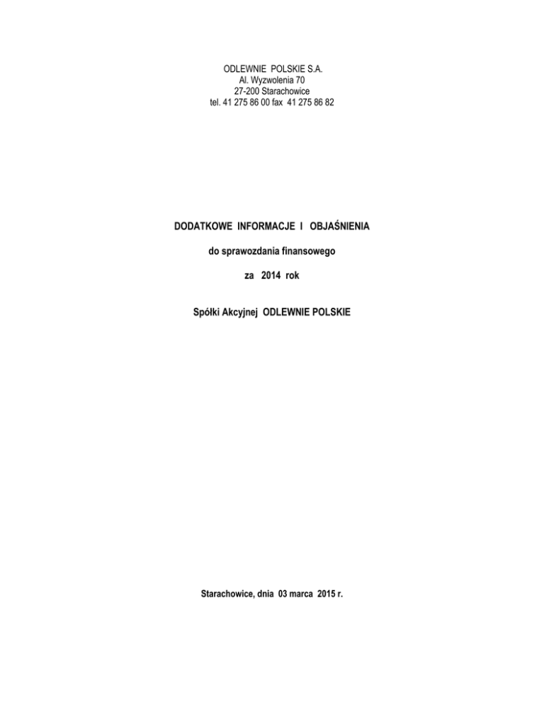 ODLEWNIE POLSKIE S.A. Al. Wyzwolenia 70 27-200 Starachowice tel. 41 275 86 00 fax 41 275 86 82 DODATKOWE INFORMACJE I OBJAŚNIENIA do sprawozdania finansowego za 2014 rok Spółki Akcyjnej ODLEWNIE POLSKIE Starachowice, dnia 03 marca 2015 r. Spółka Akcyjna ODLEWNIE POLSKIE z siedzibą w Starachowicach SPIS TREŚCI I. Objaśnienia do bilansu ................................................................................................................................ 4 1. Szczegółowy zakres zmian wartości grup rodzajowych środków trwałych, wartości niematerialnych i prawnych oraz inwestycji długoterminowych ................................................... 4 2. Wartość gruntów użytkowanych wieczyście ................................................................................ 6 3. Wartość nieamortyzowanych lub nieumarzanych środków trwałych ........................................... 6 4. Odpisy aktualizujące środki trwałe ............................................................................................... 7 5. Zobowiązania wobec budżetu państwa lub jednostek samorządu terytorialnego z tytułu uzyskania prawa własności budynków i budowli.......................................................................... 7 6. Struktura własności kapitału podstawowego oraz liczba i wartość nominalna akcji .................... 7 7. Zmiana kapitałów zapasowych i rezerwowych............................................................................. 7 8. Propozycja sposobu podziału zysku lub pokrycia straty za rok obrotowy ................................... 7 9. Zmiana stanu rezerw na zobowiązania i rozliczeń międzyokresowych ....................................... 8 10. Odpisy aktualizujące z tytułu utraty wartości aktywów finansowych i wartości należności oraz odwróceniu takich odpisów .......................................................................................................... 9 11. Informacje o odpisach aktualizujących wartość zapasów do wartości netto możliwej do uzyskania i odwróceniu odpisów z tego tytułu ........................................................................... 10 12. Podział zobowiązań długoterminowych ..................................................................................... 10 13. Wykaz grup zobowiązań zabezpieczonych na majątku Spółki .................................................. 11 14. Zobowiązania warunkowe .......................................................................................................... 12 15. Aktywa warunkowe ..................................................................................................................... 12 II. Objaśnienia do rachunku zysków i strat .................................................................................................... 13 1. Struktura rzeczowa i terytorialna przychodów netto ze sprzedaży produktów, towarów i materiałów i pozostałych przychodów operacyjnych i finansowych ........................................... 13 2. Przychody, koszty i wyniki działalności zaniechanej .................................................................. 13 3. Rozliczenie głównych pozycji różniących podstawę opodatkowania podatkiem dochodowym od wyniku finansowego ................................................................................................................... 14 4. Koszty wytworzenia produktów na własne potrzeby i koszty rodzajowe ................................... 15 5. Koszt wytworzenia środków trwałych w budowie i oddanych do użytkowania ......................... 15 6. Poniesione i planowane na następny rok nakłady na niefinansowe aktywa trwałe, w tym nakłady na ochronę środowiska ................................................................................................. 16 7. Informacje o zyskach i stratach nadzwyczajnych .................................................................... 16 8. Podatek dochodowy od wyniku na operacjach nadzwyczajnych ............................................... 17 III. Kursy przyjęte do wyceny pozycji bilansu i rachunku zysków i strat wyrażonych w walutach obcych ....... 17 IV. Objaśnienia do instrumentów finansowych ................................................................................................ 17 V. Objaśnienie struktury środków pieniężnych przyjętych do rachunku przepływów pieniężnych ................. 17 VI. Objaśnienia do zawartych przez jednostkę umów, istotnych transakcji i niektórych zagadnień osobowych ................................................................................................................................................................... 18 1. Charakter i cel gospodarczy zawartych przez Spółkę umów nieuwzględnionych w bilansie .... 18 Dodatkowe informacje i objaśnienia do sprawozdania finansowego za 2014 r. 2 Spółka Akcyjna ODLEWNIE POLSKIE z siedzibą w Starachowicach 2. Istotne transakcje zawarte przez Spółkę na innych zasadach niż rynkowe ze stronami powiązanymi ............................................................................................................................... 18 3. Przeciętne zatrudnienie w roku obrotowym ............................................................................... 19 4. Wynagrodzenia osób wchodzących w skład organów zarządzających i nadzorujących za rok obrotowy ..................................................................................................................................... 19 5. Pożyczki i świadczenia o podobnym charakterze udzielone osobom wchodzącym w skład organów zarządzających i nadzorujących oraz jednostkom powiązanym ................................. 19 6. Wynagrodzenie biegłego rewidenta za rok obrotowy ................................................................ 19 7. Znaczące zdarzenia dotyczące lat ubiegłych uj