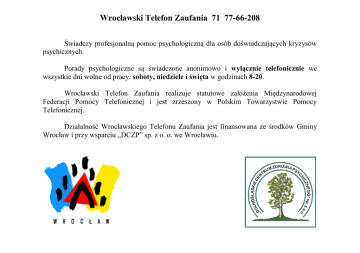 Wrocławski Telefon Zaufania 71 77-66-208 Świadczy profesjonalną pomoc psychologiczną dla osób doświadczających kryzysów psychicznych. Porady psychologiczne są świadczone anonimowo i wyłącznie telefonicznie we wszystkie dni wolne od pracy: soboty, niedziele i święta w godzinach 8-20. Wrocławski Telefon Zaufania realizuje statutowe założenia Międzynarodowej Federacji Pomocy Telefonicznej i jest zrzeszony w Polskim Towarzystwie Pomocy Telefonicznej. Działalność Wrocławskiego Telefonu Zaufania jest finansowana ze środków Gminy Wrocław i przy wsparciu „DCZP” sp. z o. o. we Wrocławiu.