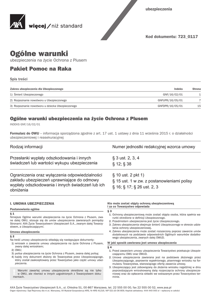 ubezpieczenia Kod dokumentu: 723_0117 Ogólne warunki ubezpieczenia na życie Ochrona z Plusem Pakiet Pomoc na Raka Spis treści Zakres ubezpieczenia dla Ubezpieczonego Indeks Strona GNF/16/02/01 1 2) Rozpoznanie nowotworu u Ubezpieczonego GNFUPR/16/05/01 7 3) Rozpoznanie nowotworu u dziecka Ubezpieczonego GNFDPR/16/05/01 15 1) Śmierć Ubezpieczonego Ogólne warunki ubezpieczenia na życie Ochrona z Plusem INDEKS GNF/16/02/01 Formularz do OWU – informacja sporządzona zgodnie z art. 17 ust. 1 ustawy z dnia 11 września 2015 r. o działalności ubezpieczeniowej i reasekuracyjnej Rodzaj informacji Numer jednostki redakcyjnej wzorca umowy Przesłanki wypłaty odszkodowania i innych świadczeń lub wartości wykupu ubezpieczenia § 3 ust. 2, 3, 4 § 12; § 38 Ograniczenia oraz wyłączenia odpowiedzialności zakładu ubezpieczeń uprawniające do odmowy wypłaty odszkodowania i innych świadczeń lub ich obniżenia § 10 ust. 2 pkt 1) § 15 ust. 1 w zw. z postanowieniami polisy § 16; § 17; § 26 ust. 2, 3 I. UMOWA UBEZPIECZENIA Postanowienia ogólne §1 Niniejsze Ogólne warunki ubezpieczenia na życie Ochrona z Plusem, zwane dalej OWU, stosuje się do umów ubezpieczenia zawieranych pomiędzy Stronami: AXA Życie Towarzystwem Ubezpieczeń S.A., zwanym dalej Towarzystwem, a Ubezpieczającymi. Umowa ubezpieczenia §2 Na treść umowy ubezpieczenia składają się następujące dokumenty: 1)wniosek o zawarcie umowy ubezpieczenia na życie Ochrona z Plusem, zwany dalej wnioskiem; 2)OWU; 3)polisa ubezpieczenia na życie Ochrona z Plusem, zwana dalej polisą; 4)każdy inny dokument złożony do Towarzystwa przez Ubezpieczającego, który został zaakceptowany przez Towarzystwo jako część umowy ubez pieczenia. ! Warunki zawartej umowy ubezpieczenia określone są nie tylko w OWU, ale również w innych uzgodnionych z Towarzystwem dokumentach. Kto może zostać objęty ochroną ubezpieczeniową i za co Towarzystwo odpowiada §3 1.Ochroną ubezpieczeniową może zostać objęta osoba, która spełnia warunki określone w definicji Ubezpieczonego. 2.Przedmiotem ubezpieczenia jest życie Ubezpieczonego. 3.Zakres ubezpieczenia obejmuje śmierć Ubezpieczonego w okresie udzielania ochrony ubezpieczeniowej. 4.Zakres ubezpieczenia może zostać rozszerzony poprzez zawarcie umów dodatkowych na podstawie odpowiednich Ogólnych warunków dodatkowego ubezpieczenia, zwanych dalej OWUD. W jaki sposób zawierana jest umowa ubezpieczenia §4 1.Przed zawarciem umowy ubezpieczenia Towarzystwo przekazuje Ubezpie czającemu OWU oraz OWUD. 2.Umowa ubezpieczenia zawierana jest na podstawie złożonego przez Ubezpieczającego, poprawnie wypełnionego, pisemnego wniosku na formularzu Towarzystwa, stanowiącego ofertę zawarcia umowy. 3.Ubezpieczający jest zobowiązany do złożenia wniosku najpóźniej w dniu poprzedzającym wnioskowaną datę rozpoczęcia ochrony ubezpieczeniowej oraz do opłacenia składki we wskazanym przez Towarzystwo terminie. AXA Życie Towarzystwo Ubezpieczeń S.A., ul. Chłodna 51, 00-867 Warszawa, tel. 22 555 00 00, fax 22 555 00 52, www.axa.pl Organ rejestrowy: Sąd Rejonowy dla m.st. Warszawy, XII Wydział Gospodarczy KRS, Nr KRS 41216, NIP 521-10-36-859, Kapitał zakładowy: 444 440 000 zł – wpłacony w całości ! Podstawą zawarcia umowy ubezpieczenia jest poprawnie wypełniony wniosek. 4.Jeżeli wniosek został wypełniony nieprawidłowo lub jest niekompletny, Ubezpieczający jest zobowiązany do uzupełnienia wniosku bądź do sporządzenia nowego wniosku w terminie określonym przez Towarzystwo. 5.Towarzystwo może nie zaakceptować wniosku i odmówić zawarcia umo wy ubezpieczenia. 6.Towarzystwo zastrzega sobie prawo do dalszej oceny ryzyka ubezpieczeniowego. 7.W przypadku akceptacji wniosku Towarzystwo wystawia polisę, w której potwierdzona zostaje data początku ochrony ubezpieczeniowej i przekazuje ją Ubezpieczającemu. ! Towarzystwo może poprosić Ubezpieczającego o uzupełnienie wniosku oraz, z uwagi na zawarte w nim informacje, dodatkowo zweryfikować ryzyko ubezpieczeniowe. Wniosek może zostać niezaakceptowany przez Towarzystwo. Towarzystwo potwierdza zawarcie umowy ubezpieczenia polisą. Od kiedy jest świadczona ochrona względem Ubezpieczonego §5 1.Ochrona ubezpieczeniowa rozpoczyna się po łącznym spełnieniu następujących warunków: 1) została opłacona składka w należnej wysokości; 2) został przekazany do Towarzystwa poprawnie wypełniony wniosek; 3) została dokonana ocena ryzyka ubezpieczeniowego względem Ubez pieczonego. 2.Początek ochrony ubezpieczeniowej potwierdzony jest w polisie. ! Początek ochrony rozpoczyna się od pierwszego dnia wskazanego w polisie, pod warunkiem że najpóźniej w dniu poprzedzającym początek ochrony ubezpieczeniowej zostanie opłacona składka oraz zostaną spełnione pozostałe warunki, o których jest mowa powyżej. Jak przebiega i na czym polega ocena ryzyka ubezpieczeniowego §6 1.Towarzystwo zastrzega sobie prawo do oceny ryzyka ubezpieczeniowego, w tym żądania: 1) udzielenia informacji o stanie zdrowia w zakresie zawartym we wniosku oraz ankiecie medycznej; 2) dostarczenia dodatkowych dokumentów dotyczących stanu zdrowia; 3) skierowania na badania medyczne, z wyłączeniem badań genetycznych. Koszty badań medycznych pokrywane są przez Towarzystwo. 2.Po dokonaniu oceny ryzyka ubezpieczeniowego Towarzystwo zastrzega sobie prawo do: 1) odmowy objęcia ochroną ubezpieczeniową; 2) określenia daty, od której ochrona ubezpieczeniowa może być świadczona; 3) określenia warunków objęcia ochroną ubezpieczeniową, tj. zaproponowania zmiany zakresu ubezpieczenia, podwyższenia składki, obniżenia sumy ubezpieczenia w ramach umowy podstawowej lub poszczególnych umów dodatkowych. Na jaki czas zawierana jest umowa ubezpieczenia i w jaki sposób ulega przedłużeniu §7 1.Umowa ubezpieczenia zawierana jest na okres 1 roku, licząc od daty początku ochrony ubezpieczeniowej określonej w polisie. 2.