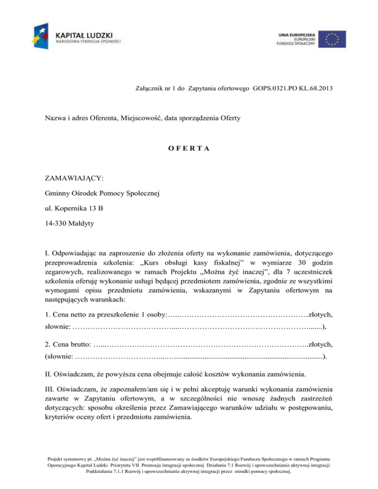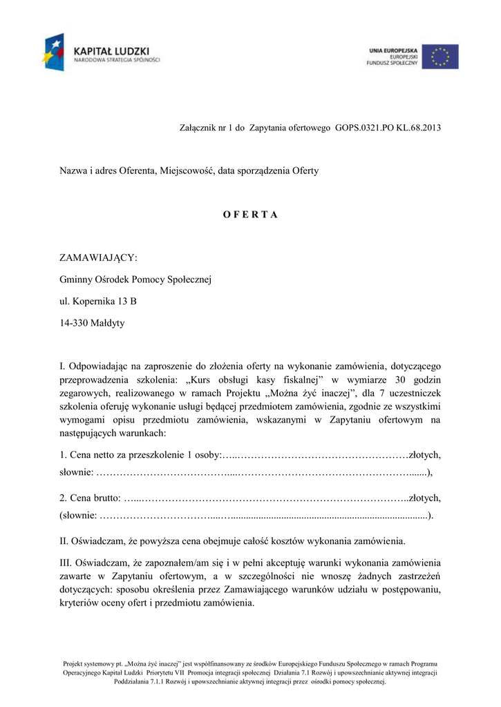 Załącznik nr 1 do Zapytania ofertowego GOPS.0321.PO KL.68.2013 Nazwa i adres Oferenta, Miejscowość, data sporządzenia Oferty OFERTA ZAMAWIAJĄCY: Gminny Ośrodek Pomocy Społecznej ul. Kopernika 13 B 14-330 Małdyty I. Odpowiadając na zaproszenie do złożenia oferty na wykonanie zamówienia, dotyczącego przeprowadzenia szkolenia: „Kurs obsługi kasy fiskalnej” w wymiarze 30 godzin zegarowych, realizowanego w ramach Projektu „Można żyć inaczej”, dla 7 uczestniczek szkolenia oferuję wykonanie usługi będącej przedmiotem zamówienia, zgodnie ze wszystkimi wymogami opisu przedmiotu zamówienia, wskazanymi w Zapytaniu ofertowym na następujących warunkach: 1. Cena netto za przeszkolenie 1 osoby:…..……………………………………………złotych, słownie: …………………………………....…………………………………………….......), 2. Cena brutto: …...……………………………………………………………………..złotych, (słownie: ……………………………....…..............................................................................). II. Oświadczam, że powyższa cena obejmuje całość kosztów wykonania zamówienia. III. Oświadczam, że zapoznałem/am się i w pełni akceptuję warunki wykonania zamówienia zawarte w Zapytaniu ofertowym, a w szczególności nie wnoszę żadnych zastrzeżeń dotyczących: sposobu określenia przez Zamawiającego warunków udziału w postępowaniu, kryteriów oceny ofert i przedmiotu zamówienia. Projekt systemowy pt. „Można żyć inaczej” jest współfinansowany ze środków Europejskiego Funduszu Społecznego w ramach Programu Operacyjnego Kapitał Ludzki Priorytetu VII Promocja integracji społecznej Działania 7.1 Rozwój i upowszechnianie aktywnej integracji Poddziałania 7.1.1 Rozwój i upowszechnianie aktywnej integracji przez ośrodki pomocy społecznej. IV. Zobowiązuję się w przypadku przyjęcia mojej oferty, do zawarcia umowy na warunkach opisanych w Zapytaniu ofertowym, w miejscu i terminie wskazanym przez Zamawiającego. V. Oświadczam, iż dysponuję wszelkimi środkami i zasobami umożliwiającymi samodzielne wykonanie przedmiotu zamówienia. VI. Integralną część oferty stanowią następujące dokumenty: 1) ................................................................................. 2) ................................................................................. 3) ................................................................................. 4)................................................................................. Pieczątka Oferenta, Podpis(y) upoważnionych przedstawicieli Oferenta Projekt systemowy pt. „Można żyć inaczej” jest współfinansowany ze środków Europejskiego Funduszu Społecznego w ramach Programu Operacyjnego Kapitał Ludzki Priorytetu VII Promocja integracji społecznej Działania 7.1 Rozwój i upowszechnianie aktywnej integracji Poddziałania 7.1.1 Rozwój i upowszechnianie aktywnej integracji przez ośrodki pomocy społecznej.