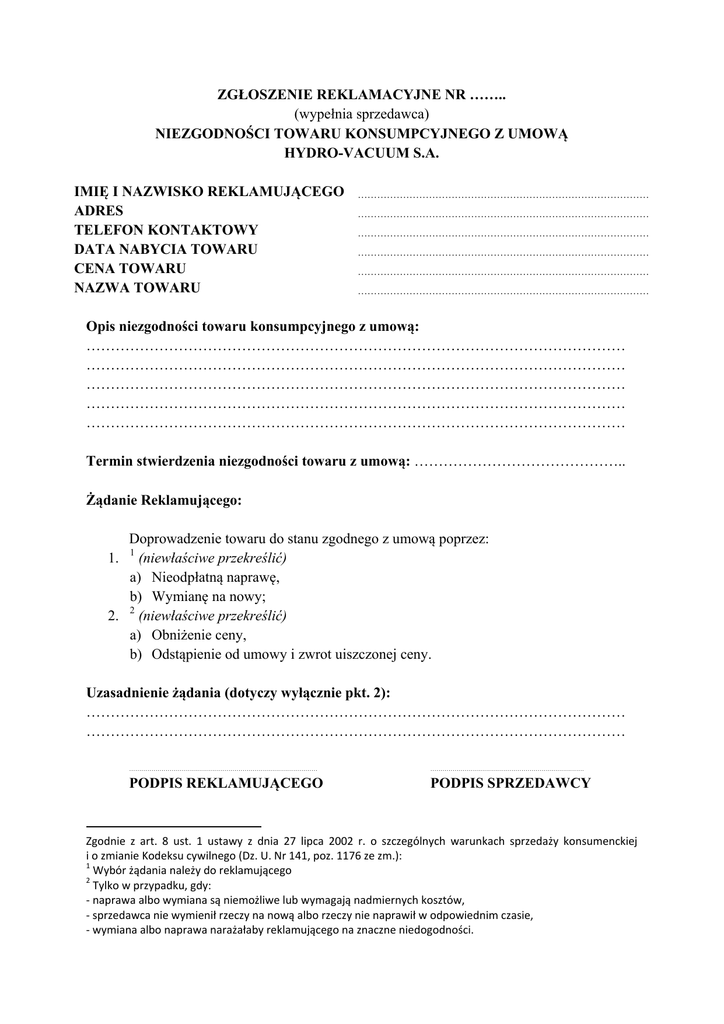 ZGŁOSZENIE REKLAMACYJNE NR …….. (wypełnia sprzedawca) NIEZGODNOŚCI TOWARU KONSUMPCYJNEGO Z UMOWĄ HYDRO-VACUUM S.A. IMIĘ I NAZWISKO REKLAMUJĄCEGO ADRES TELEFON KONTAKTOWY DATA NABYCIA TOWARU CENA TOWARU NAZWA TOWARU ……………………………………………………………………………… ……………………………………………………………………………… ……………………………………………………………………………… ……………………………………………………………………………… ……………………………………………………………………………… ……………………………………………………………………………… Opis niezgodności towaru konsumpcyjnego z umową: ………………………………………………………………………………………………… ………………………………………………………………………………………………… ………………………………………………………………………………………………… ………………………………………………………………………………………………… ………………………………………………………………………………………………… Termin stwierdzenia niezgodności towaru z umową: …………………………………….. Żądanie Reklamującego: Doprowadzenie towaru do stanu zgodnego z umową poprzez: 1. 1 (niewłaściwe przekreślić) a) Nieodpłatną naprawę, b) Wymianę na nowy; 2 2. (niewłaściwe przekreślić) a) Obniżenie ceny, b) Odstąpienie od umowy i zwrot uiszczonej ceny. Uzasadnienie żądania (dotyczy wyłącznie pkt. 2): ………………………………………………………………………………………………… ………………………………………………………………………………………………… ………………………………………………………………………………… …………………………………………………………………. PODPIS REKLAMUJĄCEGO PODPIS SPRZEDAWCY Zgodnie z art. 8 ust. 1 ustawy z dnia 27 lipca 2002 r. o szczególnych warunkach sprzedaży konsumenckiej i o zmianie Kodeksu cywilnego (Dz. U. Nr 141, poz. 1176 ze zm.): 1 Wybór żądania należy do reklamującego 2 Tylko w przypadku, gdy: ‐ naprawa albo wymiana są niemożliwe lub wymagają nadmiernych kosztów, ‐ sprzedawca nie wymienił rzeczy na nową albo rzeczy nie naprawił w odpowiednim czasie, ‐ wymiana albo naprawa narażałaby reklamującego na znaczne niedogodności.