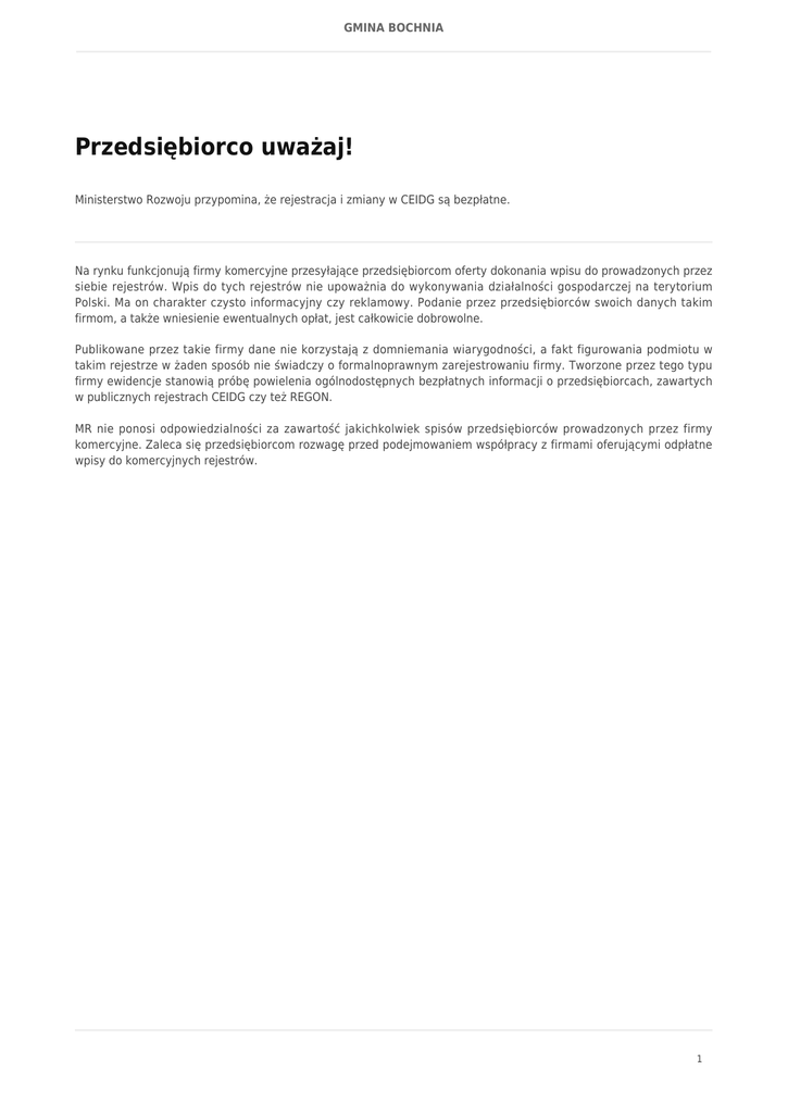 GMINA BOCHNIA Przedsiębiorco uważaj! Ministerstwo Rozwoju przypomina, że rejestracja i zmiany w CEIDG są bezpłatne. Na rynku funkcjonują firmy komercyjne przesyłające przedsiębiorcom oferty dokonania wpisu do prowadzonych przez siebie rejestrów. Wpis do tych rejestrów nie upoważnia do wykonywania działalności gospodarczej na terytorium Polski. Ma on charakter czysto informacyjny czy reklamowy. Podanie przez przedsiębiorców swoich danych takim firmom, a także wniesienie ewentualnych opłat, jest całkowicie dobrowolne. Publikowane przez takie firmy dane nie korzystają z domniemania wiarygodności, a fakt figurowania podmiotu w takim rejestrze w żaden sposób nie świadczy o formalnoprawnym zarejestrowaniu firmy. Tworzone przez tego typu firmy ewidencje stanowią próbę powielenia ogólnodostępnych bezpłatnych informacji o przedsiębiorcach, zawartych w publicznych rejestrach CEIDG czy też REGON. MR nie ponosi odpowiedzialności za zawartość jakichkolwiek spisów przedsiębiorców prowadzonych przez firmy komercyjne. Zaleca się przedsiębiorcom rozwagę przed podejmowaniem współpracy z firmami oferującymi odpłatne wpisy do komercyjnych rejestrów. 1
