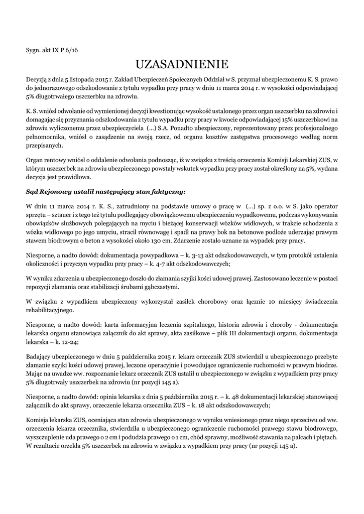 Sygn. akt IX P 6/16 UZASADNIENIE Decyzją z dnia 5 listopada 2015 r. Zakład Ubezpieczeń Społecznych Oddział w S. przyznał ubezpieczonemu K. S. prawo do jednorazowego odszkodowanie z tytułu wypadku przy pracy w dniu 11 marca 2014 r. w wysokości odpowiadającej 5% długotrwałego uszczerbku na zdrowiu. K. S. wniósł odwołanie od wymienionej decyzji kwestionując wysokość ustalonego przez organ uszczerbku na zdrowiu i domagając się przyznania odszkodowania z tytułu wypadku przy pracy w kwocie odpowiadającej 15% uszczerbkowi na zdrowiu wyliczonemu przez ubezpieczyciela (...) S.A. Ponadto ubezpieczony, reprezentowany przez profesjonalnego pełnomocnika, wniósł o zasądzenie na swoją rzecz, od organu kosztów zastępstwa procesowego według norm przepisanych. Organ rentowy wniósł o oddalenie odwołania podnosząc, iż w związku z treścią orzeczenia Komisji Lekarskiej ZUS, w którym uszczerbek na zdrowiu ubezpieczonego powstały wskutek wypadku przy pracy został określony na 5%, wydana decyzja jest prawidłowa. Sąd Rejonowy ustalił następujący stan faktyczny: W dniu 11 marca 2014 r. K. S., zatrudniony na podstawie umowy o pracę w (...) sp. z o.o. w S. jako operator sprzętu – sztauer i z tego też tytułu podlegający obowiązkowemu ubezpieczeniu wypadkowemu, podczas wykonywania obowiązków służbowych polegających na myciu i bieżącej konserwacji wózków widłowych, w trakcie schodzenia z wózka widłowego po jego umyciu, stracił równowagę i spadł na prawy bok na betonowe podłoże uderzając prawym stawem biodrowym o beton z wysokości około 130 cm. Zdarzenie zostało uznane za wypadek przy pracy. Niesporne, a nadto dowód: dokumentacja powypadkowa – k. 3-13 akt odszkodowawczych, w tym protokół ustalenia okoliczności i przyczyn wypadku przy pracy – k. 4-7 akt odszkodowawczych; W wyniku zdarzenia u ubezpieczonego doszło do złamania szyjki kości udowej prawej. Zastosowano leczenie w postaci repozycji złamania oraz stabilizacji śrubami gąbczastymi. W związku z wypadkiem ubezpieczony wykorzystał zasiłek chorobowy oraz łącznie 10 miesięcy świadczenia rehabilitacyjnego. Niesporne, a nadto dowód: karta informacyjna leczenia szpitalnego, historia zdrowia i choroby - dokumentacja lekarska organu stanowiąca załącznik do akt sprawy, akta zasiłkowe – plik III dokumentacji organu, dokumentacja lekarska – k. 12-24; Badający ubezpieczonego w dniu 5 października 2015 r. lekarz orzecznik ZUS stwierdził u ubezpieczonego przebyte złamanie szyjki kości udowej prawej, leczone operacyjnie i powodujące ograniczenie ruchomości w prawym biodrze. Mając na uwadze ww. rozpoznanie lekarz orzecznik ZUS ustalił u ubezpieczonego w związku z wypadkiem przy pracy 5% długotrwały uszczerbek na zdrowiu (nr pozycji 145 a). Niesporne, a nadto dowód: opinia lekarska z dnia 5 października 2015 r. – k. 48 dokumentacji lekarskiej stanowiącej załącznik do akt sprawy, orzeczenie lekarza orzecznika ZUS – k. 18 akt odszkodowawczych; Komisja lekarska ZUS, oceniająca stan zdrowia ubezpieczonego w wyniku wniesionego przez niego sprzeciwu od ww. orzeczenia lekarza orzecznika, stwierdziła u ubezpieczonego ograniczenie ruchomości prawego stawu biodrowego, wyszczuplenie uda prawego o 2 cm i podudzia prawego o 1 cm, chód sprawny, możliwość stawania na palcach i piętach. W rezultacie orzekła 5% uszczerbek na zdrowiu w związku z wypadkiem przy pracy (nr pozycji 145 a). Niesporne, a nadto dowód: opinia lekarska z dnia 3 listopada 2015 r. – k. 55 dokumentacji lekarskiej organu stanowiącej załącznik do akt sprawy, orzeczenie komisji lekarskiej – k. 20 akt odszkodowawczych; (...) S.A. w W. ustaliło, że w związku z wypadkiem przy pracy ubezpieczony doznał 15% trwałego uszczerbku na zdrowiu. Niesporne, a nadto dowód: pismo (...) S.A. z dnia 18 września 2015 r. – k. 28; Długotrwałym następstwem doznanego przez ubezpieczonego wypadku jest przebyte złamanie szyjki kości udowej prawej z ograniczeniem ruchów rotacyjnych w stawie biodrowym (rotacja wewnętrzna 0%, zewnętrzna 30%), niewielkiego stopnia skrócenie (o 1 cm) i zanik mięśni kończyny, chód utykający na kończynę dolną prawą oraz bolesność ruchów i blizny pooperacyjnej na udzie, co powoduje 10% uszczerbek na zdrowiu (pozycja 145 a). Dowód: opinia biegłego sądowego – k. 45-46; Sąd Rejonowy zważył, co następuje: Odwołanie zasługiwało na częściowe uwzględnienie. Zgodnie z treścią art. 11 ust. 1 ustawy z dnia 30 października 2002 r. o ubezpieczeniu społecznym z tytułu wypadków przy pracy i chorób zawodowych (tekst jednolity Dz. U 09.167.1322) jednorazowe odszkodowanie przysługuje ubezpieczonemu, który wskutek wypadku przy pracy doznał stałego lub długotrwałego uszczerbku na zdrowiu. Definicja stałego i długotrwałego uszczerbku na zdrowiu zawarta została w art. 11 ust. 2 i 3 ustawy. W myśl wymienionych przepisów stały uszczerbek na zdrowiu stanowi takie naruszenie sprawności organizmu, które powoduje upośledzenie jego czynności nie rokujące poprawy, natomiast uszczerbek długotrwały naruszenie sprawności organizmu powodujące upośledzenie jego czynności na okres przekraczający sześć miesięcy, mogące jednak ulec poprawie. W rozpoznawanej sprawie poza sporem leżało, iż ubezpieczony uległ w dniu 11 marca 2014 r. wypadkowi przy pracy, sporna natomiast pozostawała wysokość uszczerbku na zdrowiu będącego skutkiem wypadku. Z wydanej w niniejszej sprawie opinii biegłego z zakresu chirurgii urazowo – ortopedycznej wynika, iż uraz doznany wskutek wypadku przy pracy zaistniałego w dniu 11 marca 2014 r. skutkował 10% długotrwałym uszczerbkiem na zdrowiu ubezpieczonego. Biegły zakwalifikował uszczerbek na zdrowiu z pozycji 145 a Załącznika do rozporządzenia Ministra Pracy i Polityki Społecznej z dnia 18 grudnia 2002r. w sprawie szczegółowych zasad orzekania o stałym lub długotrwałym uszczerbku na zdrowiu, tr