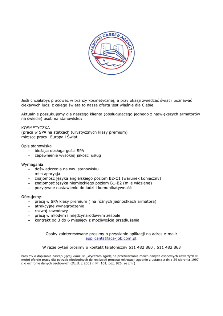 Jeśli chciałabyś pracować w branży kosmetycznej, a przy okazji zwiedzać świat i poznawać ciekawych ludzi z całego świata to nasza oferta jest właśnie dla Ciebie. Aktualnie poszukujemy dla naszego klienta (obsługującego jednego z największych armatorów na świecie) osób na stanowisko: KOSMETYCZKA (praca w SPA na statkach turystycznych klasy premium) miejsce pracy: Europa i Świat Opis stanowiska – bieżąca obsługa gości SPA – zapewnienie wysokiej jakości usług Wymagania: – doświadczenia na ww. stanowisku – miła aparycja – znajomość języka angielskiego poziom B2-C1 (warunek konieczny) – znajomość języka niemieckiego poziom B1-B2 (mile widziane) – pozytywne nastawienie do ludzi i komunikatywność Oferujemy: – pracę w SPA klasy premium ( na różnych jednostkach armatora) – atrakcyjne wynagrodzenie – rozwój zawodowy – pracę w młodym i międzynarodowym zespole – kontrakt od 3 do 6 miesięcy z możliwością przedłużenia Osoby zainteresowane prosimy o przysłanie aplikacji na adres e-mail: [email protected]. W razie pytań prosimy o kontakt telefoniczny 511 482 860 , 511 482 863 Prosimy o dopisanie następującej klauzuli: „Wyrażam zgodę na przetwarzanie moich danych osobowych zawartych w mojej ofercie pracy dla potrzeb niezbędnych do realizacji procesu rekrutacji zgodnie z ustawą z dnia 29 sierpnia 1997 r. o ochronie danych osobowych (Dz.U. z 2002 r. Nr. 101, poz. 926, ze zm.)