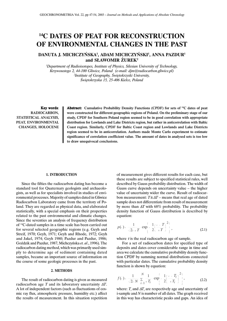 GEOCHRONOMETRIA Vol. 22, pp 47-54, 2003 – Journal on Methods and Applications of Absolute Chronology C DATES OF PEAT FOR RECONSTRUCTION OF ENVIRONMENTAL CHANGES IN THE PAST 14 DANUTA J. MICHCZYÑSKA1, ADAM MICHCZYÑSKI1, ANNA PAZDUR1 and S£AWOMIR ¯UREK2 Department of Radioisotopes, Institute of Physics, Silesian University of Technology, Krzywoustego 2, 44-100 Gliwice, Poland (e-mail: [email protected]) 2 Institute of Geography, Œwiêtokrzyski University, Œwiêtokrzyska 15, 25-406 Kielce, Poland 1 Key words words: RADIOCARBON, STATISTICAL ANALYSIS, PEAT, ENVIRONMENTAL CHANGES, HOLOCENE Abstract: Cumulative Probability Density Functions (CPDF) for sets of 14C dates of peat were constructed for different geographic regions of Poland. On the preliminary stage of our study, CPDF for Southern Poland region seemed to be in good correlation with appropriate distribution for Lowlands and Lake Districts region, but rather in anticorrelation with Baltic Coast region. Similarly, CPDF for Baltic Coast region and Lowlands and Lake Districts region seemed to be in anticorrelation. Authors made Monte Carlo experiment to estimate significance of correlation coefficient value. The amount of dates in analysed sets is too low to draw unequivocal conclusions. 1. INTRODUCTION Since the fifties the radiocarbon dating has become a standard tool for Quaternary geologists and archaeologists, as well as for specialists involved in studies of environmental processes. Majority of samples dated in Gliwice Radiocarbon Laboratory came from the territory of Poland. They are regarded as physical data, and elaborated statistically, with a special emphasis on their properties related to the past environmental and climatic changes. Since the seventies an analysis of frequency distribution of 14C-dated samples in a time scale has been carried out for several selected geographic regions (e.g. Geyh and Streif, 1970; Geyh, 1971; Geyh and Rhode, 1972; Geyh and Jakel, 1974; Geyh 1980; Pazdur and Pazdur, 1986; GoŸdzik and Pazdur, 1987, Michczyñska et. al., 1996). The radiocarbon dating method, which was primarily used simply to determine age of sediment containing dated samples, became an important source of information on the course of some geologic processes in the past. of measurement gives different results for each case, but these results are subject to specified statistical rules, well described by Gauss probability distribution. The width of Gauss curve depends on uncertainty value – the higher value of uncertainty wider the curve. Result of radiocarbon measurement: T±∆T – means that real age of dated sample does not differentiate from result of measurement by more than ∆T with 68% probability. The probability density function of Gauss distribution is described by equation: p(t ) = 2p DT × é expêê ë 1 æt - T ö ç ÷ 2 è DT ø 2ù ú ú û , (2.1) where τ is the real radiocarbon age of sample. For a set of radiocarbon dates for specified type of deposits and dates cover considerable range in time and area we calculate the cumulative probability density function CPDF by summing normal distributions connected with particular dates. The cumulative probability density function is shown by equation: 2. METHODS The result of radiocarbon dating is given as measured radiocarbon age T and its laboratory uncertainty ∆T. A lot of independent factors (such as fluctuations of cosmic ray flux, atmospheric pressure, humidity etc.) affect the results of measurement. In this situation repetition 1 f (t ) = N é 1 1 1 æ t - Ti ç × × exp ê å 2 çè DTi ê 2p N i =1 DTi ë ö ÷ ÷ ø 2ù ú ú û , (2.2) where: Ti and ∆Ti are respectively age and uncertainty of i-sample and N is number of all dates. The graph received in this way has characteristic peaks and gaps. An idea of 14 C DATES OF PEAT FOR RECONSTRUCTION OF ENVIRONMENTAL CHANGES IN THE PAST constructing of cumulative probability distribution for a few exemplary 14C dates is presented in Fig. 1. An interpretation of CPDF is based on two basic assumptions: 1. The number of 14C dated samples is proportional to the amount of organic matter deposited in sediments in considered time interval. 2. The amount of organic matter in sediments depends on palaeogeographical conditions. s = T = z (3.2) D E 1 = T = 2sN z (3.3) Geyh (1980) proposed two limits of s value: ±20% (what corresponds to z=25) and ±50% (z=4). According to these limits there should be a minimum 4 dates per class interval, and more than 25 dates per class interval in order to get reliable results. Preferential sampling Overinterpretation of certain periods or areas may be due to preferential sampling (Geyh, 1980; GoŸdzik and Pazdur, 1987; Stolk et al., 1994). Samples for 14C dating are frequently collected only from selected horizons, which are of special interest from the point of view of investigator, or from levels of questionable age. This practice seems to be a general rule in studies of outcrops or cores rich in organic deposits because of economic reasons (limited funds for dating). Studies focused on small regions may cause serious deformation of CPDF because of dominating local effects. Only critical selection of 14C dates used for construction CPDF can eliminate errors caused subjective sampling. Non-linearity of the radiocarbon time scale The non-linearity of radiocarbon time scale may results in clustering of 14C dates. CPDF may show maxima or minima that are not at all related to geologic events. Fluctuations of the distributions resulted by non-linearity of the 14C scale can be eliminated by probability calibration of these distributions (Pazdur and Michczyñska, 1989; van der Plich and Mook, 1989; Michczyñska et al., 1990). Another method of solution this problem was discussed by A.D. Stolk et al. (1989). Törnqvist and Bierkens (1994) are pointing that the choice of the degree of smoothing of calibration curve is an important step. According to this authors high-resolution