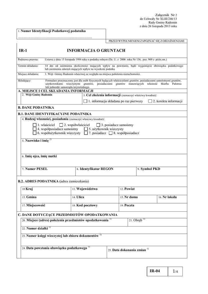 Załącznik Nr 2 do Uchwały Nr XLIII/246/13 Rady Gminy Radomin z dnia 26 listopada 2013 roku 1. Numer Identyfikacji Podatkowej podatnika ………………………………………………………. PRZED WYPEŁNIENIEM ZAPOZNAĆ SIĘ Z OBJAŚNIENIAMI IR-1 INFORMACJA O GRUNTACH Podstawa prawna: Ustawa z dnia 15 listopada 1984 roku o podatku rolnym (Dz. U. z 2006 roku Nr 136, poz. 969 z późn.zm.) Termin składania: 14 dni od zaistnienia okoliczności mających wpływ na powstanie, bądź wygaśnięcie obowiązku podatkowego lub zaistnienia zdarzeń mających wpływ na wysokość podatku Miejsce składania: 1. Wójt Gminy Radomin właściwej ze względu na miejsce położenia nieruchomości. Składający: Formularz przeznaczony jest dla osób fizycznych będących właścicielami gruntów, posiadaczami samoistnymi gruntów, użytkownikami wieczystymi gruntów, posiadaczami gruntów stanowiących własność Skarbu Państwa lub jednostki samorządu terytorialnego. A. MIEJSCE I CEL SKŁADANIA INFORMACJI 2. Wójt Gminy Radomin 3. Cel złożenia informacji (zaznaczyć właściwy kwadrat): 1. informacja składana po raz pierwszy 2. korekta informacji B. DANE PODATNIKA B.1. DANE IDENTYFIKACYJNE PODATNIKA 4. Rodzaj własności, posiadania (zaznaczyć właściwy kwadrat): 1. właściciel 2. współwłaściciel 3. posiadacz samoistny 4. współposiadacz samoistny 5. użytkownik wieczysty 6. współużytkownik wieczysty 7. posiadacz 8. współposiadacz 5. Nazwisko i imię 2) 6. Imię ojca, imię matki 7. Numer PESEL 8. Identyfikator REGON 9. Symbol PKD B.2. ADRES PODATNIKA (adres zamieszkania) 10 Kraj 11. Województwo 12. Powiat 13. Gmina 14. Ulica 15. Nr 17. Miejscowość 18. Kod 19. Poczta pocztowy domu 16. Nr lokalu C. DANE DOTYCZĄCE PRZEDMIOTÓW OPODATKOWANIA 20. Miejsce (adres) położenia przedmiotów opodatkowania 1) 22. Numer działki 1) 23. Numer 24. Data 21. Obręb 1) księgi wieczystej lub zbioru dokumentów 1) powstania obowiązku podatkowego 1) 25. Data dokonania zmian 1) IR-04 1/4 Klasa użytków rolnych (wynikająca z ewidencji gruntów i budynków) 1 Podstawa opodatkowania Powierzchnia w ha fizycznych Przelicznik 2 3 (liczba ha przeliczeniowych) (kol 2 x kol 3) 4 D. UŻYTKI ROLNE (grunty gospodarstw rolnych) D.1. GRUNTY ORNE I II IIIa IIIb IVa IVb Razem 1,80 1,65 1,50 1,25 1,00 0,75 26. 27. D.2. SADY I II III IV Razem 1,80 1,65 1,50 1,00 28. 29. D.3. ŁĄKI I PASTWISKA I II III IV Razem 1,60 1,35 1,15 0,70 30. 31. D.4. GRUNTY ROLNE ZABUDOWANE I 1,80 II 1,65 IIIa 1,50 IIIb 1,25 IVa 1,00 IVb 0,75 32. Razem D.5. GRUNTY POD STAWAMI ZARYBIONYMI i NIEZARYBIONYMI Powierzchnia w ha Gatunek ryb Przelicznik fizycznych 1 2 3 Łosoś, troć, głowacica, 1,00 palia, pstrąg Inne gatunki ryb 0,20 34. Razem D.6. GRUNTY POD ROWAMI 36. Rowy 33. Podstawa opodatkowania (liczba ha przeliczeniowych) 4 35. 37. E. OGÓŁEM OGÓŁEM suma poz. 26, 28, 30, 32, 34, 36 38. suma poz. 27, 29, 31, 33, 35, 37 39. F. POZOSTAŁE GRUNTY ROLNE (powierzchnia do 1 ha włącznie – sklasyfikowane w ewidencji gruntów i budynków jako użytki rolne) Podstawa opodatkowania (liczba ha fizycznych) 40. IR-04 2/4 G. DEKLARACJA O ZWOLNIONYCH PRZEDMIOTACH OPODATKOWANIA G.1. DANE DOTYCZĄCE PRZEDMIOTÓW ZWOLNIONYCH Z OPODATKOWANIA 1) 1) 41. Miejsce (adres) położenia przedmiotów opodatkowania 42. Obręb 43. Numer działki 1) 44. Numer 45. Data księgi wieczystej lub zbioru dokumentów 1) powstania obowiązku podatkowego 1) 46. Data dokonania zmian 1) G.2. PRZEDMIOTY ZWOLNIONE Z OPODATKOWANIA Podstawa opodatkowania w ha 1. 2. 3. 4. 5. Grunty zwolnione z podatku rolnego – użytki rolne klasy V, VI, VIz Grunty zadrzewione i zakrzewione ustanowione na użytkach rolnych Grunty położone w pasie drogi granicznej Grunty orne, łąki i pastwiska objęte melioracją – w roku, w którym uprawy zostały zniszczone wskutek robót drenarskich Grunty przeznaczone na utworzenie nowego gospodarstwa rolnego do powierzchni nie przekraczającej 100 ha: a) będące przedmiotem prawa własności lub prawa użytkowania wieczystego, nabyte w drodze umowy sprzedaży 6. 7. 8. 9. 10. 11. 12. 13. 47. 48. 49. 50. lub powiększenie już istniejącego 51. b) będące przedmiotem umowy o oddanie gruntów w użytkowanie 52. wieczyste c) wchodzące w skład Zasobu Własności Rolnej Skarbu Państwa, objęte w 53. trwałe zagospodarowanie Grunty gospodarstw rolnych powstałe z zagospodarowania nieużytków – 54. na okres 5 lat, licząc od roku następnego po zakończeniu zagospodarowania Grunty gospodarstw rolnych otrzymane w drodze wymiany lub scalenia – na 1 rok następujący po roku, w którym dokonano wymiany lub scalenia 55. gruntów Grunty gospodarstw rolnych, na których zaprzestano produkcji rolnej, z tym że zwolnienie może dotyczyć nie więcej niż 20% powierzchni 56. użytków rolnych gospodarstwa rolnego, lecz nie więcej niż 10 ha – na okres nie dłuższy niż 3 lata, w stosunku do tych samych gruntów 57. Użytki ekologiczne Grunty zajęte przez zbiorniki wody służące do zaopatrzenia ludności w 58. wodę Grunty pod wałami przeciwpowodziowymi i grunty położone w 59. międzywałach Grunty wpisane do rejestru zabytków, pod warunkiem ich 60. zagospodarowania i utrzymania, zgodnie z przepisami o ochronie zabytków Grunty stanowiące działki przyzagrodowe członków rolniczych spółdzielni produkcyjnych, którzy: 61. a) osiągnęli wiek emerytalny b) są inwalidami zaliczonymi do I lub II grupy c) są niepełnosprawnymi o znacznym lub umiarkowanym stopniu niepełnosprawności 62. IR-04 3/4 H. DANE IDENTYFIKACYJNE WSPÓŁWŁAŚCICIELI, WSPÓŁPOSIADACZY SAMOISTNYCH, WSPÓŁUŻYTKOWNIKÓW WIECZYSTYCH, WSPÓŁPOSIADACZY 63. Nazwisko i imię 66. Imię ojca, imię matki 64. Adres zamieszkania 67. NIP 65. Adres do korespondencji 71. Nazwisko i imię 74. 72. Adres zamieszkania 75. NIP 1. 68. PESEL 69. PKD 70. REGON 2. Imię ojca, imię matki 76. PESEL 73. Adres do korespondencji 77. PKD 78. REGON I. OŚWIADCZENIE OSOBY SKŁADAJĄC