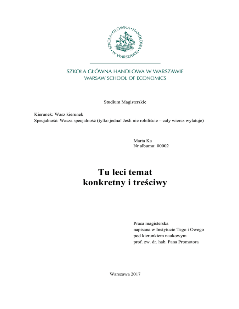 Studium Magisterskie Kierunek: Wasz kierunek Specjalność: Wasza specjalność (tylko jedna! Jeśli nie robiliście – cały wiersz wylatuje) Marta Ka Nr albumu: 00002 Tu leci temat konkretny i treściwy Praca magisterska napisana w Instytucie Tego i Owego pod kierunkiem naukowym prof. zw. dr. hab. Pana Promotora Warszawa 2017 Spis treści Wstęp ......................................................................................................................................... 5 Rozdział I Tytuł pierwszego rozdziału ...................................................................................................... 7 1.1. Tytuł pierwszego podrozdziału .................................................................................... 7 1.2. Tytuł drugiego podrozdziału ........................................................................................ 8 Podsumowanie ........................................................................................................................ 9 Rozdział II Tytuł drugiego rozdziału ........................................................................................................ 10 2.1. Tytuł pierwszego podrozdziału .................................................................................. 10 2.2. Tytuł drugiego podrozdziału ...................................................................................... 10 2.3. Tytuł trzeciego podrozdziału ..................................................................................... 10 2.3.1. Podpodrozdział 1 ................................................................................................ 10 2.3.2. Podpodrozdział 2 ................................................................................................ 11 2.3.3. Podpodrozdział 3 ................................................................................................ 11 Podsumowanie ...................................................................................................................... 11 Rozdział III Tytuł trzeciego rozdziału ....................................................................................................... 12 3.1. Tytuł pierwszego podrozdziału .................................................................................. 12 3.2. Tytuł drugiego podrozdziału ...................................................................................... 12 3.3. Tytuł trzeciego podrozdziału ..................................................................................... 12 3.4. Tytuł czwartego podrozdziału.................................................................................... 12 3.4.1. Podpodrozdział 1 ................................................................................................ 13 -3- 3.4.2. Podpodrozdział 2................................................................................................ 13 3.4.3. Podpodrozdział 3................................................................................................ 13 Podsumowanie...................................................................................................................... 13 Rozdział IV Tytuł czwartego rozdziału ..................................................................................................... 14 4.1. Tytuł pierwszego podrozdziału ................................................................................. 14 4.2. Tytuł drugiego podrozdziału ..................................................................................... 14 4.3. Tytuł trzeciego podrozdziału ..................................................................................... 14 4.4. Tytuł czwartego podrozdziału ................................................................................... 14 4.5. Tytuł piątego podrozdziału ........................................................................................ 15 Podsumowanie...................................................................................................................... 15 Zakończenie ............................................................................................................................ 16 Bibliografia ............................................................................................................................. 17 Spis rysunków i tabel ............................................................................................................. 19 Streszczenie ............................................................................................................................. 20 -4- Wstęp Jednym z kluczowych elementów pracy magisterskiej jest wstęp. Bla bla bla. Tu leci zajawka Waszej magisterki. Wstęp jest bardzo ważny. Prawdopodobnie jeśli czytelnik zechce sobie wyrobić wstępne zdanie o Waszej pracy jeszcze przed całościową lekturą, to przeczyta wstęp oraz zakończenie. Postarajcie się zatem. A tu leci drugi akapit. Już we wstępie możecie stosować przypisy1. Czemu nie2. Tylko uważajcie, bo też musi być czcionką Times New Roman! Teraz uwaga, kolejny przypis 3. Jeśli kolejny przypis to będzie ta sama pozycja, co oczko wyżej – stosujemy ibidem, czyli po łacinie: tamże4. Jeśli natomiast sięgacie znów do pozycji, która była wcześniej, ale nie tak od razu (dwa oczka wyżej albo jeszcze wcześniej), to już ibidem nie ma sensu. Wtedy piszemy op. cit., czyli opere citato, czyli po łacinie: z cytowanego dzieła5. Wtedy dajemy krótki namiar, żeby czytelnik mógł zidentyfikować, o którą pozycję chodzi, i op. cit. zastępuje dalsze szczegóły. Cały czas pamiętajcie, że powstaje dzieło naukowe. Unikajcie pierwszej osoby! Nie piszcie: *Jak wskazałem powyżej (tylko: Jak wskazano powyżej), *następnie zaprezentuję wyniki (tylko: następnie zaprezentowane zostały wyniki). Niektórzy piszą o sobie per „autor(ka)” (w opinii autora stanowi to