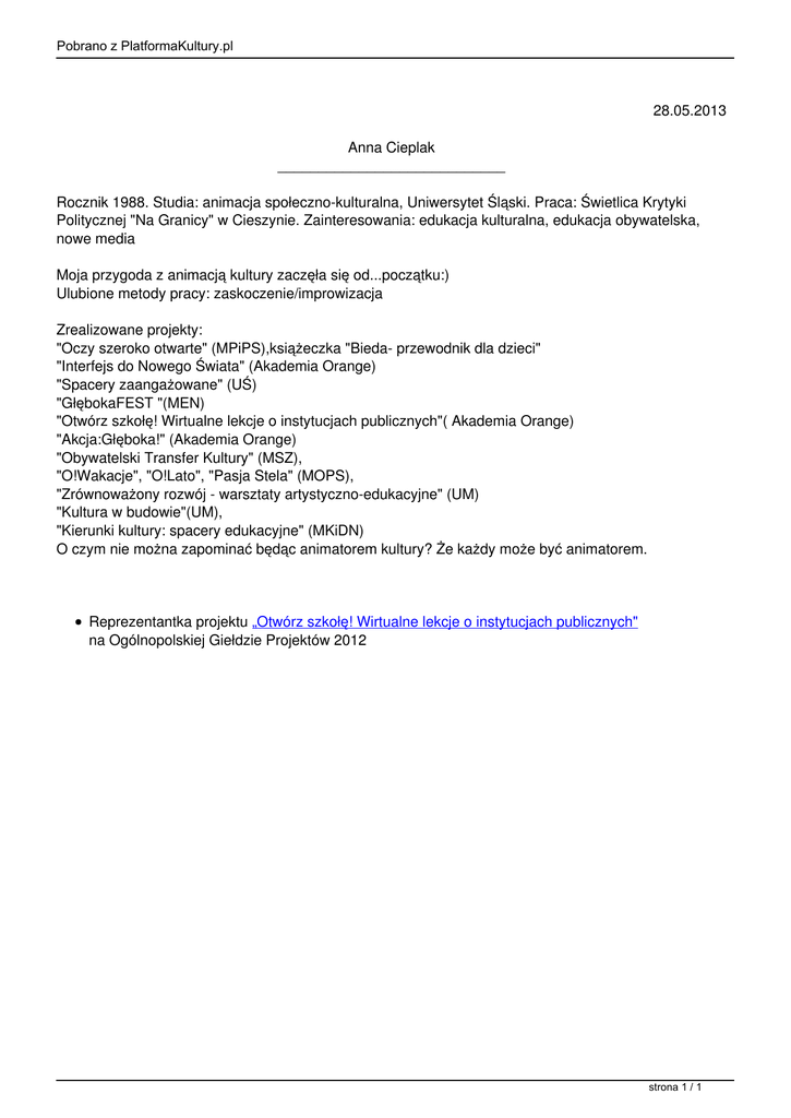 Pobrano z PlatformaKultury.pl 28.05.2013 Anna Cieplak ____________________________ Rocznik 1988. Studia: animacja społeczno-kulturalna, Uniwersytet Śląski. Praca: Świetlica Krytyki Politycznej "Na Granicy" w Cieszynie. Zainteresowania: edukacja kulturalna, edukacja obywatelska, nowe media Moja przygoda z animacją kultury zaczęła się od...początku:) Ulubione metody pracy: zaskoczenie/improwizacja Zrealizowane projekty: "Oczy szeroko otwarte" (MPiPS),książeczka "Bieda- przewodnik dla dzieci" "Interfejs do Nowego Świata" (Akademia Orange) "Spacery zaangażowane" (UŚ) "GłębokaFEST "(MEN) "Otwórz szkołę! Wirtualne lekcje o instytucjach publicznych"( Akademia Orange) "Akcja:Głęboka!" (Akademia Orange) "Obywatelski Transfer Kultury" (MSZ), "O!Wakacje", "O!Lato", "Pasja Stela" (MOPS), "Zrównoważony rozwój - warsztaty artystyczno-edukacyjne" (UM) "Kultura w budowie"(UM), "Kierunki kultury: spacery edukacyjne" (MKiDN) O czym nie można zapominać będąc animatorem kultury? Że każdy może być animatorem. Reprezentantka projektu „Otwórz szkołę! Wirtualne lekcje o instytucjach publicznych" na Ogólnopolskiej Giełdzie Projektów 2012 strona 1 / 1