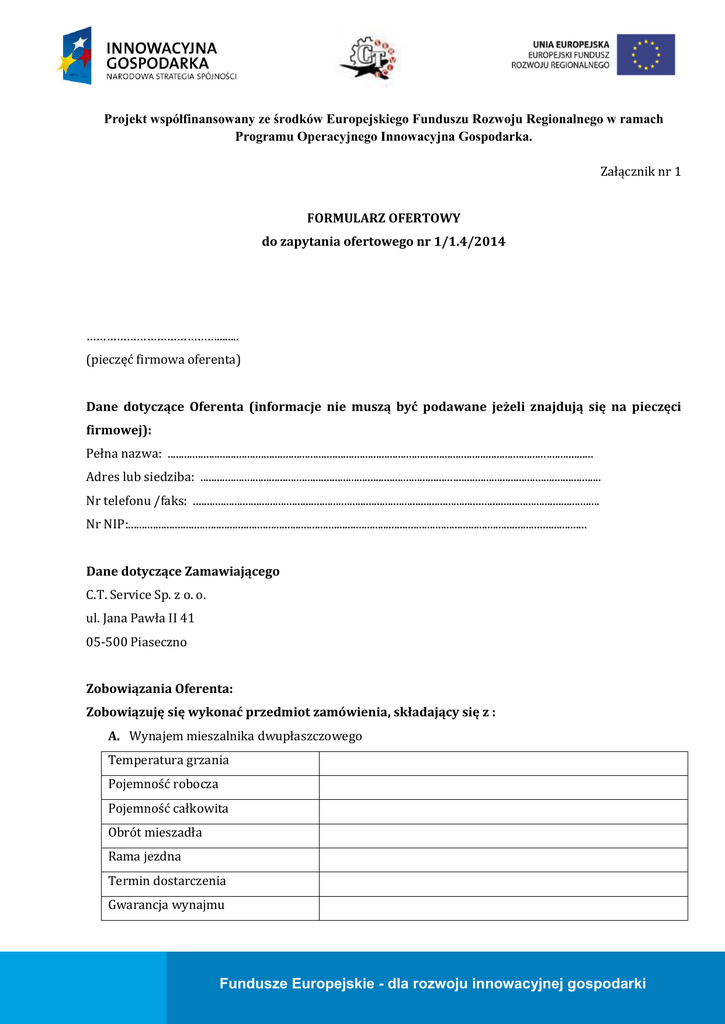 Projekt współfinansowany ze środków Europejskiego Funduszu Rozwoju Regionalnego w ramach Programu Operacyjnego Innowacyjna Gospodarka. Załącznik nr 1 FORMULARZ OFERTOWY do zapytania ofertowego nr 1/1.4/2014 …………………………………........ (pieczęć firmowa oferenta) Dane dotyczące Oferenta (informacje nie muszą być podawane jeżeli znajdują się na pieczęci firmowej): Pełna nazwa: ........................................................................................................................................................... Adres lub siedziba: .................................................................................................................................................. Nr telefonu /faks: .................................................................................................................................................... Nr NIP:....................................................................................................................................................................... Dane dotyczące Zamawiającego C.T. Service Sp. z o. o. ul. Jana Pawła II 41 05-500 Piaseczno Zobowiązania Oferenta: Zobowiązuję się wykonać przedmiot zamówienia, składający się z : A. Wynajem mieszalnika dwupłaszczowego Temperatura grzania Pojemność robocza Pojemność całkowita Obrót mieszadła Rama jezdna Termin dostarczenia Gwarancja wynajmu Fundusze Europejskie - dla rozwoju innowacyjnej gospodarki Projekt współfinansowany ze środków Europejskiego Funduszu Rozwoju Regionalnego w ramach Programu Operacyjnego Innowacyjna Gospodarka. cena netto za miesiąc za sztukę ……………………………………………………………………………………….….. cena za miesiąc za 3 sztuki ............................................................................................................................................. podatek VAT ......................................................................................................................................................................... cena brutto za miesiąc (3 sztuki) ................................................................................................................................. B. Wynajem urządzenia do nanoszenia kleju Zakres temperatury pracy Zakres temperatury otoczenia Zakres lepkości Objętość zbiornika Wymiary zbiornika Szybkość nanoszenia Wymiary urządzenia Termin dostarczenia Gwarancja wynajmu cena netto za miesiąc ................................................................................................................................................. podatek VAT ..................................................................................................................................................................... cena brutto za miesiąc................................................................................................................................................... C. Wynajem dozownika kleju na maszynę Pojemność zbiornika Czas nagrzewania Szybkość dozowania Zakres temperatur Ciężar Termin dostarczenia Gwarancja wynajmu cena netto za miesiąc ................................................................................................................................................. podatek VAT ..................................................................................................................................................................... Fundusze Europejskie - dla rozwoju innowacyjnej gospodarki Projekt współfinansowany ze środków Europejskiego Funduszu Rozwoju Regionalnego w ramach Programu Operacyjnego Innowacyjna Gospodarka. cena brutto za miesiąc................................................................................................................................................... D. Wynajem urządzenia do nasypu i wprasowywania kruszywa-ścierniwa Wymiary stołu do nasypu Temperatura grzania Wymiary taśmy ruchomej Ilość i skład wałków sekcji wprasowywania Termin dostarczenia Gwarancja cena netto za miesiąc ................................................................................................................................................. podatek VAT ..................................................................................................................................................................... cena brutto za miesiąc................................................................................................................................................... E. Wynajem urządzenia do konfekcjonowania nośnika elastycznego Czas cyklu Siła Wysokość ładowania Przestrzeń robocza Całkowita powierzchnia Szerokość / wysokość Ciśnienie Moc waga Parametry urządzenia do cięcia Fundusze Europejskie - dla rozwoju innowacyjnej gospodarki Projekt współfinansowany ze środków Europejskiego Funduszu Rozwoju Regionalnego w ramach Programu Operacyjnego Innowacyjna Gospodarka. cena netto za miesiąc ................................................................................................................................................. podatek VAT ..................................................................................................................................................................... cena brutto za miesiąc................................................................................................................................................... Łącznie, zobowiązuje się wykonać przedmiot zamówienia zgodnie z wymaganiami opisanymi w Zapytaniu ofertowym nr 1/1.4/2014 za kwotę (należy podać cenę całkowitą całości zamówienia, będącą sumą kwot wpisanych w pozycjach A-E) cena netto za miesiąc .................................................................................................................................