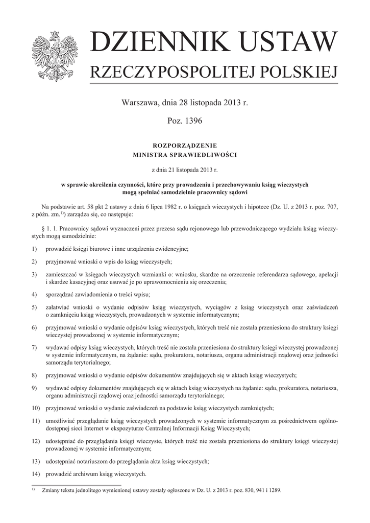 DZIENNIK USTAW RZECZYPOSPOLITEJ POLSKIEJ Warszawa, dnia 28 listopada 2013 r. Poz. 1396 ROZPORZĄDZENIE MINISTRA SPRAWIEDLIWOŚCI z dnia 21 listopada 2013 r. w sprawie określenia czynności, które przy prowadzeniu i przechowywaniu ksiąg wieczystych mogą spełniać samodzielnie pracownicy sądowi Na podstawie art. 58 pkt 2 ustawy z dnia 6 lipca 1982 r. o księgach wieczystych i hipotece (Dz. U. z 2013 r. poz. 707, z późn. zm.1)) zarządza się, co następuje: § 1. 1. Pracownicy sądowi wyznaczeni przez prezesa sądu rejonowego lub przewodniczącego wydziału ksiąg wieczystych mogą samodzielnie: 1)prowadzić księgi biurowe i inne urządzenia ewidencyjne; 2)przyjmować wnioski o wpis do ksiąg wieczystych; 3)zamieszczać w księgach wieczystych wzmianki o: wniosku, skardze na orzeczenie referendarza sądowego, apelacji i skardze kasacyjnej oraz usuwać je po uprawomocnieniu się orzeczenia; 4)sporządzać zawiadomienia o treści wpisu; 5)załatwiać wnioski o wydanie odpisów ksiąg wieczystych, wyciągów z ksiąg wieczystych oraz zaświadczeń o zamknięciu ksiąg wieczystych, prowadzonych w systemie informatycznym; 6)przyjmować wnioski o wydanie odpisów ksiąg wieczystych, których treść nie została przeniesiona do struktury księgi wieczystej prowadzonej w systemie informatycznym; 7)wydawać odpisy ksiąg wieczystych, których treść nie została przeniesiona do struktury księgi wieczystej prowadzonej w systemie informatycznym, na żądanie: sądu, prokuratora, notariusza, organu administracji rządowej oraz jednostki samorządu terytorialnego; 8)przyjmować wnioski o wydanie odpisów dokumentów znajdujących się w aktach ksiąg wieczystych; 9)wydawać odpisy dokumentów znajdujących się w aktach ksiąg wieczystych na żądanie: sądu, prokuratora, notariusza, organu administracji rządowej oraz jednostki samorządu terytorialnego; 10)przyjmować wnioski o wydanie zaświadczeń na podstawie ksiąg wieczystych zamkniętych; 11)umożliwiać przeglądanie ksiąg wieczystych prowadzonych w systemie informatycznym za pośrednictwem ogólnodostępnej sieci Internet w ekspozyturze Centralnej Informacji Ksiąg Wieczystych; 12)udostępniać do przeglądania księgi wieczyste, których treść nie została przeniesiona do struktury księgi wieczystej prowadzonej w systemie informatycznym; 13)udostępniać notariuszom do przeglądania akta ksiąg wieczystych; 14)prowadzić archiwum ksiąg wieczystych. 1) Zmiany tekstu jednolitego wymienionej ustawy zostały ogłoszone w Dz. U. z 2013 r. poz. 830, 941 i 1289. Dziennik Ustaw –2– Poz. 1396 2. Pracownicy, o których mowa w ust. 1, mogą pod kierunkiem sędziego lub referendarza sądowego zamieszczać w księdze wieczystej projekty wpisów. § 2. Rozporządzenie wchodzi w życie z dniem 1 grudnia 2013 r.2) Minister Sprawiedliwości: M. Biernacki 2) Niniejsze rozporządzenie było poprzedzone rozporządzeniem Ministra Sprawiedliwości z dnia 17 września 2001 r. w sprawie prowadzenia ksiąg wieczystych i zbiorów dokumentów (Dz. U. Nr 102, poz. 1122, z 2003 r. Nr 176, poz. 1721 oraz z 2011 r. Nr 33, poz. 164), które traci moc z dniem wejścia w życie ustawy z dnia 24 maja 2013 r. o zmianie ustawy o księgach wieczystych i hipotece (Dz. U. poz. 941).