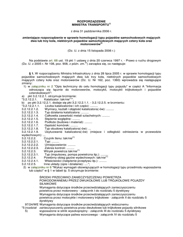 ROZPORZĄDZENIE 1) MINISTRA TRANSPORTU z dnia 31 października 2006 r. zmieniające rozporządzenie w sprawie homologacji typu pojazdów samochodowych mających dwa lub trzy koła, niektórych pojazdów samochodowych mających cztery koła oraz 2) motorowerów (Dz. U. z dnia 15 listopada 2006 r.) Na podstawie art. 68 ust. 19 pkt 1 ustawy z dnia 20 czerwca 1997 r. - Prawo o ruchu drogowym 3) (Dz. U. z 2005 r. Nr 108, poz. 908, z późn. zm. ) zarządza się, co następuje: § 1. W rozporządzeniu Ministra Infrastruktury z dnia 28 lipca 2005 r. w sprawie homologacji typu pojazdów samochodowych mających dwa lub trzy koła, niektórych pojazdów samochodowych mających cztery koła oraz motorowerów (Dz. U. Nr 162, poz. 1360) wprowadza się następujące zmiany: 1) w załączniku nr 2 "Opis techniczny do celu homologacji typu pojazdu" w części A "Informacja odnosząca się łącznie do motorowerów, motocykli, motocykli trójkołowych i pojazdów czterokołowych": a) pkt 3.2.12.2.1. otrzymuje brzmienie: (1) "3.2.12.2.1. Katalizator: tak/nie ", b) po pkt 3.2.12.2.1. dodaje się pkt 3.2.12.2.1.1. - 3.2.12.2.5. w brzmieniu: "3.2.12.2.1.1. Liczba katalizatorów i ich części: ......... 3.2.12.2.1.2. Wymiary, kształt i objętość katalizatora(-ów): ......... 3.2.12.2.1.3. Typ działania katalizatora: ......... 3.2.12.2.1.4. Całkowita zawartość metali szlachetnych: ......... 3.2.12.2.1.5. Stężenie względne: ......... 3.2.12.2.1.6. Podłoże (budowa i materiał): ......... 3.2.12.2.1.7. Gęstość komórek: ......... 3.2.12.2.1.8. Typ obudowy katalizatora(-ów): ... 3.2.12.2.1.9. Usytuowanie katalizatora(-ów) (miejsce i odległość odniesienia w przewodzie wydechowym): ... (1) 3.2.12.2.2. Czujnik tlenu: tak/nie 3.2.12.2.2.1. Typ: ......... 3.2.12.2.2.2. Umiejscowienie: ......... 3.2.12.2.2.3. Zakres kontroli: ......... (1) 3.2.12.2.3. Wtrysk powietrza tak/nie 3.2.12.2.3.1. Typ (impulsowy, pompa powietrzna itp.): ......... (1) 3.2.12.2.4. Powtórny obieg gazów wydechowych: tak/nie 3.2.12.2.4.1. Właściwości (natężenie przepływu itp.): ......... 3.2.12.2.5. Inne układy (opis i działanie): ...."; 2) w załączniku nr 6 "Wykaz wymagań obowiązujących w homologacji typu przedmiotu wyposażenia lub części" w § 1 w tabeli lp. 5 otrzymuje brzmienie: ŚRODKI PRZECIWKO ZANIECZYSZCZENIU POWIETRZA POWODOWANEMU PRZEZ DWUKOŁOWE LUB TRÓJKOŁOWE POJAZDY SILNIKOWE Wymagania dotyczące środków przeciwdziałających zanieczyszczeniu powietrza przez motorowery - załącznik I do rozdziału 5 dyrektywy Wymagania dotyczące środków przeciwdziałających zanieczyszczeniu powietrza przez motocykle i motorowery trójkołowe - załącznik II do rozdziału 5 dyrektywy 97/24/WE Wymagania dotyczące środków przeciwdziałających widocznemu "5 (rozdział zanieczyszczeniu powietrza przez dwukołowe lub trójkołowe pojazdy silnikowe 5) wyposażone w silnik wysokoprężny - załącznik III do rozdziału 5 dyrektywy Wymagania dotyczące paliwa wzorcowego - załącznik IV do rozdziału 5 dyrektywy Wzór opisu technicznego środków przeciwdziałających zanieczyszczeniu powietrza przez określony typ dwukołowego albo trójkołowego pojazdu silnikowego - załącznik V do rozdziału 5 dyrektywy Wzór świadectwa homologacji środków przeciwdziałających zanieczyszczeniu powietrza przez określony typ dwukołowego lub trójkołowego pojazdu silnikowego - załącznik VI do rozdziału 5 dyrektywy Homologacja typu zamiennych katalizatorów traktowanych jako oddzielny zespół techniczny dwu- lub trzykołowych pojazdów silnikowych - załącznik VII do rozdziału 5 dyrektywy" 3) w załączniku nr 9 "System numerowania świadectw homologacji typu i znakowania": a) w części A "System nadawania numerów świadectw homologacji typu WE" w pkt 1 Pole 1 otrzymuje brzmienie: "Pole 1: mała litera "e" i następujący po niej numer (lub kod) wyróżniający Państwa Członkowskiego wydającego homologację typu: 1 - Niemcy; 2 - Francja; 3 - Włochy; 4 - Niderlandy; 5 Szwecja; 6 - Belgia; 7 - Węgry; 8 - Czechy; 9 - Hiszpania; 11 - Zjednoczone Królestwo; 12 - Austria; 13 - Luksemburg; 17 - Finlandia; 18 - Dania; 20 - Polska; 21 - Portugalia; 23 - Grecja; 24 - Irlandia; 26 - Słowenia; 27 - Słowacja; 29 - Estonia; 32 - Łotwa; 36 - Litwa; 49 - Cypr; 50 - Malta.", b) w części B "Znak homologacji typu" pkt 1.1. otrzymuje brzmienie: "1.1. prostokąta otaczającego małą literę "e", z następującym po niej numerem wyróżniającym Państwa Członkowskiego, które udzieliło homologacji typu: 1 - Niemcy 2 - Francja 3 - Włochy 4 - Niderlandy 5 - Szwecja 6 - Belgia 7 - Węgry 8 - Czechy 9 - Hiszpania 11 - Zjednoczone Królestwo 12 - Austria 13 - Luksemburg 17 - Finlandia 18 - Dania 20 - Polska 21 - Portugalia 23 - Grecja 24 - Irlandia 26 - Słowenia 27 - Słowacja 29 - Estonia 32 - Łotwa 36 - Litwa 49 - Cypr 50 - Malta"; (14) 4) w załączniku nr 11 "Wzory wyciągów ze świadectwa homologacji typu pojazdu" przypis otrzymuje brzmienie: 14) " W pozycji nr 50 należy podać dane niezbędne do rejestracji pojazdu: rodzaj, podrodzaj (o ile dotyczy), rok produkcji, masa własna (w kg), dopuszczalna ładowność (w kg), liczba miejsc siedzących, największy dopuszczalny nacisk osi (w kN), dopuszczalna masa całkowita pojazdu (w kg). Ponadto w punkcie tym można umieszczać wszystkie inne informacje dodatkowe, uznane za istotne przez producenta pojazdu."; 5) w załączniku nr 13 "Wykaz jednostek upoważnionych do przeprowadzania badań homologacyjnych oraz kontroli zgodności produkcji lub montażu" w tabeli pkt 4 otrzymuje brzmienie: - do badań homologacyjnych typu przedmiotu "4) Przemysłowy wyposażenia lub części pojazdu według Instytut dyrektyw(*) Motoryzacji, ul. 97/24/WE (C8, C9, C10, C11), 93/14/EWG, Jagiellońska 55, 03- 93/30/EWG, 93/33/EWG, 93/32/EWG oraz 301 prowadzenia WARSZAWA kontroli zgodności produkcji w tym zakresie; - do badań homologacyjnych typu przedmiotu wyposażenia lub części poja