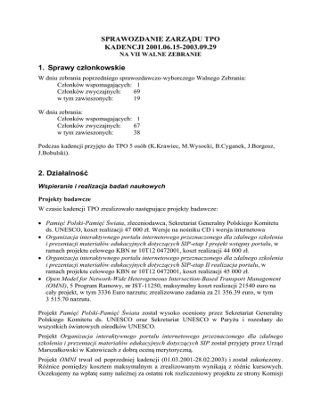 SPRAWOZDANIE ZARZĄDU TPO KADENCJI 2001.06.15-2003.09.29 NA VII WALNE ZEBRANIE 1. Sprawy członkowskie W dniu zebrania poprzedniego sprawozdawczo-wyborczego Walnego Zebrania: Członków wspomagających: 1 Członków zwyczajnych: 69 w tym zawieszonych: 19 W dniu zebrania: Członków wspomagających: 1 Członków zwyczajnych: 67 w tym zawieszonych: 38 Podczas kadencji przyjęto do TPO 5 osób (K.Krawiec, M.Wysocki, B.Cyganek, J.Borgosz, J.Bobulski). 2. Działalność Wspieranie i realizacja badań naukowych Projekty badawcze W czasie kadencji TPO zrealizowało następujące projekty badawcze: • Pamięć Polski-Pamięć Świata, zleceniodawca, Sekretariat Generalny Polskiego Komitetu ds. UNESCO, koszt realizacji 47 000 zł. Wersje na nośniku CD i wersja internetowa • Organizacja interaktywnego portalu internetowego przeznaczonego dla zdalnego szkolenia i prezentacji materiałów edukacyjnych dotyczących SIP-etap I projekt wstępny portalu, w ramach projektu celowego KBN nr 10T12 0472001, koszt realizacji 44 000 zł. • Organizacja interaktywnego portalu internetowego przeznaczonego dla zdalnego szkolenia i prezentacji materiałów edukacyjnych dotyczących SIP-etap II realizacja portalu, w ramach projektu celowego KBN nr 10T12 0472001, koszt realizacji 45 000 zł. • Open Model for Network-Wide Heterogeneous Intersection-Based Transport Management (OMNI), 5 Program Ramowy, nr IST-11250, maksymalny koszt realizacji 21540 euro na cały projekt, w tym 3336 Euro narzutu; zrealizowano zadania za 21 356.39 euro, w tym 3 515.70 narzutu. Projekt Pamięć Polski-Pamięć Świata został wysoko oceniony przez Sekretariat Generalny Polskiego Komitetu ds. UNESCO oraz Sekretariat UNESCO w Paryżu i rozesłany do wszystkich światowych ośrodków UNESCO. Projekt Organizacja interaktywnego portalu internetowego przeznaczonego dla zdalnego szkolenia i prezentacji materiałów edukacyjnych dotyczących SIP został przyjęty przez Urząd Marszałkowski w Katowicach z dobrą oceną merytoryczną. Projekt OMNI trwał od poprzedniej kadencji (01.03.2001-28.02.2003) i został zakończony. Różnice pomiędzy kosztem maksymalnym a zrealizowanym wynikają z różnic kursowych. Oczekujemy na wpłatę sumy należnej za ostatni rok rozliczeniowy projektu ze strony Komisji Europejskiej, która, po potrąceniu odpowiadającej jej części zaliczki, powinna wynieść 5 896.20 euro. Nagrody Towarzystwo ufundowało nagrody za najlepszą prezentację na konferencjach: International Conference on Computer Vision and Graphics ICCVG 2002 (2 nagrody i 4 wyróżnienia), IV Sympozjum Naukowe – Techniki Przetwarzania Obrazu TPO 2002 (1 nagroda), Komputerowe Systemy Rozpoznawania KOSYR 2003 (1 nagroda) (nagrody rzeczowe: monografie z dziedziny przetwarzania obrazów i rozpoznawania obiektów; wyróżnienia dyplomy). Ufundowano razem 4 nagrody. Podczas ICCVG proces selekcji laureatów pozostawał w gestii Zarządu TPO i Komitetu Naukowego konferencji, w pozostałych przypadkach TPO fundowało nagrody pozostawiając organizatorom konferencji decyzję o wyborze laureata. Przyznano nagrody za najlepszą pracę doktorską w dziedzinach działalności Towarzystwa za lata 2001 i 2002 (wręczone w latach 2002 i 2003). Przyznano 3 nagrody (za 2001: dwie równorzędne po 1000 zł, za 2002: jedna za 2000 zł) i 2 wyróżnienia (dyplomy). Konferencje TPO było głównym organizatorem dwóch międzynarodowych konferencji: • Electronic Imaging & Visual Arts (EVA), 18 – 19 listopad, 2001, Archiwum Główne Akt Dawnych, Warszawa, • International Conference on Computer Vision and Graphics with Special Session for Young Scientists (ICCVG), 25-29 wrzesień, 2002, Zakopane, TPO było współorganizatorem • Komputerowe Systemy Rozpoznawania (KOSYR), 2003, Miłków Czasopisma TPO nie uczestniczy obecnie w redagowaniu czasopism naukowych.. Monografia W 1999 roku Komitet Biocybernetyki PAN zainicjował wydanie serii „Biocybernetyka i Inżynieria Biomedyczna 2000”. Tom VIII tej serii: „Obrazowanie Medyczne” będzie wydawany przez TPO w tym sensie, że TPO jako towarzystwo naukowe uzyskało w MNiI (d. KBN) dotację na jego wydanie w wysokości 21 150 zł, z obowiązkiem uczestniczenia w kosztach wydawnictwa w co najmniej około 48%. Towarzystwo zgromadziło środki z innych źródeł (instytucje redaktorów tomu, darowizna prywatna) w wysokości 7 000 zł, przeznaczyło na druk ze środków własnych 2000 zł, oraz włoży pracę o wartości 9 500 zł na zasadzie woluntariatu. Informacja/promocja w Internecie Strona www Towarzystwa jest odwiedzana średnio 300 razy miesięcznie. Pocztą elektroniczną rozsyłane są dość liczne informacje o konferencjach i innych wydarzeniach, mogących zainteresować Członków i Sympatyków TPO. Zebrania naukowe W kadencji nie było własnych zebrań naukowych TPO. Kontakty z IAPR Przedstawicielem TPO w IAPR jest dr Leszek Chmielewski, realizowane są standardowe działania: rozsyłanie IAPR Newsletter, rozsyłanie e-mailowych informacji o konferencjach i czasopismach otrzymywanych z IAPR, wystawiane są certyfikaty członkowskie IAPR uprawniające do zniżek na konferencjach IAPR, przedstawiciel TPO bierze udział w głosowaniach Rady Zarządzającej IAPR konsultując swoje decyzje z Zarządem TPO. Realizacja Uchwały Programowej poprzedniego Walnego Zebrania Uchwały Programowe VI Walnego Zebrania dotyczyły aktywizacji działalności i promocji TPO oraz koncepcji włączenia studentów do prac Towarzystwa. Szczegółowe postulaty uczestników VI Walnego Zebrania zapisane w uchwale programowej przedstawiono poniżej wraz z komentarzem dotyczącym stopnia ich realizacji. Stworzenie folderu promującego działalność TPO, stworzenie w Internecie listy dyskusyjnej dla Członków TPO w celu ułatwienia wymiany fachowych informacji. Z wymienionych postulatów udało się zrealizować tylko ten który był bezpośrednio użyteczny dla prowadzonych prac naukowych i dla dydaktyki, mianowicie system
