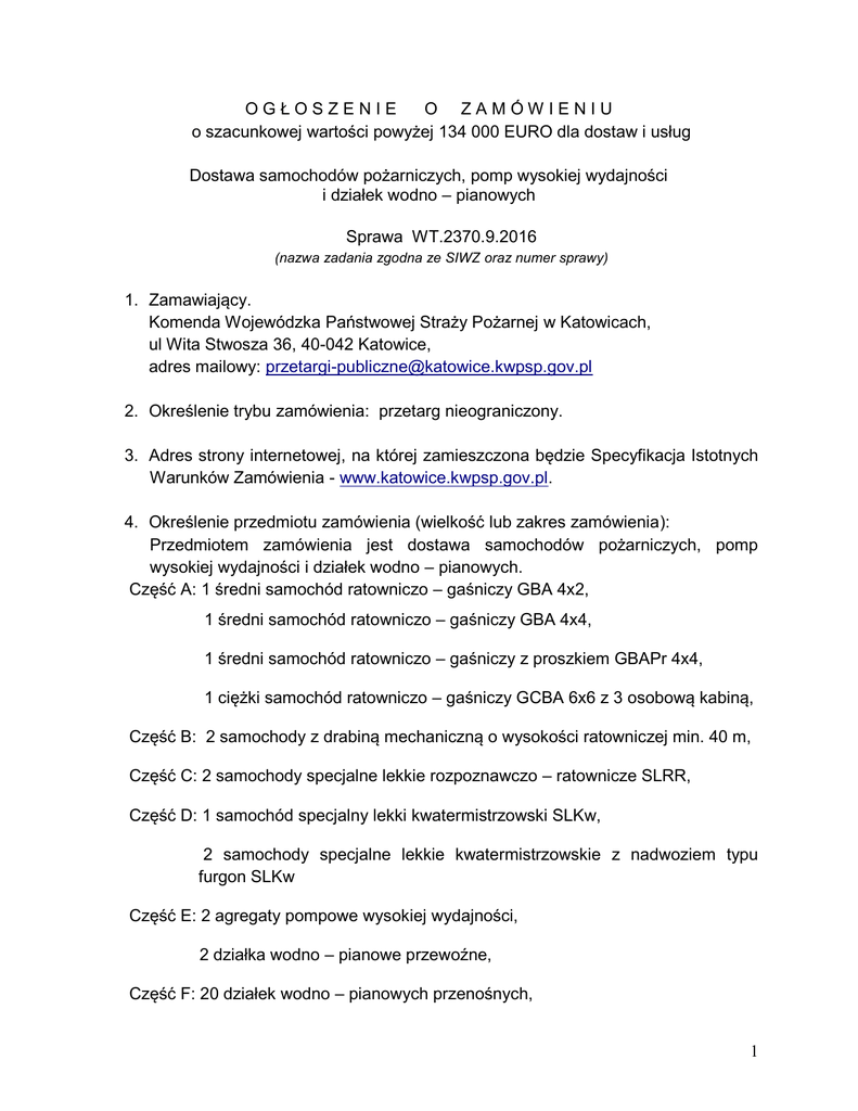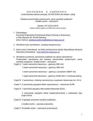 OGŁOSZENIE O ZAMÓWIENIU o szacunkowej wartości powyżej 134 000 EURO dla dostaw i usług Dostawa samochodów pożarniczych, pomp wysokiej wydajności i działek wodno – pianowych Sprawa WT.2370.9.2016 (nazwa zadania zgodna ze SIWZ oraz numer sprawy) 1. Zamawiający. Komenda Wojewódzka Państwowej Straży Pożarnej w Katowicach, ul Wita Stwosza 36, 40-042 Katowice, adres mailowy: [email protected] 2. Określenie trybu zamówienia: przetarg nieograniczony. 3. Adres strony internetowej, na której zamieszczona będzie Specyfikacja Istotnych Warunków Zamówienia - www.katowice.kwpsp.gov.pl. 4. Określenie przedmiotu zamówienia (wielkość lub zakres zamówienia): Przedmiotem zamówienia jest dostawa samochodów pożarniczych, pomp wysokiej wydajności i działek wodno – pianowych. Część A: 1 średni samochód ratowniczo – gaśniczy GBA 4x2, 1 średni samochód ratowniczo – gaśniczy GBA 4x4, 1 średni samochód ratowniczo – gaśniczy z proszkiem GBAPr 4x4, 1 ciężki samochód ratowniczo – gaśniczy GCBA 6x6 z 3 osobową kabiną, Część B: 2 samochody z drabiną mechaniczną o wysokości ratowniczej min. 40 m, Część C: 2 samochody specjalne lekkie rozpoznawczo – ratownicze SLRR, Część D: 1 samochód specjalny lekki kwatermistrzowski SLKw, 2 samochody specjalne lekkie kwatermistrzowskie z nadwoziem typu furgon SLKw Część E: 2 agregaty pompowe wysokiej wydajności, 2 działka wodno – pianowe przewoźne, Część F: 20 działek wodno – pianowych przenośnych, 1 Nr CPV: wozy strażackie – 34144210-3 agregaty pompowe– 42122110-4 działka wodno – pianowe – 35111000-5 Zamawiający dopuszcza składanie ofert częściowych. Oferty można składać w odniesieniu do jednej, kilku lub wszystkich części zamówienia. 5. Zamawiający nie dopuszcza możliwości złożenia oferty wariantowej. 6. Termin wykonania zamówienia: : dla część A, B, C i D: 5.12.2016 r., dla część E i F: 30.11.2016 r. 7. Warunki udziału w postępowaniu oraz podstawy wykluczenia. 7.1 Sytuacja podmiotowa Wykonawców, w tym wymogi związane z wpisem do rejestru zawodowego lub handlowego. W zakresie wstępnego potwierdzenia spełniania przez Wykonawcę warunków udziału w niniejszym postępowaniu oraz braku podstaw wykluczenia należy przedłożyć Jednolity Europejski Dokument Zamówienia, zwany dalej „JEDZ”. Należy wypełnić formularz znajdujący się, w wersji edytowalnej, na stronie Urzędu Zamówień publicznych: https://www.uzp.gov.pl/aktualnosci/edytowalna-wersja-formularza-jednolitegoeuropejskiego-dokumentu-zamowienia-jedz Po ocenie ofert Wykonawca, którego oferta została oceniona, jako najkorzystniejsza, zostanie wezwany do przedstawienia Zamawiającemu, w wyznaczonym terminie, dokumentów potwierdzających złożone oświadczenia o spełnianiu warunków udziału w postępowaniu, o których mowa w pkt. 6 SIWZ. 7.2. Kwalifikacje techniczne. Doświadczenie zawodowe. O udzielenie zamówienia mogą ubiegać się Wykonawcy, którzy wykażą, że: a) Dla części A zamówienia. Wykonali należycie w okresie ostatnich 3 lat przed upływem terminu składania ofert, albo wniosków o dopuszczenie do udziału w postępowaniu, a jeżeli okres prowadzenia działalności jest krótszy w tym okresie, co najmniej 2 dostaw samochodów GBAPr, GBA i GCBA (łącznie 4 szt.), o wartości nie mniejszej niż 4 000 000,00 zł każda. b) Dla części B zamówienia. Wykonali należycie w okresie ostatnich 3 lat przed upływem terminu składania ofert, albo wniosków o dopuszczenie do udziału w postępowaniu, a jeżeli okres prowadzenia działalności jest krótszy w tym okresie, co najmniej 2 dostaw samochodów z drabiną mechaniczną o wysokości ratowniczej min. 40 m, o wartości nie mniejszej niż 2 500 000 zł każda. 2 c) Dla części C zamówienia. Wykonali należycie w okresie ostatnich 3 lat przed upływem terminu składania ofert, albo wniosków o dopuszczenie do udziału w postępowaniu, a jeżeli okres prowadzenia działalności jest krótszy w tym okresie, co najmniej 2 dostaw samochodów SLRR, o wartości nie mniejszej niż 150 000,00 zł każda. d) Dla części D zamówienia. Wykonali należycie w okresie ostatnich 3 lat przed upływem terminu składania ofert, albo wniosków o dopuszczenie do udziału w postępowaniu, a jeżeli okres prowadzenia działalności jest krótszy w tym okresie, co najmniej 3 dostaw samochodów dostawczych, o wartości nie mniejszej niż 100 000,00 zł każda. e) Dla części E zamówienia. Wykonali należycie w okresie ostatnich 3 lat przed upływem terminu składania ofert, albo wniosków o dopuszczenie do udziału w postępowaniu, a jeżeli okres prowadzenia działalności jest krótszy w tym okresie, co najmniej 1 dostawy agregatu pompowego wysokiej wydajności, o wartości nie mniejszej niż 500 000,00 zł oraz 1 działka wodno – pianowego przewoźnego, o wartości nie mniejszej niż 100 00,00 zł. f) Dla części F zamówienia. Wykonali należycie w okresie ostatnich 3 lat przed upływem terminu składania ofert, albo wniosków o dopuszczenie do udziału w postępowaniu, a jeżeli okres prowadzenia działalności jest krótszy w tym okresie, co najmniej 10 dostaw działka wodno – pionowego przenośnego, o wartości nie mniejszej niż 25 000,00 zł każda. Brak jakiegokolwiek z wymienionych dokumentów w pkt. 7a. lub złożenie dokumentu w niewłaściwej formie (np. niepoświadczone przez Wykonawcę za zgodność z oryginałem odpisy lub kopie) spowoduje wykluczenie Wykonawcy z postępowania (po dokonaniu czynności przewidzianych w art. 26 ust. 3 ustawy PZP). 7a. Wykaz oświadczeń lub dokumentów potwierdzających spełnianie warunków udziału w postępowaniu oraz brak podstaw wykluczenia. (Niżej wymienionych dokumentów nie należy dołączać do oferty. Po ocenie ofert Wykonawca, którego oferta została oceniona jako najkorzystniejsza, zostanie wezwany do przedstawienia Zamawiającemu, w wyznaczonym terminie, dokumentów potwierdzaj