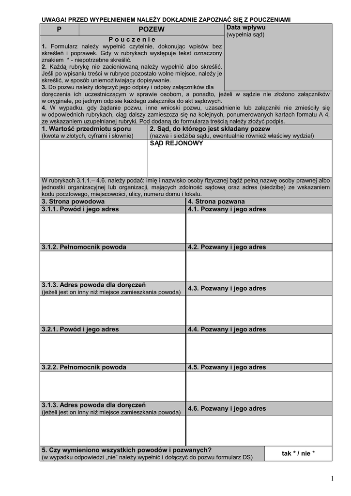 UWAGA! PRZED WYPEŁNIENIEM NALEŻY DOKŁADNIE ZAPOZNAĆ SIĘ Z POUCZENIAMI P Data wpływu POZEW (wypełnia sąd) Pouczenie 1. Formularz należy wypełnić czytelnie, dokonując wpisów bez skreśleń i poprawek. Gdy w rubrykach występuje tekst oznaczony znakiem * - niepotrzebne skreślić. 2. Każdą rubrykę nie zacieniowaną należy wypełnić albo skreślić. Jeśli po wpisaniu treści w rubryce pozostało wolne miejsce, należy je skreślić, w sposób uniemożliwiający dopisywanie. 3. Do pozwu należy dołączyć jego odpisy i odpisy załączników dla doręczenia ich uczestniczącym w sprawie osobom, a ponadto, jeżeli w sądzie nie złożono załączników w oryginale, po jednym odpisie każdego załącznika do akt sądowych. 4. W wypadku, gdy żądanie pozwu, inne wnioski pozwu, uzasadnienie lub załączniki nie zmieściły się w odpowiednich rubrykach, ciąg dalszy zamieszcza się na kolejnych, ponumerowanych kartach formatu A 4, ze wskazaniem uzupełnianej rubryki. Pod dodaną do formularza treścią należy złożyć podpis. 1. Wartość przedmiotu sporu 2. Sąd, do którego jest składany pozew (kwota w złotych, cyframi i słownie) (nazwa i siedziba sądu, ewentualnie również właściwy wydział) SĄD REJONOWY W rubrykach 3.1.1.– 4.6. należy podać: imię i nazwisko osoby fizycznej bądź pełną nazwę osoby prawnej albo jednostki organizacyjnej lub organizacji, mających zdolność sądową oraz adres (siedzibę) ze wskazaniem kodu pocztowego, miejscowości, ulicy, numeru domu i lokalu. 3. Strona powodowa 3.1.1. Powód i jego adres 4. Strona pozwana 4.1. Pozwany i jego adres 3.1.2. Pełnomocnik powoda 4.2. Pozwany i jego adres 3.1.3. Adres powoda dla doręczeń (jeżeli jest on inny niż miejsce zamieszkania powoda) 4.3. Pozwany i jego adres 3.2.1. Powód i jego adres 4.4. Pozwany i jego adres 3.2.2. Pełnomocnik powoda 4.5. Pozwany i jego adres 3.1.3. Adres powoda dla doręczeń (jeżeli jest on inny niż miejsce zamieszkania powoda) 4.6. Pozwany i jego adres 5. Czy wymieniono wszystkich powodów i pozwanych? (w wypadku odpowiedzi „nie” należy wypełnić i dołączyć do pozwu formularz DS) tak * / nie * 1 6. Żądanie pozwu Należy wybrać właściwy rodzaj żądania 6.1 lub 6.2 i wypełnić odpowiednie rubryki. W postępowaniu uproszczonym łączenie roszczeń nie jest dopuszczalne - rubryki dotyczące drugiego z żądań należy skreślić. Gdy żądanie pozwu jest skierowane przeciwko więcej niż jednemu pozwanemu należy wskazać, w jaki sposób sąd ma zasądzić dochodzoną kwotę. 6.1. Żądanie zasądzenia solidarnie * / w inny sposób * (wskazać jak) żądana kwota odsetki - ustawowe * - umowne * (wskazać wysokość lub sposób obliczania) kwota lub kwoty, od których naliczane mają być odsetki 6.2. Inne żądanie okres za który należą się odsetki od do - nakazania określonego zachowania się * - wydania rzeczy * - pozostałe * Poniżej należy opisać zachowanie się, które sąd ma nakazać lub opisać rzecz, której wydanie ma być nakazane (tak, by wyrok mógł być wykonany), o ile to niezbędne – również wskazać termin wykonania. Jeśli powyżej wskazano „pozostałe” - należy dokładnie wskazać treść takiego żądania. 7. Żądanie zwrotu kosztów procesu 8. Inne wnioski pozwu, o których mowa w art. 187 § 2 kpc lub w art. 484 1 § 2 kpc (wskazać jakie) 2 9. Uzasadnienie Należy wskazać wszystkie fakty, z których wynika, że żądanie pozwu jest zasadne (w szczególności należy wskazać umowę, z której roszczenie wynika, obowiązek, którego pozwany nie wykonał i datę wymagalności tego obowiązku). Okoliczności faktyczne, wnioski i dowody nie zgłoszone w pozwie mogą być w postępowaniu uproszczonym zgłaszane tylko wówczas, gdy strona wykaże, że nie mogła ich powołać wcześniej lub gdy potrzeba ich powołania wyniknęła później. W miarę potrzeby należy uzasadnić również właściwość sądu. 10. Wnioski dowodowe Należy dokładnie wskazać każdy wnioskowany dowód i wszystkie dane, które są niezbędne, by Należy dokładnie wskazać, który z faktów opisanych w sąd mógł ten dowód przeprowadzić (np. w uzasadnieniu ma zostać stwierdzony przez wypadku dowodów nie dołączonych do pisma – przeprowadzenie wnioskowanego dowodu. wskazać gdzie i u kogo się znajdują, w wypadku świadków – wskazać ich dokładne dane i adres). 10.1.1. Zgłaszany dowód 10.1.2. Fakt podlegający stwierdzeniu 10.2.1. Zgłaszany dowód 10.2.2. Fakt podlegający stwierdzeniu 3 10.3.1. Zgłaszany dowód 10.3.2. Fakt podlegający stwierdzeniu 10.4.1. Zgłaszany dowód 10.4.2. Fakt podlegający stwierdzeniu 12. Czy powyżej zgłoszono wszystkie dowody? (w wypadku odpowiedzi „nie” należy wypełnić i dołączyć formularz WD) Dowody nie zgłoszone w pozwie i załączniku WD mogą być w postępowaniu uproszczonym zgłaszane tylko wówczas, gdy strona wykaże, że nie mogła ich powołać wcześniej lub gdy potrzeba ich powołania wyniknęła później. 13. Załączniki (należy wymienić wszystkie dołączone do pozwu dokumenty) tak * / nie * 1) .......... odpisów pozwu i wszystkich załączników, 2) pełnomocnictwo, * 3) dokument lub dokumenty wykazujące upoważnienie do działania w imieniu podmiotu innego niż osoba fizyczna, * 4) 14. Imię i nazwisko (czytelne) osoby (lub osób) wnoszącej pozew oraz podpis 15. Data POUCZENIE Pozew należy złożyć na urzędowym formularzu: (A) w sprawach, które podlegają rozpoznaniu w postępowaniu uproszczonym tj. w sprawach, w których powód dochodzi: 1) roszczeń wynikających z umów, jeżeli wartość przedmiotu sporu nie przekracza pięciu tysięcy złotych, 2) roszczeń wynikających z rękojmi lub gwarancji jakości, jeżeli wartość przedmiotu umowy nie przekracza pięciu tysięcy złotych, 3) roszczeń o zapłatę czynszu najmu lokali mieszkalnych i opłat obciążających najemcę oraz opłat z tytułu korzystania z lokalu mieszkalnego w spółdz