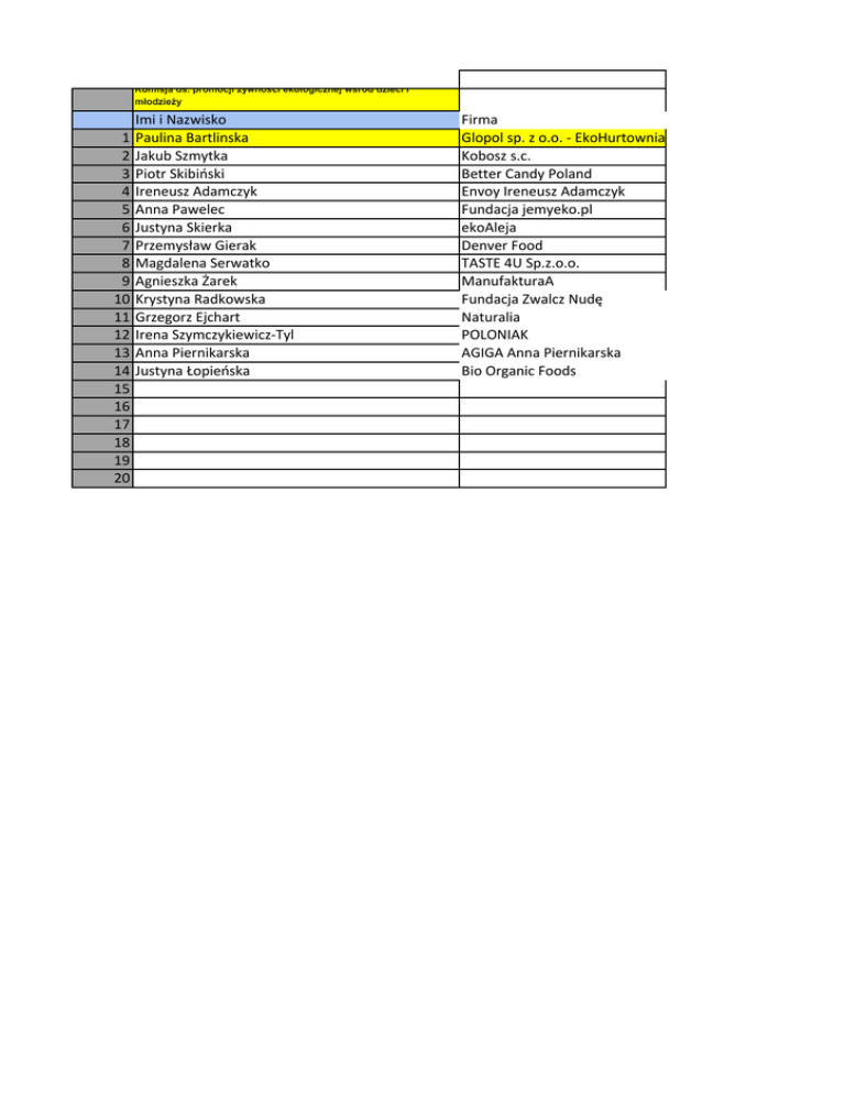 Komisja ds. promocji żywności ekologicznej wśród dzieci i młodzieży 1 2 3 4 5 6 7 8 9 10 11 12 13 14 15 16 17 18 19 20 Imi i Nazwisko Paulina Bartlinska Jakub Szmytka Piotr Skibiński Ireneusz Adamczyk Anna Pawelec Justyna Skierka Przemysław Gierak Magdalena Serwatko Agnieszka Żarek Krystyna Radkowska Grzegorz Ejchart Irena Szymczykiewicz-Tyl Anna Piernikarska Justyna Łopieńska Firma Glopol sp. z o.o. - EkoHurtownia.pl Kobosz s.c. Better Candy Poland Envoy Ireneusz Adamczyk Fundacja jemyeko.pl ekoAleja Denver Food TASTE 4U Sp.z.o.o. ManufakturaA Fundacja Zwalcz Nudę Naturalia POLONIAK AGIGA Anna Piernikarska Bio Organic Foods Adres e-mail [email protected] [email protected] [email protected] [email protected] [email protected] [email protected] [email protected] [email protected] [email protected] [email protected] [email protected] [email protected] [email protected] [email protected] [email protected]