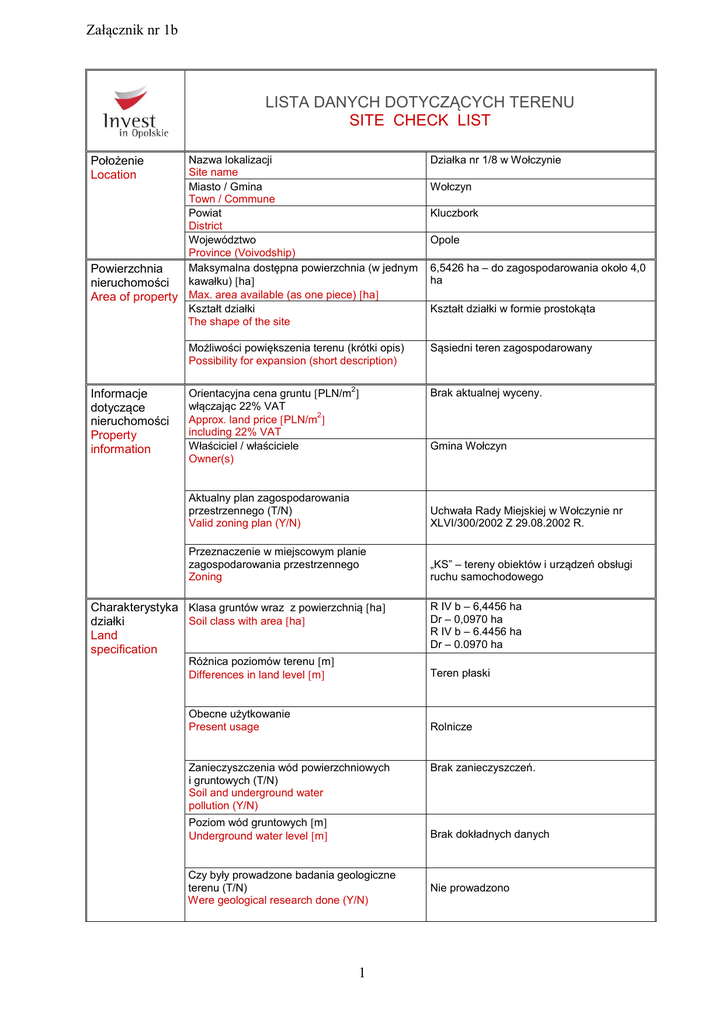 Załącznik nr 1b LISTA DANYCH DOTYCZĄCYCH TERENU SITE CHECK LIST Położenie Location Nazwa lokalizacji Site name Miasto / Gmina Town / Commune Powiat District Województwo Province (Voivodship) Maksymalna dostępna powierzchnia (w jednym Powierzchnia kawałku) ha nieruchomości Area of property Max. area available (as one piece) ha Kształt działki The shape of the site Informacje dotyczące nieruchomości Property information Działka nr 1/8 w Wołczynie Wołczyn Kluczbork Opole 6,5426 ha – do zagospodarowania około 4,0 ha Kształt działki w formie prostokąta Możliwości powiększenia terenu (krótki opis) Possibility for expansion (short description) Sąsiedni teren zagospodarowany Orientacyjna cena gruntu PLN/m włączając 22% VAT 2 Approx. land price PLN/m including 22% VAT Właściciel / właściciele Owner(s) Brak aktualnej wyceny. 2 Gmina Wołczyn Aktualny plan zagospodarowania przestrzennego (T/N) Valid zoning plan (Y/N) Uchwała Rady Miejskiej w Wołczynie nr XLVI/300/2002 Z 29.08.2002 R. Przeznaczenie w miejscowym planie zagospodarowania przestrzennego Zoning „KS” – tereny obiektów i urządzeń obsługi ruchu samochodowego Charakterystyka Klasa gruntów wraz z powierzchnią ha Soil class with area ha działki Land specification R IV b – 6,4456 ha Dr – 0,0970 ha R IV b – 6.4456 ha Dr – 0.0970 ha Różnica poziomów terenu m Differences in land level m Teren płaski Obecne użytkowanie Present usage Rolnicze Zanieczyszczenia wód powierzchniowych i gruntowych (T/N) Soil and underground water pollution (Y/N) Poziom wód gruntowych m Underground water level m Brak zanieczyszczeń. Brak dokładnych danych Czy były prowadzone badania geologiczne terenu (T/N) Were geological research done (Y/N) 1 Nie prowadzono Załącznik nr 1b Ryzyko wystąpienia zalań lub obsunięć terenu (T/N) Risk of flooding or land slide (Y/N) Połączenia transportowe Transport links Istniejąca infrastruktura Existing infrastructure Brak Przeszkody podziemne (T/N) Underground obstacles (Y/N) Nie wystepują Przeszkody występujące na powierzchni terenu (T/N) Ground and overhead obstacles (Y/N) Nie wystepują Istniejące ograniczenia ekologiczne (T/N) Ecological restrictions (Y/N) Brak Budynki i zabudowania na terenie (T/N) Buildings / other constructions on site (Y/N) Bez zabudowań. Droga dojazdowa do terenu (rodzaj drogi i jej szerokość) Access road to the plot (type and width of access road) Wyjazd z drogi powiatowej – ul. Szymonkowska Autostrada / droga krajowa km Nearest motorway / national road km Droga krajowa 500 m Porty rzeczne i morskie w odległości do 200 km Sea and river ports located up to 200 km Port rzeczny Opole – 50 km Port rzeczny K-Kożle – 100 km Kolej km Railway line km 3.0 km Bocznica kolejowa km Railway siding km 3.0 km Najbliższe lotnisko międzynarodowe km Nearest international airport km Wrocław – 100 km Katowice – 100 km Najbliższe miasto wojewódzkie km Nearest province capital km Opole – 50 km Elektryczność na terenie (T/N) Electricity (Y/N) Tak Odległość przyłącza od granicy terenu Connection point (distance from boundary) m Napięcie Voltage kV Dostępna moc Available capacity MW Na warunkach ZE Gaz na terenie (T/N) Gas (Y/N) 200 m Nie Odległość przyłącza od granicy działki Connection point (distance from boundary) m 2 Załącznik nr 1b Wartość kaloryczna 3 Calorific value MJ/Nm Średnica rury Pipe diameter mm Dostępna objętość 3 Available capacity Nm /h Woda na terenie (T/N) Water supply (Y/N) Tak Odległość przyłącza od granicy terenu Connection point (distance from boundary) m Dostępna objętość 3 Available capacity m /24h Kanalizacja na terenie (T/N) Sewage discharge (Y/N) Na zasadach ZWiK Tak Odległość przyłącza od granicy terenu Connection point (distance from boundary) m Dostępna objętość 3 Available capacity m /24h Oczyszczalnia ścieków na terenie bądź w bezpośrednim sąsiedztwie Treatment plant (Y/N) Telefony (T/N) Telephone (Y/N) 100 m Odległość przyłącza od granicy terenu Connection point (distance from boundary) m 100 m Na zasadach ZWiK Miejska oczyszczalnia. Tak 200 m Uwagi Comments Imię, nazwisko, stanowisko, tel., tel. komórkowy, e-mail, znajomość języków obcych Osoba przygotowująca ofertę Bogdan Zając Podinspektor Referatu Rozwoju Gospodarczego, Promocji I Integracji Europejskiej tel; 77 4188 340 w. 230; e-mail: [email protected] Offer prepared by Imię, nazwisko, stanowisko, tel., tel. komórkowy, e-mail, znajomość języków obcych Osoby do kontaktu Contact person Marcin Dłubak Naczelnik Wydziału Rolnictwa i Gospodarki Gruntami 77 4 188 340 w. 213; e-mail: [email protected] Wymagane załączniki: Required enclosures: Mapki terenu (włączając infrastrukturę na terenie i sieć połączeń transportowych); Maps of plot (including infrastructure on plot and transport links); 5-10 dobrej jakości zdjęć, dających pełny obraz terenu; 5-10 high-quality photographs giving full view of plot; Zdjęcia lotnicze (o ile są); Aerial photographs (if available). 3