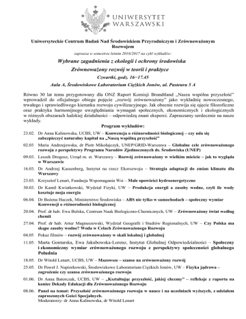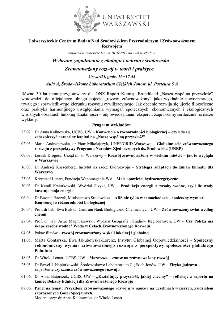 Uniwersyteckie Centrum Badań Nad Środowiskiem Przyrodniczym i Zrównoważonym Rozwojem zaprasza w semestrze letnim 2016/2017 na cykl wykładów: Wybrane zagadnienia z ekologii i ochrony środowiska Zrównoważony rozwój w teorii i praktyce Czwartki, godz. 16−17.45 Aula A, Środowiskowe Laboratorium Ciężkich Jonów, ul. Pasteura 5 A Równo 30 lat temu przygotowany dla ONZ Raport Komisji Brundtland „Nasza wspólna przyszłość” wprowadził do oficjalnego obiegu pojęcie „rozwój zrównoważony” jako wykładnię nowoczesnego, trwałego i sprawiedliwego kierunku rozwoju cywilizacyjnego. Jak obecnie rozwija się ujęcie filozoficzne oraz praktyka harmonijnego uwzględniania wymagań społecznych, ekonomicznych i ekologicznych w różnych obszarach ludzkiej działalności – odpowiedzą znani eksperci. Zapraszamy serdecznie na nasze wykłady. Program wykładów: 23.02. Dr Anna Kalinowska, UCBS, UW – Konwencja o różnorodności biologicznej – czy uda się zabezpieczyć naturalny kapitał na „Naszą wspólną przyszłość” 02.03 Maria Andrzejewska, dr Piotr Mikołajczyk, UNEP/GRID-Warszawa – Globalne cele zrównoważonego rozwoju z perspektywy Programu Narodów Zjednoczonych ds. Środowiska (UNEP) 09.03. Leszek Drogosz, Urząd m. st. Warszawy – Rozwój zrównoważony w wielkim mieście – jak to wygląda w Warszawie 16.03. Dr Andrzej Kassenberg, Instytut na rzecz Ekorozwoju – Strategia adaptacji do zmian klimatu dla Warszawy 23.03. Krzysztof Lenart, Fundacja Wspomagania Wsi – Małe opowieści hydroenergetyczne 30.03. Dr Kamil Kwiatkowski, Wydział Fizyki, UW – Produkcja energii a zasoby wodne, czyli ile wody kosztuje moja energia 06.04. Dr Bożena Haczek, Ministerstwo Środowiska – ABS nie tylko w samochodach – społeczny wymiar Konwencji o różnorodności biologicznej 20.04. Prof. dr hab. Ewa Bulska, Centrum Nauk Biologiczno-Chemicznych, UW – Zrównoważony świat według chemii 27.04. Prof. dr hab. Artur Magnuszewski, Wydział Geografii i Studiów Regionalnych, UW – Czy Polska ma skąpe zasoby wodne? Woda w Celach Zrównoważonego Rozwoju 04.05 Pokaz filmów – rozwój zrównoważony w skali lokalnej i globalnej 11.05. Marta Gontarska, Ewa Jakubowska-Lorenz, Instytut Globalnej Odpowiedzialności – Społeczny i ekonomiczny wymiar zrównoważonego rozwoju z perspektywy społeczności globalnego Południa 18.05. Dr Witold Lenart, UCBS, UW – Mazowsze – szanse na zrównoważony rozwój 25.05. Dr Paweł J. Napiorkowski, Środowiskowe Laboratorium Ciężkich Jonów, UW – Fizyka jądrowa – zagrożenie czy szansa zrównoważonego rozwoju 01.06. Dr Anna Batorczak, UCBS, UW – „Kształtując przyszłość, jakiej chcemy” – refleksje z raportu na koniec Dekady Edukacji dla Zrównoważonego Rozwoju 08.06. Panel na temat: Przyszłość zrównoważonego rozwoju w nauce i na uczelniach wyższych, z udziałem zaproszonych Gości Specjalnych. Moderatorzy: dr Anna Kalinowska, dr Witold Lenart