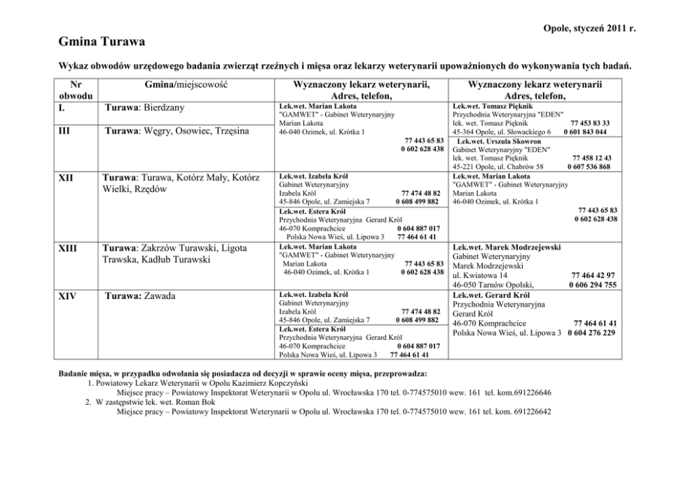 Opole, styczeń 2011 r. Gmina Turawa Wykaz obwodów urzędowego badania zwierząt rzeźnych i mięsa oraz lekarzy weterynarii upowaŜnionych do wykonywania tych badań. Gmina/miejscowość Nr obwodu I. Turawa: Bierdzany III Turawa: Węgry, Osowiec, Trzęsina Wyznaczony lekarz weterynarii, Adres, telefon, Lek.wet. Marian Lakota "GAMWET" - Gabinet Weterynaryjny Marian Lakota 46-040 Ozimek, ul. Krótka 1 77 443 65 83 0 602 628 438 XII Turawa: Turawa, Kotórz Mały, Kotórz Wielki, Rzędów XIII Turawa: Zakrzów Turawski, Ligota Trawska, Kadłub Turawski XIV Turawa: Zawada Lek.wet. Izabela Król Gabinet Weterynaryjny Izabela Król 77 474 48 82 45-846 Opole, ul. Zamiejska 7 0 608 499 882 Lek.wet. Estera Król Przychodnia Weterynaryjna Gerard Król 46-070 Komprachcice 0 604 887 017 Polska Nowa Wieś, ul. Lipowa 3 77 464 61 41 Lek.wet. Marian Lakota "GAMWET" - Gabinet Weterynaryjny Marian Lakota 77 443 65 83 46-040 Ozimek, ul. Krótka 1 0 602 628 438 Lek.wet. Izabela Król Gabinet Weterynaryjny Izabela Król 77 474 48 82 45-846 Opole, ul. Zamiejska 7 0 608 499 882 Lek.wet. Estera Król Przychodnia Weterynaryjna Gerard Król 46-070 Komprachcice 0 604 887 017 Polska Nowa Wieś, ul. Lipowa 3 77 464 61 41 Wyznaczony lekarz weterynarii Adres, telefon, Lek.wet. Tomasz Pięknik Przychodnia Weterynaryjna "EDEN" lek. wet. Tomasz Pięknik 77 453 83 33 45-364 Opole, ul. Słowackiego 6 0 601 843 044 Lek.wet. Urszula Skowron Gabinet Weterynaryjny "EDEN" lek. wet. Tomasz Pięknik 77 458 12 43 45-221 Opole, ul. Chabrów 58 0 607 536 868 Lek.wet. Marian Lakota "GAMWET" - Gabinet Weterynaryjny Marian Lakota 46-040 Ozimek, ul. Krótka 1 77 443 65 83 0 602 628 438 Lek.wet. Marek Modrzejewski Gabinet Weterynaryjny Marek Modrzejewski ul. Kwiatowa 14 77 464 42 97 46-050 Tarnów Opolski, 0 606 294 755 Lek.wet. Gerard Król Przychodnia Weterynaryjna Gerard Król 46-070 Komprachcice 77 464 61 41 Polska Nowa Wieś, ul. Lipowa 3 0 604 276 229 Badanie mięsa, w przypadku odwołania się posiadacza od decyzji w sprawie oceny mięsa, przeprowadza: 1. Powiatowy Lekarz Weterynarii w Opolu Kazimierz Kopczyński Miejsce pracy – Powiatowy Inspektorat Weterynarii w Opolu ul. Wrocławska 170 tel. 0-774575010 wew. 161 tel. kom.691226646 2. W zastępstwie lek. wet. Roman Bok Miejsce pracy – Powiatowy Inspektorat Weterynarii w Opolu ul. Wrocławska 170 tel. 0-774575010 wew. 161 tel. kom. 691226642