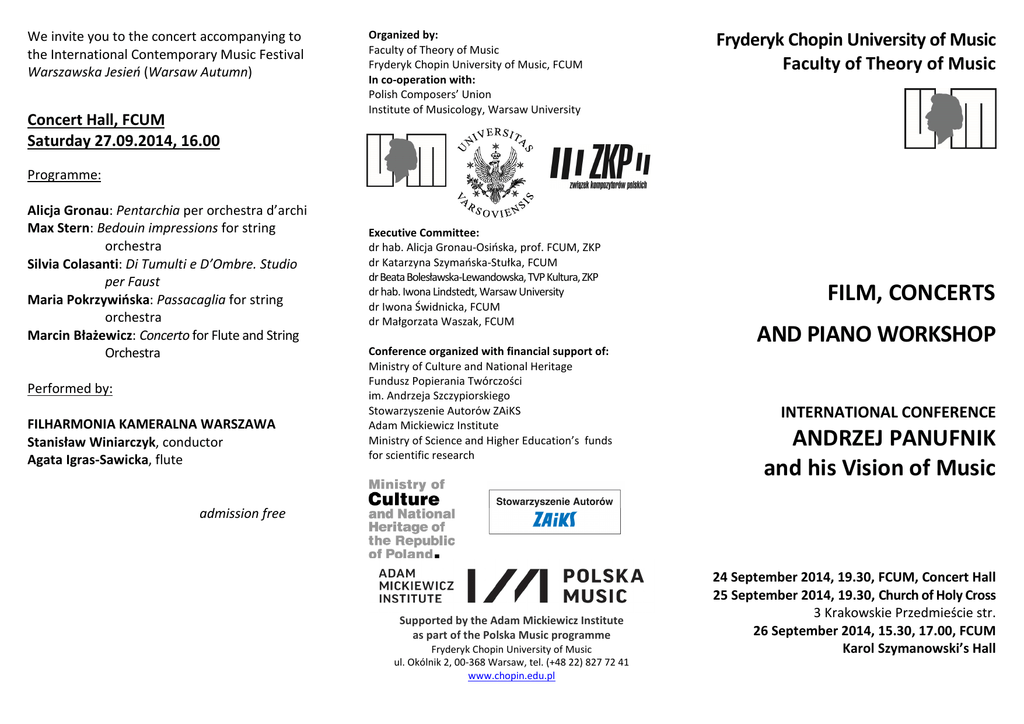 We invite you to the concert accompanying to the International Contemporary Music Festival Warszawska Jesień (Warsaw Autumn) Concert Hall, FCUM Saturday 27.09.2014, 16.00 Organized by: Faculty of Theory of Music Fryderyk Chopin University of Music, FCUM In co-operation with: Polish Composers’ Union Institute of Musicology, Warsaw University Fryderyk Chopin University of Music Faculty of Theory of Music Programme: Alicja Gronau: Pentarchia per orchestra d’archi Max Stern: Bedouin impressions for string orchestra Silvia Colasanti: Di Tumulti e D’Ombre. Studio per Faust Maria Pokrzywińska: Passacaglia for string orchestra Marcin Błażewicz: Concerto for Flute and String Orchestra Performed by: FILHARMONIA KAMERALNA WARSZAWA Stanisław Winiarczyk, conductor Agata Igras-Sawicka, flute Executive Committee: dr hab. Alicja Gronau-Osińska, prof. FCUM, ZKP dr Katarzyna Szymańska-Stułka, FCUM dr Beata Bolesławska-Lewandowska, TVP Kultura, ZKP dr hab. Iwona Lindstedt, Warsaw University dr Iwona Świdnicka, FCUM dr Małgorzata Waszak, FCUM Conference organized with financial support of: Ministry of Culture and National Heritage Fundusz Popierania Twórczości im. Andrzeja Szczypiorskiego Stowarzyszenie Autorów ZAiKS Adam Mickiewicz Institute Ministry of Science and Higher Education’s funds for scientific research FILM, CONCERTS AND PIANO WORKSHOP INTERNATIONAL CONFERENCE ANDRZEJ PANUFNIK and his Vision of Music admission free Supported by the Adam Mickiewicz Institute as part of the Polska Music programme Fryderyk Chopin University of Music ul. Okólnik 2, 00-368 Warsaw, tel. (+48 22) 827 72 41 www.chopin.edu.pl 24 September 2014, 19.30, FCUM, Concert Hall 25 September 2014, 19.30, Church of Holy Cross 3 Krakowskie Przedmieście str. 26 September 2014, 15.30, 17.00, FCUM Karol Szymanowski’s Hall 24 September 2014, Wednesday, FCUM 2 Okólnik str. 15.30-16.30 Karol Szymanowski’s Hall Presentation of the film My Father, the Iron Curtain and me, dir. Krzysztof Rzączyński (in cooperation with TVP Kultura) 19.30, Concert Hall 1st Chamber Music Concert “Andrzej Panufnik and his contemporaries” Programme: Roxanna Panufnik Mine Eye (W. Shakespeare) Sweet Love Remember’d (W. Shakespeare) Andrzej Panufnik Love song (P. Sydney) Andrzej i Roxanna Panufnik Modlitwa Monika Kędziora E.D. – Monodram (E. Dickinson) Alicja Gronau Zwei selbstverfasste Lieder Das Bedauern (Żal) Das Schmerz (Ból) Paweł Szymański Drei Lieder nach Trakl Ein Traum (Sen) Vorübergehenden (Przechodzącej) Im Herbst (Jesienią) Performed by: Lilianna Zalesińska – mezzo-soprano Piotr Szymanowicz – piano 25 September 2014, Thursday 19.30, Church of Holy Cross 26 September 2014, Friday, FCUM 3 Krakowskie Przedmieście str. Karol Szymanowski’s Hall 2nd Chamber Music Concert “Andrzej Panufnik and his contemporaries” 15.30-16.30 Programme: Andrzej Panufnik Song to the Virgin Mary Roxanna Panufnik Douai Missa Brevis Saint Pancras Magnificat & Nunc dimittis Roman Padlewski Dwa motety Witold Lutosławski Lord Tennyson Song Henryk Mikołaj Górecki Totus tuus Andrzej Koszewski Zdrowaś Królewno wyborna Paweł Łukaszewski O vos omnes Miłosz Bembinow Beatus Servus Andrzej Borzym jr Agnus Dei Performed by: proMODERN Łucja Szablewska – soprano Ewa Puchalska – mezzo-soprano Elżbieta Wróblewska – mezzo-soprano Andrzej Marusiak – tenor Artur Janda – bass baritone Piotr Pieron – bass 2 Okólnik str. Piano Workshop Dr Clare Hammond Twelve Miniature Studies (Krąg kwintowy) of Andrzej Panufnik 17.00-18.00 Concert of Andrzej Panufnik’s piano music performed by Clare Hammond Programme: Twelve Miniature Studies (Krąg kwintowy) Reflections Pentasonata 18.00 Closing of the INTERNATIONAL CONFERENCE “ANDRZEJ PANUFNIK AND HIS VISION OF MUSIC”