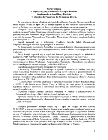 Sprawozdanie z międzysesyjnej działalności Zarządu Powiatu i wykonania uchwał Rady Powiatu w okresie od 27 czerwca do 30 sierpnia 2013 r. W omawianym okresie odbyło się pięć posiedzeń Zarządu Powiatu. Pierwsze posiedzenie miało miejsce w dniu 11 lipca 2013r. Zarząd uzgodnił na nim wysokość odszkodowania za grunty w Jabłonce przeznaczone pod drogę powiatową, określonego w nowym operacie. Następnie Zarząd uzyskał informację o podpisanej ugodzie administracyjnej w sprawie ustalenia na rzecz Powiatu Nidzickiego odszkodowania za grunty położone w Obrębie Kozłowo, przeznaczone pod rozbudowę drogi wojewódzkiej nr 545, które z mocy prawa przeszły na własność Samorządu Województwa Warmińsko- Mazurskiego. Zgodnie z ugodą do budżetu powiatu wpłynie 2.121 zł. Zarząd zapoznał się z informacją Dyrektora Zespołu Szkół Zawodowych i Ogólnokształcących odnośnie wynajmu pokoi w internacie. W dalszej części posiedzenia Zarząd bez uwag uzgodnił projekt planu zagospodarowania przestrzennego części obrębu geodezyjnego Frąknowo, Gmina Nidzica dotyczącego elektrowni wiatrowej. Dalej Zarząd zapoznał się z wynikami kontroli przeprowadzonych w jednostkach podległych (PZD, PCPR) i w Starostwie Powiatowym, które zakończyły się pozytywnie. Następnie członkowie Zarządu zapoznali się z projektem budowy internetowej sieci szerokopasmowej Polski Wschodniej- Województwa Warmińsko- Mazurskiego oraz planami uruchomienia portalu internetowego pn. „Atlas Warmii i Mazur”. Zarząd zapoznał się również z następującymi wnioskami: - Wojewody Warmińsko- Mazurskiego w sprawie wprowadzenia korekty dotyczącej zmian klasyfikacji budżetowej oraz podziału ogólnej kwoty celowej z przeznaczeniem na dofinansowanie zadań realizowanych w ramach programu wieloletniego pn. „ Narodowy program Przebudowy Dróg Lokalnych- Etap II Bezpieczeństwo- Dostępność- Rozwój”. Wartość dotacji wynosi 209.225 zł; - Ministra Pracy i Polityki Społecznej w sprawie zwiększenia Środków Funduszu Pracy o 28.000 zł dla Powiatowego Urzędu Pracy w Nidzicy na rzecz promocji zatrudnienia, łagodzenia skutków bezrobocia i aktywizacji zawodowej dla bezrobotnych w szczególnej sytuacji na rynku pracy; - Dyrektora Miejsko-Gminnej Biblioteki Publicznej w Nidzicy o dofinansowanie VI Maratonu Kulturalnego – Nidzickich spotkań z książką i teatrem; - o pomocy finansowej dla Powiatu Nidzickiego w wysokości 1.500 zł z przeznaczeniem na dofinansowanie zakupu strojów dla uczennic biorących udział w paradzie orkiestry szkolnej ZSZiO w Nidzicy. Następne posiedzenie Zarządu odbyło się 17 lipca br. Podjęto na nim uchwałę Nr 294/2013 w sprawie powołania Komisji Konkursowej w celu przeprowadzenia konkursu na stanowisko Dyrektora Zespołu Szkół Rolniczych i Ogólnokształcących w Jagarzewie. Składała się ona z 9 członków: przewodnicząca - p. Elżbieta Bieniek oraz dwaj przedstawiciele Zarządu Powiatu w osobach: Robert Radzymiński i Jolanta Tymińska, 2 przedstawiciele Kuratorium Oświaty, przedstawiciel Rady Pedagogicznej ZSRiO, przedstawiciel Rady Rodziców ZSRiO, przedstawiciel Związku Nauczycielstwa Polskiego Zarządu Oddziału w Nidzicy, przedstawiciel Międzyzakładowej Organizacji Związkowej Pracowników Oświaty w Nidzicy. 1 Kolejne posiedzenie Zarządu odbyło się 30 lipca br. Przedmiotem obrad było podjęcie uchwał: Nr 295/2013 w sprawie zatwierdzenia wyników konkursu na stanowisko dyrektora Zespołu Szkół Rolniczych i Ogólnokształcących w Jagarzewie, Nr 296/2013 w sprawie zmian w budżecie powiatu na rok 2013. Ponadto członkowie Zarządu na wniosek Burmistrza Nidzicy uzgodnili projekt miejscowego planu zagospodarowania przestrzennego w części obrębów geodezyjnych Grzegórzki – Bartoszki - Waszulki w Gminie Nidzica. Plan realizowany jest z myślą budowy elektrowni wiatrowych. Następnie Zarząd przyjął informację o wynajmie nieruchomości przez dyrektora Zespołu Szkół Ogólnokształcących. Dalej, Zarząd przyjął informację o wszczęciu postępowania w sprawie wydania decyzji o pozwoleniu na rozbudowę budynku szpitala. Na posiedzeniu tym omówiono również wniosek firmy przewozowej o udostępnienie drogi wewnętrznej przy ulicy Kolejowej. Firma została wezwana do uzupełnienia wniosku. Posiedzenie zakończono omówieniem możliwości udziału w programie zdrowotnym pn. „Zdrowie jamy ustnej populacji polskiej”. Zarząd Powiatu zgodnie stwierdził, że jest potrzeba realizacji takiego programu, ale ze względu na trudną sytuację finansową samorząd nie jest w stanie go podjąć. Następne posiedzenie odbyło się 20 sierpnia br. Omówiono na nim projekty uchwał Rady Powiatu w sprawach: 1) zmian w budżecie powiatu na rok 2013, 2) udzielenia pomocy finansowej dla Gminy Nidzica, 3) zmiany uchwały Nr XXV/193/2013 Rady Powiatu w Nidzicy z dnia 22 lutego 2013 r. w sprawie udzielenia pomocy finansowej dla Gminy Nidzica, 4) zmiany uchwały w sprawie podziału środków na 2013 rok przyznanych samorządowi powiatowemu przez Państwowy Fundusz Rehabilitacji Osób Niepełnosprawnych na zadania z zakresu rehabilitacji zawodowej i społecznej osób niepełnosprawnych, 5) obniżenia opłat za wydanie nowego dowodu rejestracyjnego pojazdu dla osób zamieszkałych w miejscowości Kozłowo obowiązanych do ubiegania się o nowy dowód rejestracyjny z powodu zmiany administracyjnej, 6) wyrażenia zgody na oddanie w najem sal dydaktycznych stanowiących własność Powiatu Nidzickiego, będących w trwałym zarządzie Zespołu Szkół Ogólnokształcących w Nidzicy, 7) wyrażenia zgody na nabycie nieruchomości gruntowej do powiatowego zasobu nieruchomości, 8) wyrażenia zgody na oddanie w najem sali gimnastycznej przy Zespole Szkół Ogólnokształcących w Nidzicy, stanowiącej własność Powiatu Nidzickiego, będącej w trwałym zarządzie Zespołu Szkół Ogólnokształcących w Nidzicy, 9) przekazania skargi do Komisj