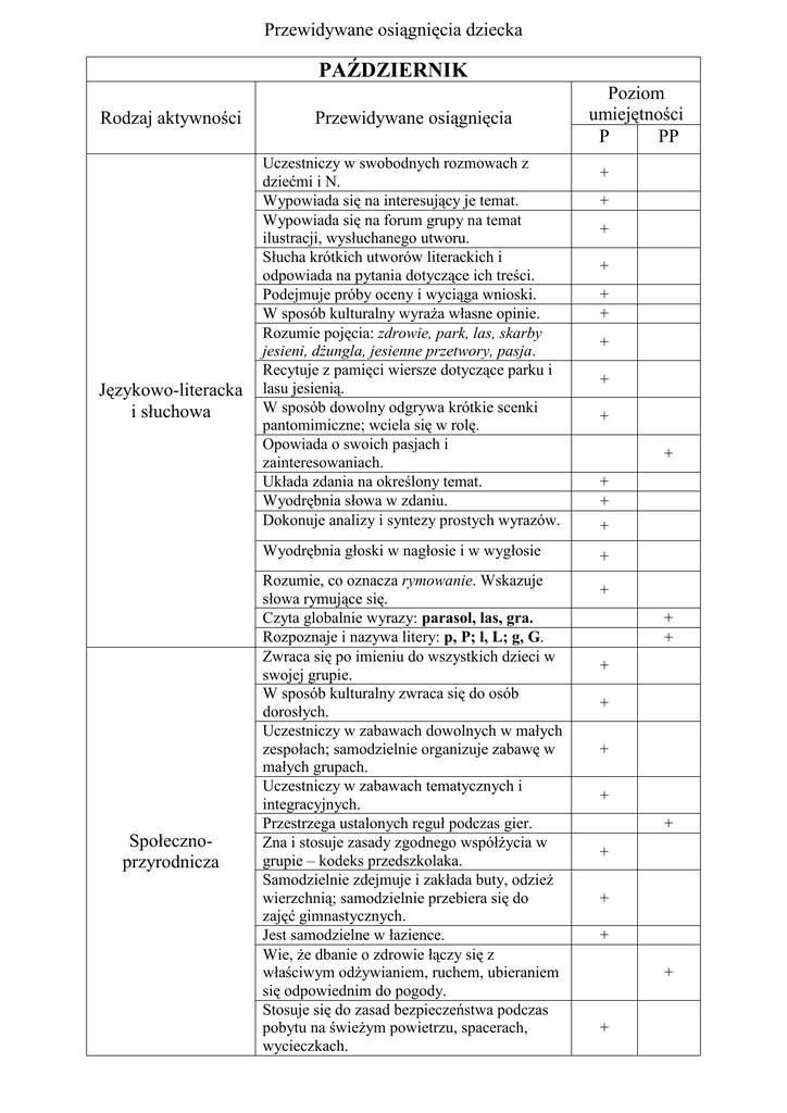 Przewidywane osiągnięcia dziecka PAŹDZIERNIK Rodzaj aktywności Językowo-literacka i słuchowa Przewidywane osiągnięcia Uczestniczy w swobodnych rozmowach z dziećmi i N. Wypowiada się na interesujący je temat. Wypowiada się na forum grupy na temat ilustracji, wysłuchanego utworu. Słucha krótkich utworów literackich i odpowiada na pytania dotyczące ich treści. Podejmuje próby oceny i wyciąga wnioski. W sposób kulturalny wyraża własne opinie. Rozumie pojęcia: zdrowie, park, las, skarby jesieni, dżungla, jesienne przetwory, pasja. Recytuje z pamięci wiersze dotyczące parku i lasu jesienią. W sposób dowolny odgrywa krótkie scenki pantomimiczne; wciela się w rolę. Opowiada o swoich pasjach i zainteresowaniach. Układa zdania na określony temat. Wyodrębnia słowa w zdaniu. Dokonuje analizy i syntezy prostych wyrazów. Wyodrębnia głoski w nagłosie i w wygłosie Społecznoprzyrodnicza Rozumie, co oznacza rymowanie. Wskazuje słowa rymujące się. Czyta globalnie wyrazy: parasol, las, gra. Rozpoznaje i nazywa litery: p, P; l, L; g, G. Zwraca się po imieniu do wszystkich dzieci w swojej grupie. W sposób kulturalny zwraca się do osób dorosłych. Uczestniczy w zabawach dowolnych w małych zespołach; samodzielnie organizuje zabawę w małych grupach. Uczestniczy w zabawach tematycznych i integracyjnych. Przestrzega ustalonych reguł podczas gier. Zna i stosuje zasady zgodnego współżycia w grupie – kodeks przedszkolaka. Samodzielnie zdejmuje i zakłada buty, odzież wierzchnią; samodzielnie przebiera się do zajęć gimnastycznych. Jest samodzielne w łazience. Wie, że dbanie o zdrowie łączy się z właściwym odżywianiem, ruchem, ubieraniem się odpowiednim do pogody. Stosuje się do zasad bezpieczeństwa podczas pobytu na świeżym powietrzu, spacerach, wycieczkach. Poziom umiejętności P PP + + + + + + + + + + + + + + + + + + + + + + + + + + + Potrafi wskazać ubrania stosowne do pogody. Rozpoznaje przedstawicieli służb medycznych: lekarza, stomatologa, pielęgniarkę. Określa rolę przedstawicieli służb medycznych: lekarza, stomatologa, pielęgniarki. Orientuje się do kogo należy się zwrócić o pomoc w sytuacji zagrożenia. Zna alarmowe numery telefonów. Obserwuje najbliższe otoczenie i wypowiada się na temat swoich obserwacji. Dokonuje porównania wyglądu parku i lasu jesienią oraz w innych porach roku. Wymienia i wskazuje części lasu. Dostrzega i nazywa zmiany zachodzące jesienią w przyrodzie. Różnicuje drzewa liściaste i iglaste. + + + + + + + + + Nazywa niektóre gatunki drzew i ich owoce; zna niektóre gatunki grzybów. Przyrządza pod nadzorem dorosłych proste przetwory. Wymyśla zasady gier i zabaw. Matematyczna Plastyczno- Wie, w jaki sposób ludzie i zwierzęta przygotowują się do zimy. Orientuje się na kartce papieru; wskazuje górę i dół, lewą i prawą stronę kartki. Wskazuje serce i w odniesieniu do niego stronę prawą i lewą; lewą rękę oznacza za pomocą frotki. Posługuje się wyrażeniami: na, nad, pod, obok, wysoko, nisko w sytuacjach zadaniowych. Wskazuje i nazywa części swojego ciała i drugiej osoby. Wymienia podobieństwa i różnice pomiędzy dwoma przedmiotami. Klasyfikuje przedmioty ze względu na jedną cechę. Dokonuje uogólnienia sklasyfikowanych przedmiotów (dary sadu, dary lasu). Wyodrębnia pojęcia przeciwstawne. Wychwytuje powtarzające się sekwencje i kontynuuje rytm dwu, trzyelementowy. Przekłada dostrzeżoną regularność z jednej reprezentacji na drugą. Przelicza w dostępnym dla siebie zakresie. Rozpoznaje i nazywa cyfrę 1. Posługuje się liczebnikami porządkowymi. Obrazuje liczebność zbioru za pomocą zbiorów zastępczych; tworzy zbiory równoliczne. Konstruuje różnorodne budowle przestrzenne z klocków według własnego pomysłu. + + + + + + + + + + + + + + + + + + + techniczna i grafomotoryczna Muzyczna Ruchowozdrowotna Prawidłowo trzyma narzędzie malarskie i pisarskie. Rysuje i maluje na dowolny temat. Komponuje makietę lasu. Lepi z plasteliny, modeliny i innych mas plastycznych. Komponuje obrazki z wykorzystaniem materiałów przyrodniczych. Swobodnie posługuje się kredkami. Koloruje rysunki konturowe. Rysuje w tunelu i po śladzie zgodnie ze wskazanym kierunkiem. Podaje nazwy kolorów, które należy zmieszać, by powstał kolor zielony i pomarańczowy; nazywa kolory powstałe w wyniku zmieszania farb. Tworzy pracę plastyczną w małym zespole – tworzy kompozycje z przygotowanych elementów. Kreśli według wzoru linie ornamenty na tabliczce sucho ścieralnej. Odwzorowuje według wzoru litery: p, l, g oraz cyfrę 1 na tabliczce suchościeralnej bez liniatury. Śpiewa piosenki o lesie, parku i zdrowiu w grupie i indywidualnie. Uczestniczy w zabawach tanecznych – reaguje ruchem na zmiany dynamiki, tempa i wysokości dźwięków utworu muzycznego. Odtwarza rytm podany przez N. Uczestniczy w zabawach ruchowych i ćwiczeniach gimnastycznych. Stara się w sposób dokładny naśladować N. w wykonywaniu ćwiczeń. Doskonali sprawność motoryczną (szybkość, siłę, skoczność), umiejętność rzutu do celu i umiejętność współpracy w grupie podczas wykonywania ćwiczeń gimnastycznych. Właściwie reaguje na umówione wcześniej sygnały wzrokowe, dźwiękowe w zabawach ruchowych. Bawi się na przedszkolnym placu zabaw z wykorzystaniem sprzętu terenowego w sposób bezpieczny. Odczytuje sens informacji na niektórych reklamach i znakach. Wie, jak należy dbać o własne zdrowie. Wie, dlaczego należy spożywać surowe owoce i warzywa. Potrafi wezwać pomoc z wykorzystaniem numeru 112. Przygotowuje potrawy pod nadzorem N. i serwuje innym. + + + + + + + + + + + + + + + + + + + + + + + + +