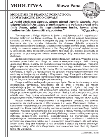MODLITWA MODLIĆ SIĘ TO PRAGNĄĆ POZNAĆ BOGA I DOŚWIADCZYĆ JEGO CHWAŁY „I rzekł Mojżesz: Spraw, abym ujrzał Twoją chwałę. Pan odpowiedział: Ja ukażę ci mój majestat i ogłoszę przed tobą imię Pana, gdyż Ja wyświadczam łaskę, komu chcę, i miłosierdzie, komu Mi się podoba.” Wj 33,18-19 Ten fragment z Księgi Wyjścia, to jeden z najpiękniejszych i najgłębszych tekstów biblijnych na temat modlitwy. To, że Bóg dał się poznać Mojżeszowi sprawiło, że coraz bardziej wzmagała się jego tęsknota za Bogiem. Prośba Mojżesza nie tyle wyraża ciekawość, ile ukazuje głębokie pragnienie doświadczania obecności Boga. Mojżesz chce widzieć chwałę Boga, dlatego że zależy mu na coraz większej bliskości z Nim. Bóg mógłby ukazać się Mojżeszowi w taki sposób, żeby dostrzegł Go zmysłami. Nie czyni tak, dlatego, że zmysły są przydatne w postrzeganiu świata materialnego, Bóg natomiast jest istotą duchową. Żaden człowiek nie jest w stanie zgłębić tego, kim jest Bóg. Wszelkie próby opisania przez ludzi cech Boga są zawsze niewystarczające. Jeśli chcemy „zobaczyć” Boga, musimy się posłużyć swoją wrażliwością duchową. Poznanie Boga wiąże się bezpośrednio z otwarciem się na Jego miłość. Sama wiedza o Bogu nie znaczy jeszcze, że Go znamy. Można bowiem wiele wiedzieć o Jezusie Chrystusie, a nigdy Go rzeczywiście nie spotkać; można obronić niejeden tytuł naukowy, opierając się na wiedzy o Chrystusie i Jego Ewangelii, a Go nie znać. Można iść za Nim i Go znać jedynie powierzchownie, intelektualnie, teoretycznie. Ujrzeć Boga na ziemi można tylko poprzez wiarę. Droga modlitwy to długa droga naszego życia. Nieraz ludzie mają za sobą dwadzieścia, trzydzieści, czterdzieści lat tej drogi i wiedzą, że rzeczą najważniejszą jest to, żeby nigdy się nie zniechęcić, nigdy z tej drogi nie zrezygnować. „Modlitwa jest pragnieniem poznania Boga, przylgnięciem do Niego, przede wszystkim jest ona Jego darem i łaską. Łaska jest pomocą, jakiej udziela nam Bóg, byśmy odpowiedzieli na nasze powołanie i stali się Jego przybranymi synami. Wprowadza nas w wewnętrzne życie Trójcy św.” (KKK 2021) Każda modlitwa, ta wspólnotowa i ta najbardziej osobista, ma zawsze prowadzić do zjednoczenia z Chrystusem i z Jego Mistycznym Ciałem – Kościołem – wspólnotą ludzi wierzących. Jest to jednak łączność bardzo poufna, wewnętrzna, która zachodzi między sercem człowieka a sercem Boga. Ludzie Starego i Nowego Testamentu nie bali się prosić o rzeczy wielkie. Nam może się wydawać, że tak mogą się modlić tylko święci i dlatego nasze modlitwy najczęściej dotyczą codziennych potrzeb, pozostawiając na marginesie rzeczy najważniejsze. Jesteśmy materialni, banalni w naszych modlitwach. Uwielbienie przecież nie koniecznie wiąże się z uniesieniem emocjonalnym, ale jest raczej aktem wiary. Bóg zna każdego z nas osobiście i cieszy się nawet skromnym wysiłkiem osoby, która chce Go poznać. Jest stale obok nas i chce się objawić temu, kto Go szuka. CZERWIEC 2012 MODLITWA W Chrystusie chwała Boga przybrała cielesną postać, Bóg dał się poznać człowiekowi. Realnie obecny jest w Eucharystii. Adorując Najświętszy Sakrament, rozważając słowa Pisma św. szczególnie doświadczamy obecności Boga. Dostępność i prostota Słowa Pana i Chleba Życia zaskakuje. Efektem oglądania chwały Bożej jest przemiana duszy. Człowiek zaczyna promieniować tym doświadczeniem, podobnie jak Mojżesz, którego skóra promieniowała po zejściu z Góry Synaj. Jak żyć tym słowem? Powinniśmy stale pragnąć poznawać Boga coraz lepiej i bliżej. „Dołóżmy starań aby poznać Pana” (Oz 6,3). Bez poznania Boga nie można poznać samego siebie. W tym celu warto podejmować konkretne działania: - częste uczestnictwo w Eucharystii – pogłębia naszą relację z Bogiem, sprawia że upodabniamy się do naszego Zmartwychwstałego Pana i przez to doświadczamy Jego chwały; - rozważanie Słowa Bożego – umacnia nas w wierze i oświetla drogi naszego życia; - regularna modlitwa – daje możliwość otrzymania łaski poznania Pana; - codzienny rachunek sumienia – kształtuje nas wewnętrznie; - poznawanie nauki Kościoła i przestrzeganie przykazań; - odkrywanie Bożego prowadzenia każdego dnia poprzez refleksję nad działaniem Boga w różnych wydarzeniach; - kontemplowanie obecności Boga w stworzeniach i w dziełach człowieka (w malarstwie, literaturze, pięknie przyrody itp.); - dostrzeganie Bożego działania w naszym życiu i w drugim człowieku. Poznanie Boga nie jest zarezerwowane tylko dla wąskiego grona wybrańców. Jest zaproszeniem dla każdego z nas, bo każdy jest przez Boga powołany do życia wiecznego. Grupa XXV Świadectwo Różnie było u mnie z modlitwą, zanim stała się ona jedną z ważniejszych rzeczy w moim życiu. Na początku moja modlitwa nie polegała raczej na spotkaniu się z Bogiem, a tylko na jednostronnym odmawianiu wielu różnych modlitw. Wiele czasu minęło, wiele różnych trudności i kłopotów doświadczyłem, zanim doszedłem do odkrycia, że modlitwa to przede wszystkim rozmowa z Bogiem i spotkanie się z Nim, a nie tylko mówienie do Niego. Dzisiaj widzę także, że wszelkie moje starania, żeby poznać Boga, nie odniosłyby żadnego skutku, gdyby to Bóg sam nie zechciał się dać mi poznać. Bez wytrwałości i wprowadzenia różnych zmian w swoim życiu, modlitwa niewątpliwie nie dawałaby mi zbyt wiele, ponieważ rzeczywiście „wiara bez uczynków jest martwa”. Dzięki modlitwie Bóg z kogoś dalekiego stał się dla mnie Kimś bliższym. Chwała za to Panu! Andrzej, Grupa XXV CZERWIEC 2012
