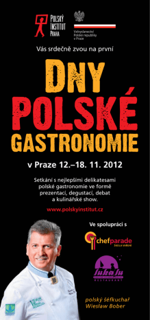 Velvyslanectví Polské republiky v Praze Vás srdečně zvou na první Dny POLSKÉ gastronomie v Praze 12.–18. 11. 2012 Setkání s nejlepšími delikatesami polské gastronomie ve formě prezentací, degustací, debat a kulinářské show. www.polskyinstitut.cz Ve spolupráci s polský šéfkuchař Wiesław Bober 12. 11. v 18.00 Prezentace a degustace polských medovin Polský institut v Praze, Malé nám. 1, Praha 1 12. 11. ve 20.00 ALEBROWAR! Gdaňský pivní večírek spojený s degustační přednáškou na téma nových pivních trendů v Polsku (vstupné 99,- Kč, www.republikazizkov.cz) Pivní kavárna Republika Žižkov, Koněvova 129, Praha 3 13. 11. v 18.00 Prezentace a degustace polských paštik Terravita, Pasáž Černá růže, Na Příkopě 12, Praha 1 14. 11. 12.00–18.00 Prezentace a degustace přírodních šáv Sok Maurera z Łącka Kvasnička z venkova, Koněvova 141, Praha 3 15. 11. v 18.00 Prezentace a degustace ekologických produktů z Dolního Slezska Polský institut v Praze, Malé nám. 1, Praha 1 16. 11. 11.00–22.00 Polský den v restauraci Luka Lu (menu na www.lukalu.cz) Luka Lu, Újezd 33, Praha 1 18. 11. v 17.00 Kurz polské kuchyně s jedním z předních polských šéfkuchařů Wiesławem Boberem (vstupné 299,- Kč, www.chefparade.cz) Holešovická tržnice, hala 36, Bubenské nábř. 306/13, Praha 7 Partneři