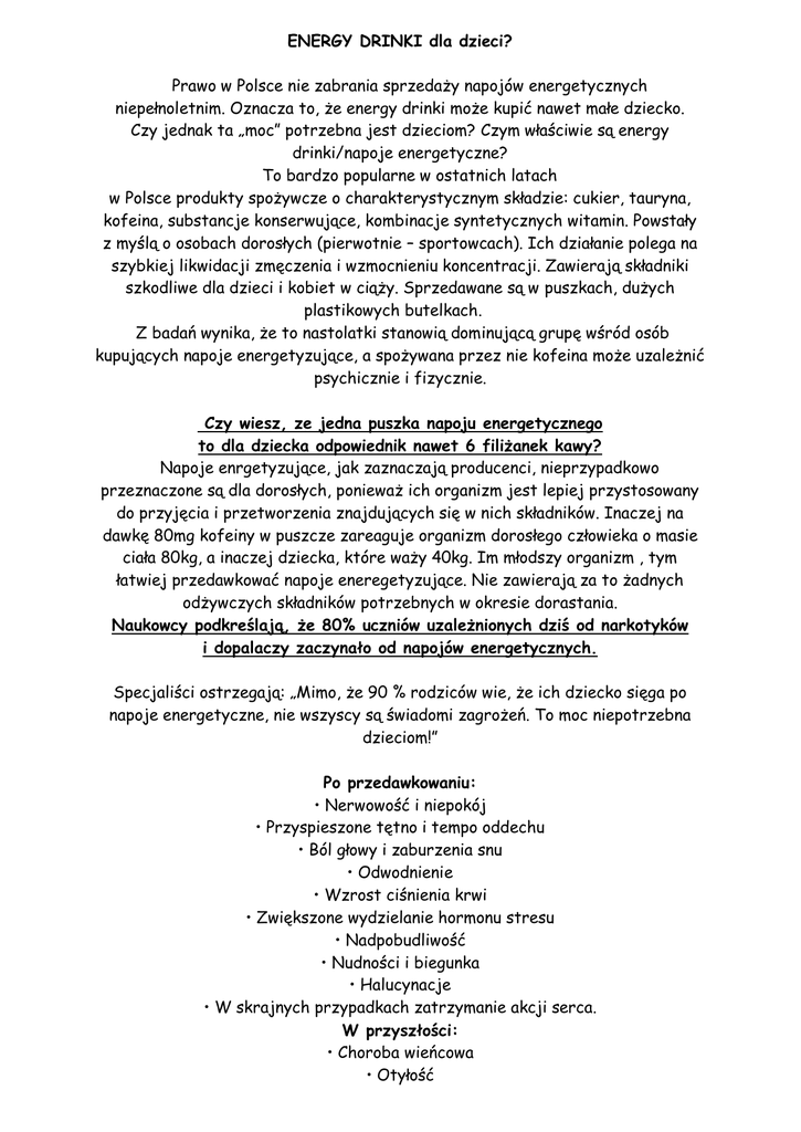 ENERGY DRINKI dla dzieci? Prawo w Polsce nie zabrania sprzedaży napojów energetycznych niepełnoletnim. Oznacza to, że energy drinki może kupić nawet małe dziecko. Czy jednak ta „moc” potrzebna jest dzieciom? Czym właściwie są energy drinki/napoje energetyczne? To bardzo popularne w ostatnich latach w Polsce produkty spożywcze o charakterystycznym składzie: cukier, tauryna, kofeina, substancje konserwujące, kombinacje syntetycznych witamin. Powstały z myślą o osobach dorosłych (pierwotnie – sportowcach). Ich działanie polega na szybkiej likwidacji zmęczenia i wzmocnieniu koncentracji. Zawierają składniki szkodliwe dla dzieci i kobiet w ciąży. Sprzedawane są w puszkach, dużych plastikowych butelkach. Z badań wynika, że to nastolatki stanowią dominującą grupę wśród osób kupujących napoje energetyzujące, a spożywana przez nie kofeina może uzależnić psychicznie i fizycznie. Czy wiesz, ze jedna puszka napoju energetycznego to dla dziecka odpowiednik nawet 6 filiżanek kawy? Napoje enrgetyzujące, jak zaznaczają producenci, nieprzypadkowo przeznaczone są dla dorosłych, ponieważ ich organizm jest lepiej przystosowany do przyjęcia i przetworzenia znajdujących się w nich składników. Inaczej na dawkę 80mg kofeiny w puszcze zareaguje organizm dorosłego człowieka o masie ciała 80kg, a inaczej dziecka, które waży 40kg. Im młodszy organizm , tym łatwiej przedawkować napoje eneregetyzujące. Nie zawierają za to żadnych odżywczych składników potrzebnych w okresie dorastania. Naukowcy podkreślają, że 80% uczniów uzależnionych dziś od narkotyków i dopalaczy zaczynało od napojów energetycznych. Specjaliści ostrzegają: „Mimo, że 90 % rodziców wie, że ich dziecko sięga po napoje energetyczne, nie wszyscy są świadomi zagrożeń. To moc niepotrzebna dzieciom!” Po przedawkowaniu: • Nerwowość i niepokój • Przyspieszone tętno i tempo oddechu • Ból głowy i zaburzenia snu • Odwodnienie • Wzrost ciśnienia krwi • Zwiększone wydzielanie hormonu stresu • Nadpobudliwość • Nudności i biegunka • Halucynacje • W skrajnych przypadkach zatrzymanie akcji serca. W przyszłości: • Choroba wieńcowa • Otyłość • Próchnica • Zaburzenia psychiczne • Problemy z pamięcią • Uzależnienie od kofeiny i podatność na inne uzależnienia • Osteoporoza • Nerwice • Przedwczesne starzenie.