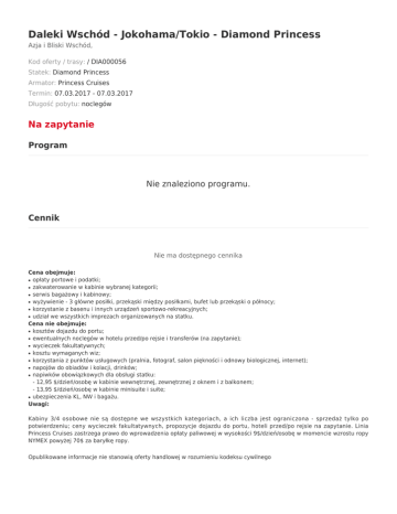 Daleki Wschód - Jokohama/Tokio - Diamond Princess Azja i Bliski Wschód, Kod oferty / trasy: / DIA000056 Statek: Diamond Princess Armator: Princess Cruises Termin: 07.03.2017 - 07.03.2017 Długość pobytu: noclegów Na zapytanie Program Nie znaleziono programu. Cennik Nie ma dostępnego cennika Cena obejmuje: opłaty portowe i podatki; zakwaterowanie w kabinie wybranej kategorii; serwis bagażowy i kabinowy; wyżywienie - 3 główne posiłki, przekąski między posiłkami, bufet lub przekąski o północy; korzystanie z basenu i innych urządzeń sportowo-rekreacyjnych; udział we wszystkich imprezach organizowanych na statku. Cena nie obejmuje: kosztów dojazdu do portu; ewentualnych noclegów w hotelu przed/po rejsie i transferów (na zapytanie); wycieczek fakultatywnych; kosztu wymaganych wiz; korzystania z punktów usługowych (pralnia, fotograf, salon piękności i odnowy biologicznej, internet); napojów do obiadów i kolacji, drinków; napiwków obowiązkowych dla obsługi statku: - 12,95 $/dzień/osobę w kabinie wewnętrznej, zewnętrznej z oknem i z balkonem; - 13,95 $/dzień/osobę w kabinie minisuite i suite; ubezpieczenia KL, NW i bagażu. Uwagi: ● ● ● ● ● ● ● ● ● ● ● ● ● ● Kabiny 3/4 osobowe nie są dostępne we wszystkich kategoriach, a ich liczba jest ograniczona - sprzedaż tylko po potwierdzeniu; ceny wycieczek fakultatywnych, propozycje dojazdu do portu, hoteli przed/po rejsie na zapytanie. Linia Princess Cruises zastrzega prawo do wprowadzenia opłaty paliwowej w wysokości 9$/dzień/osobę w momencie wzrostu ropy NYMEX powyżej 70$ za baryłkę ropy. Opublikowane informacje nie stanowią oferty handlowej w rozumieniu kodeksu cywilnego