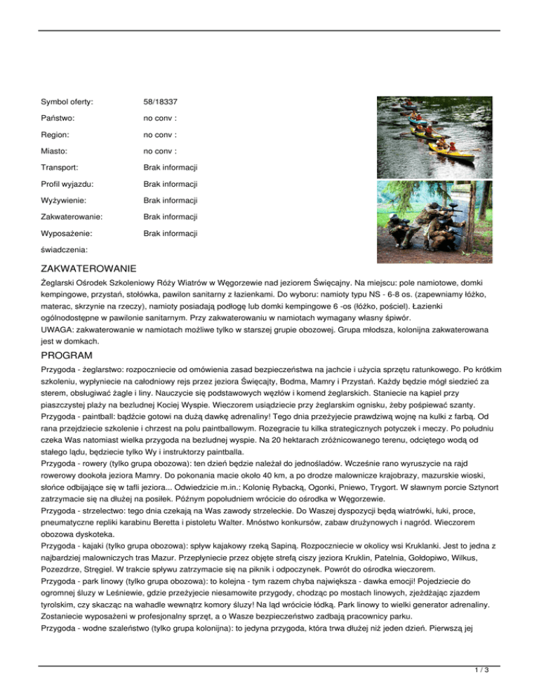 Symbol oferty: 58/18337 Państwo: no conv : Region: no conv : Miasto: no conv : Transport: Brak informacji Profil wyjazdu: Brak informacji Wyżywienie: Brak informacji Zakwaterowanie: Brak informacji Wyposażenie: Brak informacji świadczenia: ZAKWATEROWANIE Żeglarski Ośrodek Szkoleniowy Róży Wiatrów w Węgorzewie nad jeziorem Święcajny. Na miejscu: pole namiotowe, domki kempingowe, przystań, stołówka, pawilon sanitarny z łazienkami. Do wyboru: namioty typu NS - 6-8 os. (zapewniamy łóżko, materac, skrzynie na rzeczy), namioty posiadają podłogę lub domki kempingowe 6 -os (łóżko, pościel). Łazienki ogólnodostępne w pawilonie sanitarnym. Przy zakwaterowaniu w namiotach wymagany własny śpiwór. UWAGA: zakwaterowanie w namiotach możliwe tylko w starszej grupie obozowej. Grupa młodsza, kolonijna zakwaterowana jest w domkach. PROGRAM Przygoda - żeglarstwo: rozpoczniecie od omówienia zasad bezpieczeństwa na jachcie i użycia sprzętu ratunkowego. Po krótkim szkoleniu, wypłyniecie na całodniowy rejs przez jeziora Święcajty, Bodma, Mamry i Przystań. Każdy będzie mógł siedzieć za sterem, obsługiwać żagle i liny. Nauczycie się podstawowych węzłów i komend żeglarskich. Staniecie na kąpiel przy piaszczystej plaży na bezludnej Kociej Wyspie. Wieczorem usiądziecie przy żeglarskim ognisku, żeby pośpiewać szanty. Przygoda - paintball: bądźcie gotowi na dużą dawkę adrenaliny! Tego dnia przeżyjecie prawdziwą wojnę na kulki z farbą. Od rana przejdziecie szkolenie i chrzest na polu paintballowym. Rozegracie tu kilka strategicznych potyczek i meczy. Po południu czeka Was natomiast wielka przygoda na bezludnej wyspie. Na 20 hektarach zróżnicowanego terenu, odciętego wodą od stałego lądu, będziecie tylko Wy i instruktorzy paintballa. Przygoda - rowery (tylko grupa obozowa): ten dzień będzie należał do jednośladów. Wcześnie rano wyruszycie na rajd rowerowy dookoła jeziora Mamry. Do pokonania macie około 40 km, a po drodze malownicze krajobrazy, mazurskie wioski, słońce odbijające się w tafli jeziora... Odwiedzicie m.in.: Kolonię Rybacką, Ogonki, Pniewo, Trygort. W sławnym porcie Sztynort zatrzymacie się na dłużej na posiłek. Późnym popołudniem wrócicie do ośrodka w Węgorzewie. Przygoda - strzelectwo: tego dnia czekają na Was zawody strzeleckie. Do Waszej dyspozycji będą wiatrówki, łuki, proce, pneumatyczne repliki karabinu Beretta i pistoletu Walter. Mnóstwo konkursów, zabaw drużynowych i nagród. Wieczorem obozowa dyskoteka. Przygoda - kajaki (tylko grupa obozowa): spływ kajakowy rzeką Sapiną. Rozpoczniecie w okolicy wsi Kruklanki. Jest to jedna z najbardziej malowniczych tras Mazur. Przepłyniecie przez objęte strefą ciszy jeziora Kruklin, Patelnia, Gołdopiwo, Wilkus, Pozezdrze, Stręgiel. W trakcie spływu zatrzymacie się na piknik i odpoczynek. Powrót do ośrodka wieczorem. Przygoda - park linowy (tylko grupa obozowa): to kolejna - tym razem chyba największa - dawka emocji! Pojedziecie do ogromnej śluzy w Leśniewie, gdzie przeżyjecie niesamowite przygody, chodząc po mostach linowych, zjeżdżając zjazdem tyrolskim, czy skacząc na wahadle wewnątrz komory śluzy! Na ląd wrócicie łódką. Park linowy to wielki generator adrenaliny. Zostaniecie wyposażeni w profesjonalny sprzęt, a o Wasze bezpieczeństwo zadbają pracownicy parku. Przygoda - wodne szaleństwo (tylko grupa kolonijna): to jedyna przygoda, która trwa dłużej niż jeden dzień. Pierwszą jej 1/3 częścią będzie wycieczka do Parku Wodnego Tropikana. Drugą - olimpiada wodna na plaży przy ośrodku. Zabawy i konkursy w wodzie, a także przejażdżki motorówką i na -bananie”. Przygoda - konie (tylko grupa kolonijna): czyli dzień w stadninie. Od rana dowiemy się najważniejszych rzeczy o przyjaźni człowieka z koniem. Nauczymy się dbać o zwierzaki, czyścić, karmić, poić. Potem każdy z uczestników będzie miał indywidualną lekcję jazdy konno. Na koniec wszyscy razem pojedziemy na przejażdżkę bryczkami po lesie. Przygoda - bezludna wyspa (tylko grupa kolonijna): czyli survival i orienteering w najlepszym wydaniu! Na prawdziwej 20 hektarowej bezludnej wyspie rozbijemy na cały dzień obóz. Przeprawimy się tratwą, zbudujemy szałas, rozpalimy ognisko bez użycia zapałek, w poruszaniu się po terenie nauczymy się korzystać z mapy i kompasu. Przygoda - latawce (tylko grupa kolonijna): to prawdziwa, czysta radość. Od samego rana zajmiemy się ich budową i ozdabianiem tak żeby swoje umiejętności mogli wykorzystać zarówno utalentowani technicznie jak i plastycznie. Po południu będziemy bawić się zbudowanymi przez nas cudami jak i profesjonalnymi latawcami akrobatycznymi i komorowymi. Uwieńczeniem dnia będzie wspólne zdjęcie z wysokości zrobione ze specjalnego latawca do filmowania. Przygoda - nurkowanie (tylko grupa obozowa, możliwość zamiany na wodne szaleństwo): pierwszy krok. Nurkowanie do niedawna uważane było za sport ekstremalny. Nic bardziej mylnego. Na poziomie podstawowym jest to przyjemna i łatwa dyscyplina. Zajęcia -pierwszy krok” polegają na zapoznaniu ze sprzętem, zasadami bezpieczeństwa, podstawową teorią. Następnie każdy z nas założy kompletny strój i sprzęt i zanurkuje z instruktorem. W czasie nurkowania instruktor cały czas trzyma nas za rękę, obserwuje i obsługuje sprzęt. O krok od nas jest całkiem inny, piękny świat. Warto go poznać! W PROGRAMIE DODATKOWO: typowe atrakcje obozowe, jak ogniska, dyskoteki, zabawy terenowe, sportowe, plastyczne, czy wycieczki) WYŻYWIENIE w stołówce ośrodka (śniadanie, obiad, kolacja). Podczas całodniowych zajęć uczestnicy jedzą śniadanie i obiadokolację w stołówce ośrodka oraz otrzymują prowiant na czas zajęć. TRANSPORT Autokar We własnym zakresie lub zorganizowany dojazd (PKP + autokar) z pilotem organizatora z Olsztyna + 100 zł, Warszawy + 130 zł, Łodzi + 130 zł, Torunia + 140 zł, Gnie
