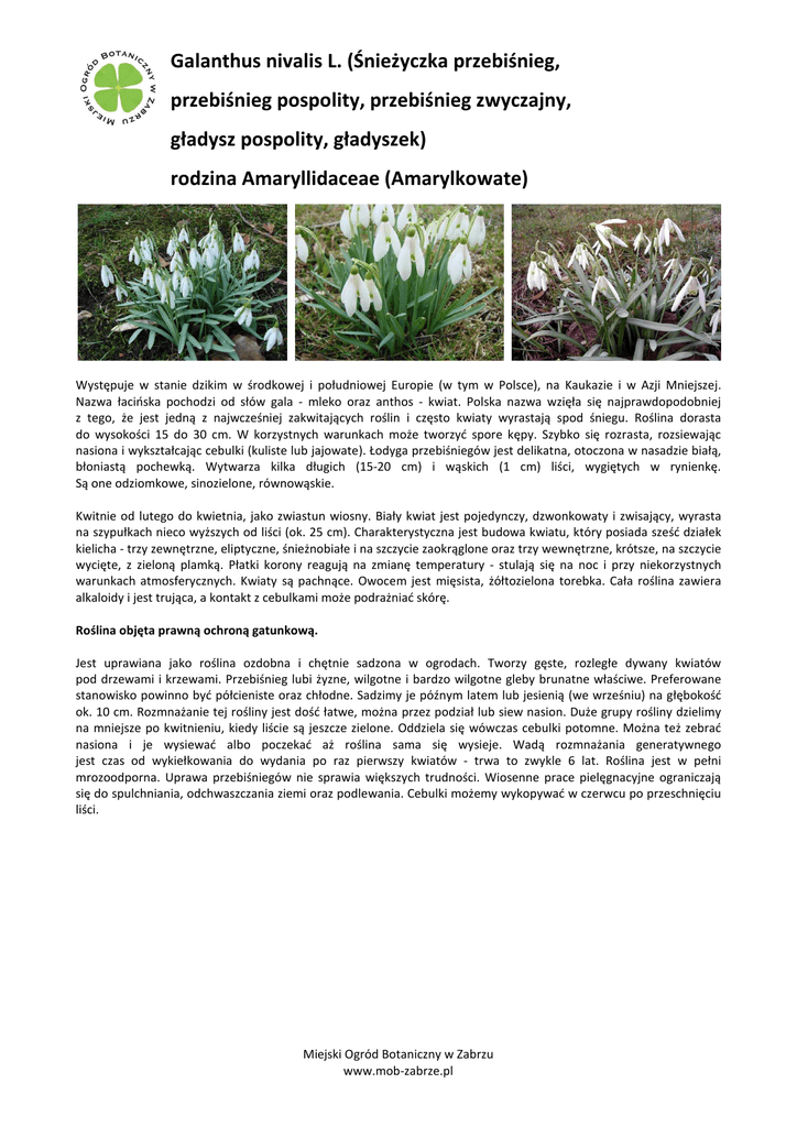 Galanthus nivalis L. (Śnieżyczka przebiśnieg, przebiśnieg pospolity, przebiśnieg zwyczajny, gładysz pospolity, gładyszek) rodzina Amaryllidaceae (Amarylkowate) Występuje w stanie dzikim w środkowej i południowej Europie (w tym w Polsce), na Kaukazie i w Azji Mniejszej. Nazwa łacińska pochodzi od słów gala - mleko oraz anthos - kwiat. Polska nazwa wzięła się najprawdopodobniej z tego, że jest jedną z najwcześniej zakwitających roślin i często kwiaty wyrastają spod śniegu. Roślina dorasta do wysokości 15 do 30 cm. W korzystnych warunkach może tworzyć spore kępy. Szybko się rozrasta, rozsiewając nasiona i wykształcając cebulki (kuliste lub jajowate). Łodyga przebiśniegów jest delikatna, otoczona w nasadzie białą, błoniastą pochewką. Wytwarza kilka długich (15-20 cm) i wąskich (1 cm) liści, wygiętych w rynienkę. Są one odziomkowe, sinozielone, równowąskie. Kwitnie od lutego do kwietnia, jako zwiastun wiosny. Biały kwiat jest pojedynczy, dzwonkowaty i zwisający, wyrasta na szypułkach nieco wyższych od liści (ok. 25 cm). Charakterystyczna jest budowa kwiatu, który posiada sześć działek kielicha - trzy zewnętrzne, eliptyczne, śnieżnobiałe i na szczycie zaokrąglone oraz trzy wewnętrzne, krótsze, na szczycie wycięte, z zieloną plamką. Płatki korony reagują na zmianę temperatury - stulają się na noc i przy niekorzystnych warunkach atmosferycznych. Kwiaty są pachnące. Owocem jest mięsista, żółtozielona torebka. Cała roślina zawiera alkaloidy i jest trująca, a kontakt z cebulkami może podrażniać skórę. Roślina objęta prawną ochroną gatunkową. Jest uprawiana jako roślina ozdobna i chętnie sadzona w ogrodach. Tworzy gęste, rozległe dywany kwiatów pod drzewami i krzewami. Przebiśnieg lubi żyzne, wilgotne i bardzo wilgotne gleby brunatne właściwe. Preferowane stanowisko powinno być półcieniste oraz chłodne. Sadzimy je późnym latem lub jesienią (we wrześniu) na głębokość ok. 10 cm. Rozmnażanie tej rośliny jest dość łatwe, można przez podział lub siew nasion. Duże grupy rośliny dzielimy na mniejsze po kwitnieniu, kiedy liście są jeszcze zielone. Oddziela się wówczas cebulki potomne. Można też zebrać nasiona i je wysiewać albo poczekać aż roślina sama się wysieje. Wadą rozmnażania generatywnego jest czas od wykiełkowania do wydania po raz pierwszy kwiatów - trwa to zwykle 6 lat. Roślina jest w pełni mrozoodporna. Uprawa przebiśniegów nie sprawia większych trudności. Wiosenne prace pielęgnacyjne ograniczają się do spulchniania, odchwaszczania ziemi oraz podlewania. Cebulki możemy wykopywać w czerwcu po przeschnięciu liści. Miejski Ogród Botaniczny w Zabrzu www.mob-zabrze.pl