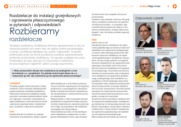 a r t y k u ł t e c h n i c z n y d o s p i s u Rozdzielacze do instalacji grzejnikowych i ogrzewania płaszczyznowego w pytaniach i odpowiedziach Rozbieramy rozdzielacze 1. Wielu producentów oferuje inne rozdzielacze do podłogówki, a inne do instalacji c.o. z grzejnikami. Czy jednak można kupić tańszy do c.o. i doposażyć go tak, aby zastosować go do ogrzewania płaszczyznowego? W drodze wyjątku można skorzystać z takiej możliwości. Firma Oventrop odradza jednak przeprowadzanie modyfikacji rozdzielaczy. Fabrycznie zmontowany rozdzielacz poddawany jest w procesie produkcji próbom ciśnienia. Ingerując w budowę i wyposażenie takiego rozdzielacza, automatycznie po stronie wykonawcy pozostaje troska o dokładność prac i szczelność wykonanych połączeń. KAN Teoretycznie jest to możliwe np. poprzez wstawienie na podłączeniu między nyplami nia techniczne tych urządzeń nie były zaawansowane. W jednym tylko układzie można by taki grzejnikowy rozdzielacz zastosować do ogrzewania płaszczyznowego – w przypadku, gdy wszystkie obwody grzewcze, leżące w tym samym pomieszczeniu, miałyby identyczną długość, więc nie byłoby potrzeby regulacji przepływu. Odpowiedzi udzielili: HERZ Tematykę rozdzielaczy chcielibyśmy Państwu zaprezentować w inny niż zazwyczaj sposób: tym razem więc nie ogólny artykuł wprowadzający w temat, a publikacja składająca się z pytań i odpowiedzi. Ta bardzo preferowana przez nas forma poradnicza umożliwia zaprezentowanie przekonań producentów rozdzielaczy i ich sposobu podejścia do rynku. Przekonajmy się więc, jakie jest ich stanowisko w odniesieniu do poszczególnych zagadnień i jakich używają argumentów… OVENTROP 8 czerwiec 2012 (06) t r e ś c i belki rozdzielacza a śrubunkiem przyłączeniowym zaworów regulacyjnych do regulacji przepływów w poszczególnych obwodach. Byłoby to jednak technicznie i eksploatacyjnie nieuzasadnione, a ekonomicznie po prostu nieopłacalnie. Większe byłoby w takim przypadku prawdopodobieństwo popełnienia błędu podczas montażu takiej hybrydy, więcej też potencjalnych miejsc do przecieków, taki rozdzielacz wymagałby też więcej miejsca. Trzeba jednak zauważyć, że tak skonfigurowane rozdzielacze występowały na rynku jeszcze kilkadziesiąt lat temu, gdy rozwiąza- Można, ale po co? Najczęściej typowe rozdzielacze do ogrzewania grzejnikowego są tańsze od typowych rozdzielaczy do ogrzewania podłogowego, w ramach oferty jednego producenta. Rozbudowa typowych rozdzielaczy do ogrzewania grzejnikowego o dodatkowe wyposażenie, tak aby mogły spełniać wymagania stawiane rozdzielaczom do ogrzewania podłogowego, spowoduje wzrost ceny powyżej ceny typowych rozdzielaczy do ogrzewania podłogowego. Oczywiście przytoczona hipoteza ma zastosowanie, gdy analizujemy ceny rozdzielaczy do ogrzewania grzejnikowego, podłogowego oraz dodatkowe wyposażenie w ramach jednego producenta. W przypadku hydry, będących połączeniem różnych producentów, powyższe założenie nie musi mieć zastosowania. Otwartą kwestią pozostaje, kto właściwie jest producentem oraz kto poniesie brzemię gwarancji w przypadku wycieku lub innej awarii. Zasadnicza różnica pomiędzy rozdzielaczami do ogrzewania grzejnikowego i podłogowego zasadza się na różnej przepustowości oraz różnym wyposażeniu. Nawet słabo wdrożony instalator jest w stanie rozróżnić rozdzielacze do ogrzewania grzejnikowego od rozdzielaczy do ogrzewania podłogowego. Różna przepustowość bierze się z różnych OVENTROP Joanna Pieńkowska Doradca techniczny ROTH Justyna Pytkowska Specjalista ds. technicznych KAN Piotr Bertram Doradca techniczny AFRISO Błażej Wojciechowski Zastępca dyrektora technicznego HERZ Grzegorz Ojczyk Dyrektor techniczny RETTIG HEATING Marcin Kotas Inżynier produktu, Ogrzewanie podłogowe i systemy rurowe HKS a r t y k u ł t e c h n i c z n y warunków pracy instalacji. Typowa instalacja grzejnikowa pracuje przy ochłodzeniu czynnika grzewczego pomiędzy 15 a 25oC. Typowa instalacja z grzejnikami powierzchniowymi pracuje przy ochłodzeniu czynnika grzewczego pomiędzy 8 a 15oC. Powyższe parametry pracy powodują, iż przepustowość rozdzielaczy do ogrzewania powierzchniowego jest ok. dwukrotnie większa od przepustowości rozdzielczy do ogrzewania grzejnikowego. Różnica w wyposażeniu bierze się z różnych funkcji obu typu rozdzielczy. Rozdzielacze do ogrzewania grzejnikowego w najprostszej wersji są to tzw. „belki” z przyłączami. W wersji bogato wyposażonej mają dodatkowo zawory kulowe do ocinania obiegów. Równoważenie instalacji realizowane jest za pomocą nastaw wstępnych na zaworach powrotnych, zasilających lub wkładkach termostatycznych wbudowanych w grzejniki. Regulacja termostatyczna realizowana jest za pomocą zaworów termostatycznych lub grzejnikowych wkładek termostatycznych. Rozdzielacze do ogrzewania powierzchniowego w najprostszej wersji wyposażone są we wkładki termostatyczne na jednej belce (np. rozdzielającej) i wkładki odcinające na drugiej belce rozdzielacza (a właściwie kolektora). W wersji bogato wyposażonej rozdzielacze do ogrzewania powierzchniowego mają wkładki regulacyjne do równoważenia instalacji lub rotametry do regulacji i pomiaru przepływu. Należy nadmienić, że belki do rozdzielaczy ogrzewania podłogowego mają wbudowane gniazda do zabudowy wkładek termostatycznych, wkładek odcinających, rotametrów... Rozdzielacze do ogrzewania grzejnikowego zazwyczaj mają zaś tylko nagwintowane króćce. Rozbudowa rozdzielaczy do ogrzewania d o s p i s u czerwiec 2012 (06) t r e ś c i grzejnikowego o dodatkowe zewnętrzne wyposażenie, umożliwiające spełnienie wymagań stawianym do ogrzewania grzejnikowego jest możliwa, aczkolwiek ekonomicznie i technicznie nieuzasadniona. To tak jakby się drapać lewą ręką za prawym uchem, można ale dlaczego akurat tak? dodatek zawór regulacyjny – ca. 17 zł netto /szt