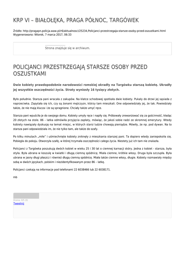 KRP VI – BIAŁOŁĘKA, PRAGA PÓŁNOC, TARGÓWEK Źródło: http://pragapn.policja.waw.pl/r6/aktualnosci/25234,Policjanci-przestrzegaja-starsze-osoby-przed-oszustkami.html Wygenerowano: Wtorek, 7 marca 2017, 06:33 Strona znajduje się w archiwum. POLICJANCI PRZESTRZEGAJĄ STARSZE OSOBY PRZED OSZUSTKAMI Dwie kobiety prawdopodobnie narodowości romskiej okradły na Targówku starszą kobietę. Ukradły jej wszystkie oszczędności życia. Straty wyniosły 16 tysięcy złotych. Było południe. Starsza pani wracała z zakupów. Na klatce schodowej spotkała dwie kobiety. Pukały do drzwi jej sąsiada z naprzeciwka. Zapytała się ich, czy są żonami mężczyzn, którzy tam mieszkali. One odpowiedziały jej, że tak. Powiedziały także, że nie mają klucza i że są spragnione. Chciały także umyć ręce. Starsza pani wpuściła je do swojego domu. Kobiety umyły ręce i napiły się. Próbowały zrewanżować się za gościnność, kładąc 20 złotych na stole. 86 – latka odmówiła przyjęcia zapłaty, mówiąc, że jakoś sobie radzi ze skromnej emerytury. Wtedy kobiety nawiązały dyskusję na temat miejsc, w których starsi ludzie chowają pieniądze. Mówiły, że np. pod dywan. Na to starsza pani odpowiedziała im, że nie tylko tam, ale także do szafy. Po kilku minutach „miłe” i uśmiechnięte kobiety zniknęły z mieszkania starszej pani. Ta dopiero wtedy zaniepokoiła się. Pobiegła do pokoju. Otworzyła szafę, w której trzymała oszczędności całego życia. Niestety już ich tam nie znalazła. Policjanci z Targówka poszukują dwóch kobiet w wieku 25 i 30 lat o ciemnej karnacji skóry. Jedna z kobiet - starsza, była otyła. Była ubrana w koszulę w kwiatki i długą ciemną spódnicę. Miała ciemne, krótkie włosy. Druga była szczupła. Była ubrana w jasny długi płaszcz i również długą ciemną spódnicę. Miała także ciemne włosy, długie. Kobiety rozmawiały między sobą w dwóch językach, polskim i niezidentyfikowanym przez 86 – latkę. Policjanci czekają na informacje pod telefonami 22 6038466 lub 22 6038171. mb Ocena: 0/5 (0) Tweetnij