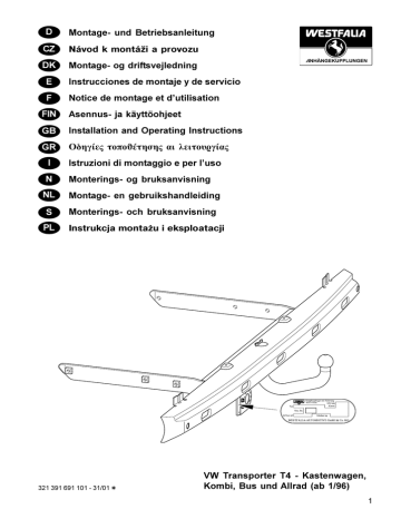 D Montage- und Betriebsanleitung CZ Návod k montái a provozu DK Montage- og driftsvejledning E Instrucciones de montaje y de servicio F Notice de montage et dutilisation FIN Asennus- ja käyttöohjeet GB Installation and Operating Instructions GR å®ã¥ªÿ ½õ梽®÷®ÿ ¦¯ 𪯽¾¼ã¥¦ÿ I Istruzioni di montaggio e per luso N Monterings- og bruksanvisning NL Montage- en gebruikshandleiding S Monterings- och bruksanvisning PL Instrukcja monta¿u i eksploatacji 321 391 691 101 - 31/01 V VW Transporter T4 - Kastenwagen, Kombi, Bus und Allrad (ab 1/96) 1 D Lieferumfang der Anhängevorrichtung CZ Objem dodání taného zaøízení DK Anhængertrækkets leveringsomfang E Volumen de suministro del enganche F Pièces comprises dans la fourniture de lattelage FIN Vetokoukun toimituksen sisältö GB Scope of delivery of towing hitch Õª¼¯ª¿²¹ªº ½¾ õ¦¢½¾ ½®ÿ ÷ø¦¯¼¯±ÿ GR ªø¦ð±ÿ ª³ñ®ÿ ¹ª ÷½±¼¯ã¹¦ I Dotazione del gancio di traino N Leveringsomfang for tilhengerfestet NL S PL 2 Leveringsomvang trekhaak 1 1x 2 1x 3 1x 13x24x2,5 4 1x 12,5x30x0,88 5 2x M 6 (8) 6 1x M 12x1,5 (10) 7 5x (a) M 12x1,5x35 (10.9) 8 1x (c) M 12x1,5x30 (10.9) 9 1x "1" Dragkrokens leveransspecifikation Zakres dostawy haka holowniczego D Lieferbare Ersatzteilumfänge Anhängevorrichtung CZ Dodatelné náhradní díly taného zaøízení DK Reservedele, der kan leveres til anhængertrækket E Volumen de piezas de repuesto suministrables del enganche F Pièces de rechange disponibles pour lattelage FIN Vetokoukun toimitettavissa olevat varaosat GB Available spare parts for towing hitch GR ¦½¡ðãÿ ½þº 實æ¢÷¯¹þº ¦º½¦ð𦽯µº ½®ÿ ÷ø¦¯¼¯±ÿ ªø¦ð±ÿ ª³ñ®ÿ ¹ª ÷½±¼¯ã¹¦ I Pezzi di ricambio disponibili per il gancio di traino N Reservedeler for tilhengerfestet som kan leveres NL S PL Leverbare reserve-onderdelen t.b.v. trekhaak Dragkrokens reservdelsspecifikationer Zakres dostarczanych czêci zamiennych haka holowniczego 3 4 Anhängevorrichtung (Kupplungskugel mit Halterung) ohne Elektrosatz Hersteller: WESTFALIA-AUTOMOTIVE GmbH & Co. KG D Westfalia-Bestell - Nr.: 321 391 Genehmigungsnummer nach Richtlinie 94/20/EG: e13 00-0050 Klasse: A50-X Typ: 321 389 Technische Daten : maximaler D-Wert: 13,4 kN maximale Stützlast:105 kg Verwendungsbereich: Fahrzeughersteller: VW Modell: Typbezeichnung: Transporter T4 - Kastenwagen, Kombi, Bus und Allrad (ab 1/96) 70X0A, 70X0B, 70X0BL, 70X0BN, 70X0C, 70X1A, 70X02A, 70X02B, 70X02C, 70X02BL, 70X02BN, 70X1B, 70X1BL,70X1BN , 70X1C, 70X12A, 70X12B, 70X12C, 70X12BL, 70X12BN, 7DB, 7DW,7DZ Allgemeine Hinweise: Für den Fahrbetrieb sind die Angaben des Fahrzeugherstellers bzgl. Anhängelast und Stützlast maßgebend, wobei die Werte der Anhängevorrichtung nicht überschritten werden dürfen. Die Anhängevorrichtung dient zum Ziehen von Anhängern, welche mit Zugkugelkupplungen ausgerüstet sind und zum Betrieb von Lastenträgern, welche für die Montage auf der Kupplungskugel zugelassen sind. Artfremde Benutzung ist verboten. Der Betrieb muß den Straßenverhältnissen angepaßt erfolgen. Beim Betrieb verändern sich die Fahreigenschaften des Fahrzeuges. Die Betriebsanleitung des Fahrzeugherstellers ist zu beachten. Die vom Fahrzeughersteller serienmäßig genehmigten Befestigungspunkte sind eingehalten. Der Freiraum nach Anhang VII, Abbildung 30 der Richtlinie 94/20/EG ist gewährleistet. Der Anbau der Anhängevorrichtung ist entsprechend den Festlegungen in Anhang I, Nr. 5.10 der Richtlinie 94/20/EG zu prüfen (Anbauabnahme durch Technischen Sachverständigen/Dienst). Diese Montage- und Betriebsanleitung ist den Kfz. - Papieren beizufügen. Montagehinweise: Die Anhängevorrichtung ist ein Sicherheitsteil und darf nur von Fachpersonal montiert werden. Jegliche Änderungen bzw. Umbauten an der Anhängevorrichtung sind verboten. Sie führen zum Erlöschen der Betriebserlaubnis. Isoliermasse bzw. Unterbodenschutz am Kfz. - falls vorhanden - im Bereich der Anlageflächen der Anhängevorrichtung entfernen. Blanke Karosseriestellen sowie Bohrungen mit Rostschutzfarbe versiegeln. Betriebshinweise: Die KmH stellt erhöhte Forderungen an das Kühlsystem. Evtl. erforderliche Umbaumaßnahmen an der Kühlung sind bei der Vertragswerkstatt zu erfragen. Hinweise dazu enthällt der Ratgeber "Anhängerbetrieb" von V.A.G. Sämtliche Befestigungsschrauben der Anhängevorrichtung nach ca. 1000 Anhänger - km mit den vorgeschriebenen Anziehdrehmomenten nochmals nachziehen. Die Kupplungskugel ist sauber zu halten und zu fetten. Werden jedoch Spurstabilisierungseinrichtungen, wie z.B. die Westfalia "SSK" benutzt, muß die Kupplungskugel fettfrei sein. Die Hinweise in den jeweiligen Betriebsanleitungen beachten. Sobald an einer beliebigen Stelle ein Kupplungskugel-Durchmesser von 49,0 mm oder kleiner erreicht ist, darf die Anhängevorrichtung aus Sicherheitsgründen nicht mehr benutzt werden. Das Leergewicht des Fahrzeuges erhöht sich nach Montage der Anhängevorrichtung um 20 kg. 5 D Montageanleitung: 1.) Hinteren Stoßfänger und Reserverad vom Fahrzeug lösen. 2.) Äußeren Stoßfänger mit Stoßabsorber vom inneren Blechträger lösen. (Der Blechträger wird in Verbindung mit der KmH nicht mehr benötigt.) 3.) Stoßabsorber (Schaumteil) von außen über die großen, ovalen Löcher auf die KmH stecken. Stoßabsorber in der Mitte im Anlagebereich der Verbindung freischneiden! Den Stoßfänger über die mittlere, auf der KmH angeschweißten Zentrierung und den seitlich angeschweißten Stoßfängeraufnahmen mit den vorhandenen Schrauben oben und unten befestigen. 4.) KmH mit dem montierten Stoßfänger in die Öffnung des hinteren Abschlußbleches so einführen, daß sich die Löcher " a " und " c " mit den Befestigungspunkten am Kfz. decken. Mitgelieferte Sechskantschrauben M12x1,5x35 (5x) /M12x1,5x30 (1x) einsetzen und fest anschrauben. Bei " c " mit der beiliegenden Skt.-Mutter M 12 x 1,5 und Scheibe 13 verschrauben. Reser