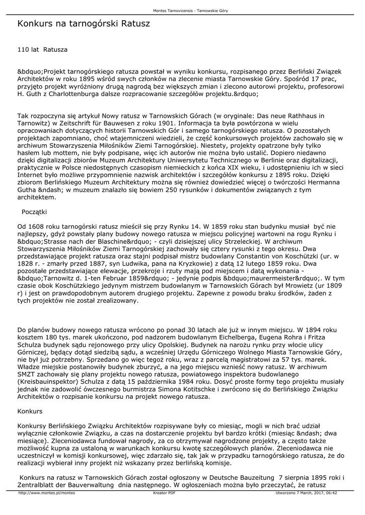 Montes Tarnovicensis - Tarnowskie Góry Konkurs na tarnogórski Ratusz 110 lat Ratusza „Projekt tarnogórskiego ratusza powstał w wyniku konkursu, rozpisanego przez Berliński Związek Architektów w roku 1895 wśród swych członków na zlecenie miasta Tarnowskie Góry. Spośród 17 prac, przyjęto projekt wyróżniony drugą nagrodą bez większych zmian i zlecono autorowi projektu, profesorowi H. Guth z Charlottenburga dalsze rozpracowanie szczegółów projektu.” Tak rozpoczyna się artykuł Nowy ratusz w Tarnowskich Górach (w oryginale: Das neue Rathhaus in Tarnowitz) w Zeitschrift für Bauwesen z roku 1901. Informacja ta była powtórzona w wielu opracowaniach dotyczących historii Tarnowskich Gór i samego tarnogórskiego ratusza. O pozostałych projektach zapomniano, choć wtajemniczeni wiedzieli, że część konkursowych projektów zachowało się w archiwum Stowarzyszenia Miłośników Ziemi Tarnogórskiej. Niestety, projekty opatrzone były tylko hasłem lub mottem, nie były podpisane, więc ich autorów nie można było ustalić. Dopiero niedawno dzięki digitalizacji zbiorów Muzeum Architektury Uniwersytetu Technicznego w Berlinie oraz digitalizacji, praktycznie w Polsce niedostępnych czasopism niemieckich z końca XIX wieku, i udostępnieniu ich w sieci Internet było możliwe przypomnienie nazwisk architektów i szczegółów konkursu z 1895 roku. Dzięki zbiorom Berlińskiego Muzeum Architektury można się również dowiedzieć więcej o twórczości Hermanna Gutha – w muzeum znalazło się bowiem 250 rysunków i dokumentów związanych z tym architektem. Początki Od 1608 roku tarnogórski ratusz mieścił się przy Rynku 14. W 1859 roku stan budynku musiał być nie najlepszy, gdyż powstały plany budowy nowego ratusza w miejscu policyjnej wartowni na rogu Rynku i „Strasse nach der Blaschine” - czyli dzisiejszej ulicy Strzeleckiej. W archiwum Stowarzyszenia Miłośników Ziemi Tarnogórskiej zachowały się cztery rysunki z tego okresu. Dwa przedstawiające projekt ratusza oraz stajni podpisał mistrz budowlany Constantin von Koschützki (ur. w 1828 r. - zmarły przed 1887, syn Ludwika, pana na Kryzkowie) z datą 12 lutego 1859 roku. Dwa pozostałe przedstawiające elewacje, przekroje i rzuty mają pod miejscem i datą wykonania „Tarnowitz d. 1-ten Februar 1859” - jedynie podpis „maurermeister”. W tym czasie obok Koschützkiego jedynym mistrzem budowlanym w Tarnowskich Górach był Mrowietz (ur 1809 r) i jest on prawdopodobnym autorem drugiego projektu. Zapewne z powodu braku środków, żaden z tych projektów nie został zrealizowany. Do planów budowy nowego ratusza wrócono po ponad 30 latach ale już w innym miejscu. W 1894 roku kosztem 180 tys. marek ukończono, pod nadzorem budowlanym Eichelberga, Eugena Rohra i Fritza Schulza budynek sądu rejonowego przy ulicy Opolskiej. Budynek na narożu rynku przy wlocie ulicy Górniczej, będący dotąd siedzibą sądu, a wcześniej Urzędu Górniczego Wolnego Miasta Tarnowskie Góry, nie był już potrzebny. Sprzedano go więc tegoż roku, wraz z parcelą magistratowi za 57 tys. marek. Władze miejskie postanowiły budynek zburzyć, a na jego miejscu wznieść nowy ratusz. W archiwum SMZT zachowały się plany projektu nowego ratusza, powiatowego inspektora budowlanego (Kreisbauinspektor) Schulza z datą 15 października 1984 roku. Dosyć proste formy tego projektu musiały jednak nie zadowolić ówczesnego burmistrza Simona Kotitschke i zwrócono się do Berlińskiego Związku Architektów o rozpisanie konkursu na projekt nowego ratusza. Konkurs Konkursy Berlińskiego Związku Architektów rozpisywane były co miesiąc, mogli w nich brać udział wyłącznie członkowie Związku, a czas na dostarczenie projektu był bardzo krótki (miesiąc – dwa miesiące). Zleceniodawca fundował nagrody, za co otrzymywał nagrodzone projekty, a często także możliwość kupna za ustaloną w warunkach konkursu kwotę szczegółowych planów. Zleceniodawca nie uczestniczył w komisji konkursowej, więc zdarzało się, tak jak w przypadku tarnogórskiego ratusza, że do realizacji wybierał inny projekt niż wskazany przez berlińską komisje. Konkurs na ratusz w Tarnowskich Górach został ogłoszony w Deutsche Bauzeitung 7 sierpnia 1895 roki i Zentralblatt der Bauverwaltung dnia następnego. W ogłoszeniach można było przeczytać, że ratusz http://www.montes.pl/montes Kreator PDF Utworzono 7 March, 2017, 06:42 Montes Tarnovicensis - Tarnowskie Góry powinien mieć dwa sklepy na parterze, mieszkanie dla burmistrza na piętrze i salę Rady Miejskiej o powierzchni 120 m2 na drugim piętrze. Koszt budowy nie powinien przekroczyć 130 tys. marek. Należało dostarczyć rysunek perspektywiczny z widokiem ratusza z rynku, plany w skali 1:150 i rysunki fasady w skali 1:100. Nagrodą za pierwsze 3 miejsca było odpowiednio; 1000, 600 i 400 marek. Termin nadesłania projektów ustalono na 7 października 1895 roku. Startujący w konkursie mieli do dyspozycji plan tarnogórskiego rynku z przyległościami. Na zebraniu Związku Architektów Berlina w dniu 21 października, Friedrich Körte (prawdopodobnie przewodniczący komisji) poinformował o rozstrzygnięciu konkursu (notatki w Zentralblatt der Bauverwaltung z 23 października i Deutsche Bauzeitung z 30 października). Z nadesłanych 17 projektów, 11 zostało odrzuconych, gdyż nie spełniało warunków konkursu. Sumę nagród - 2000 marek – podzielono w następujący sposób: 1. nagroda (800 marek) - Karl Wilde rządowy mistrz budowlany z Berlina za projekt opatrzony hasłem „sketch only”, 2. nagroda (600 marek) - Hermann Guth architekt z Charlottenburga za projekt z hasłem „Vielleicht ?”; 3. nagrody (po 300 marek) - Hans Rösener krajowy inspektor budowlany z Berlina za projekt z rysunkiem podkowy i Ismar Herrmann rządowy mistrz budowlany z Berlina za projekt z mottem „Noch einer”. Wyróżniono także projekt Georga Zeidlera, rządowego kierow
