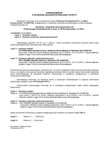 ZAWIADOMIENIE O WYBORZE NAJKORZYSTNIEJSZEJ OFERTY Niniejszym informuję, że w prowadzonym przez Publiczne Przedszkole Nr 5 ul. Marii Konopnickiej 7, 64-920 Piła postępowaniu o udzielenie zamówienia publicznego w trybie przetargu nieograniczonego na: „Dostawę artykułów żywnościowych do Publicznego Przedszkola Nr 5 przy ul. M.Konopnickiej 7 w Pile.” z podziałem na 2 części: część 1 - Dostawa nabiału część 2 - Dostawa artykułów ogólnospożywczych Zamawiający zgodnie z art. 91 ust. 1 ustawy – Prawo zamówień publicznych dokonał wyboru jako najkorzystniejszej oferty złożonej przez Wykonawcę: część 1 - Dostawa nabiału D.H.KAROLINKA sprzedaż hurtowa i detaliczna Roman Błaszak ul. Wawelska 104, 64-920 Piła cena brutto: 3 634,79 zł; termin realizacji zamówienia: od 01.12.2013 r. do 31.12.2013 r.; warunki płatności: przelew w ciągu 14 dni od dnia otrzymania faktury przez Zamawiającego. część 2 - Dostawa artykułów ogólnospożywczych PHU "ARAMIS" Mirosław Helwich ul. Wawelska 104, 64-920 Piła cena brutto: 3 854,58 zł; termin realizacji zamówienia: od 01.12.2013 r. do 31.12.2013 r.; warunki płatności: przelew w ciągu 14 dni od dnia otrzymania faktury przez Zamawiającego. Przedmiotową decyzję Zamawiający uzasadnia tym, że oferty niniejszych Wykonawców zawierają najniższe ceny, a w związku z powyższym uzyskały największą liczbę punktów w wyniku oceny ofert przeprowadzonej przez Zamawiającego na podstawie kryterium wskazanego w niniejszym postępowaniu o udzielenie zamówienia publicznego. Zamawiający informuje, że zawarcie umów z wybranymi Wykonawcami w sprawie zamówienia publicznego nastąpi po dniu 25 listopada 2013 r. Jednocześnie Zamawiający informuję, że w niniejszym postępowaniu oferty złożyli następujący Wykonawcy: Część 1 - Dostawa nabiału Oferta nr 1 - D.H.KAROLINKA sprzedaż hurtowa i detaliczna Roman Błaszak ul. Wawelska 104, 64-920 Piła cena brutto: 3 634,79 zł; termin realizacji zamówienia: od 01.12.2013 r. do 31.12.2013 r.; warunki płatności: przelew w ciągu 14 dni od dnia otrzymania faktury przez Zamawiającego. Część 2 - Dostawa artykułów ogólnospożywczych Oferta nr 1 - PHU "ARAMIS" Mirosław Helwich ul. Wawelska 104, 64-920 Piła cena brutto: 3 854,58 zł; termin realizacji zamówienia: od 01.12.2013 r. do 31.12.2013 r.; warunki płatności: przelew w ciągu 14 dni od dnia otrzymania faktury przez Zamawiającego. Wyżej wymienieni Wykonawcy uzyskali następującą ilość punktów za kryterium cena 100 %: Część 1 - Oferta nr 1 – 100,00 pkt Część 2 - Oferta nr 1 – 100,00 pkt sporządziła Stefania Drabik 25 listopada 2013 r.