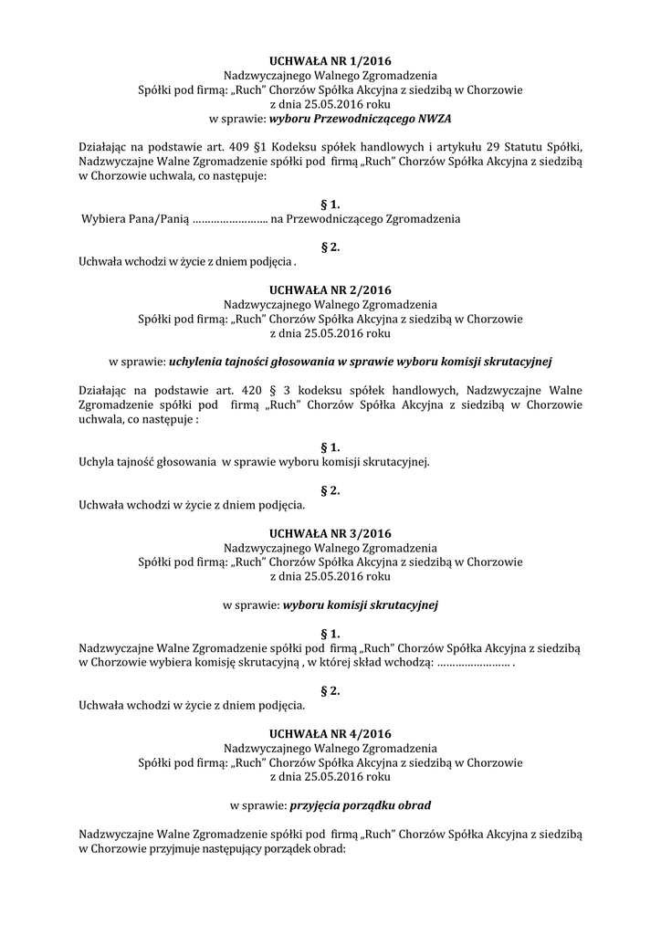 UCHWAŁA NR 1/2016 Nadzwyczajnego Walnego Zgromadzenia Spółki pod firmą: „Ruch” Chorzów Spółka Akcyjna z siedzibą w Chorzowie z dnia 25.05.2016 roku w sprawie: wyboru Przewodniczącego NWZA Działając na podstawie art. 409 §1 Kodeksu spółek handlowych i artykułu 29 Statutu Spółki, Nadzwyczajne Walne Zgromadzenie spółki pod firmą „Ruch” Chorzów Spółka Akcyjna z siedzibą w Chorzowie uchwala, co następuje: § 1. Wybiera Pana/Panią ……………………. na Przewodniczącego Zgromadzenia § 2. Uchwała wchodzi w życie z dniem podjęcia . UCHWAŁA NR 2/2016 Nadzwyczajnego Walnego Zgromadzenia Spółki pod firmą: „Ruch” Chorzów Spółka Akcyjna z siedzibą w Chorzowie z dnia 25.05.2016 roku w sprawie: uchylenia tajności głosowania w sprawie wyboru komisji skrutacyjnej Działając na podstawie art. 420 § 3 kodeksu spółek handlowych, Nadzwyczajne Walne Zgromadzenie spółki pod firmą „Ruch” Chorzów Spółka Akcyjna z siedzibą w Chorzowie uchwala, co następuje : § 1. Uchyla tajność głosowania w sprawie wyboru komisji skrutacyjnej. § 2. Uchwała wchodzi w życie z dniem podjęcia. UCHWAŁA NR 3/2016 Nadzwyczajnego Walnego Zgromadzenia Spółki pod firmą: „Ruch” Chorzów Spółka Akcyjna z siedzibą w Chorzowie z dnia 25.05.2016 roku w sprawie: wyboru komisji skrutacyjnej § 1. Nadzwyczajne Walne Zgromadzenie spółki pod firmą „Ruch” Chorzów Spółka Akcyjna z siedzibą w Chorzowie wybiera komisję skrutacyjną , w której skład wchodzą: …………………… . § 2. Uchwała wchodzi w życie z dniem podjęcia. UCHWAŁA NR 4/2016 Nadzwyczajnego Walnego Zgromadzenia Spółki pod firmą: „Ruch” Chorzów Spółka Akcyjna z siedzibą w Chorzowie z dnia 25.05.2016 roku w sprawie: przyjęcia porządku obrad Nadzwyczajne Walne Zgromadzenie spółki pod firmą „Ruch” Chorzów Spółka Akcyjna z siedzibą w Chorzowie przyjmuje następujący porządek obrad: 1. 2. 3. 4. 5. 6. 7. 8. 9. Otwarcie obrad. Wybór Przewodniczącego NWZA. Stwierdzenie prawidłowości zwołania NWZA i jego zdolności do podejmowania uchwał Podjęcie uchwały o uchyleniu tajności głosowania w sprawie wyboru komisji skrutacyjnej Wybór komisji skrutacyjnej. Przyjęcie porządku obrad. Podjęcie uchwały w sprawie upoważnienia Zarządu do podwyższenia kapitału zakładowego w ramach kapitału docelowego poprzez emisję akcji na okaziciela kolejnych serii, z wyłączeniem prawa poboru w całości w stosunku do wszystkich dotychczasowych akcjonariuszy oraz zmiany artykułu 10 Statutu Spółki i wygaszenia upoważnienia udzielonego Zarządowi uchwałą Zwyczajnego Walnego Zgromadzenia Wspólników nr 20/2013 z dnia 31.12.2013 roku. Sprawy różne i wolne wnioski. Zamknięcie obrad NWZA. UCHWAŁA NR 5/2016 Nadzwyczajnego Walnego Zgromadzenia Spółki pod firmą: „Ruch” Chorzów Spółka Akcyjna z siedzibą w Chorzowie z dnia 25.05.2016 roku w sprawie: upoważnienia Zarządu do podwyższenia kapitału zakładowego w ramach kapitału docelowego poprzez emisję akcji na okaziciela kolejnych serii, z wyłączeniem prawa poboru w całości w stosunku do wszystkich dotychczasowych akcjonariuszy oraz zmiany artykułu 10 Statutu Spółki i wygaszenia upoważnienia udzielonego Zarządowi uchwałą Zwyczajnego Walnego Zgromadzenia Wspólników nr 20/2013 z dnia 31.12.2013 roku. Działając na podstawie art. 444, 447, 433 § 2 oraz art. 430 §1 Kodeksu spółek handlowych, Nadzwyczajne Walne Zgromadzenie Spółki uchwala, co następuje: 1. 2. 3. § 1. Zarząd Spółki przedstawił Nadzwyczajnemu Walnemu Zgromadzeniu opinię uzasadniającą powzięcie uchwały w sprawie upoważnienia Zarządu do podwyższenia kapitału zakładowego Spółki w ramach kapitału docelowego. -------------------------------------------------Podjęcie niniejszej uchwały w sprawie upoważnienia Zarządu do podwyższenia kapitału w ramach kapitału docelowego jest wynikiem przyjętego przez Spółkę modelu rozwoju, zmierzającego do pozyskania dodatkowego kapitału, umożliwiającego realizację przyjętych celów poprzez dynamizację działalności Spółki. Przyjęty model pozwoli Spółce także na poprawienie płynności finansowej. -----------------------------------------------------------------------Po zapoznaniu się z opinią Zarządu, Nadzwyczajne Walne Zgromadzenie wyraża zgodę na podjęcie uchwały w sprawie upoważnienia Zarządu do podwyższeniu kapitału zakładowego Spółki w ramach kapitału docelowego na poniższych zasadach. ------------------------------------- § 2. Kapitał zakładowy może być podwyższony w ramach kapitału docelowego o kwotę 18.882.000,00 zł (osiemnaście milionów osiemset osiemdziesiąt dwa tysiące złotych) to jest do wysokości 44.058.695,00 zł (czterdzieści cztery miliony pięćdziesiąt osiem tysięcy sześćset dziewięćdziesiąt pięć złotych) w drodze emisji nowych akcji. --------------------------------------------§ 3. Kolejne emisje akcji w ramach kapitału docelowego będą określane literami alfabetu poczynając od litery alfabetu następnej po aktualnej literze oznaczającej akcje już wyemitowane i będą akcjami zwykłymi na okaziciela.----------------------------------------------------------------------------------§ 4. 1. Zarząd Spółki przedstawił Nadzwyczajnemu Walnemu Zgromadzeniu opinię uzasadniającą pozbawienie w całości dotychczasowych akcjonariuszy Spółki prawa poboru Akcji emitowanych w ramach kapitału docelowego, o których mowa w § 2 i 3 niniejszej Uchwały. 2. Po zapoznaniu się z opinią Zarządu, Nadzwyczajne Walne Zgromadzenie upoważnia Zarząd za zgodą Rady Nadzorczej do pozbawienia w całości dotychczasowych akcjonariuszy Spółki prawa poboru Akcji emitowanych w ramach kapitału docelowego, o których mowa w § 2 i 3 niniejszej Uchwały.--------------------------------------------------------------------------------------------§ 5. Akcje emitowane w ramach kapitału docelowego
