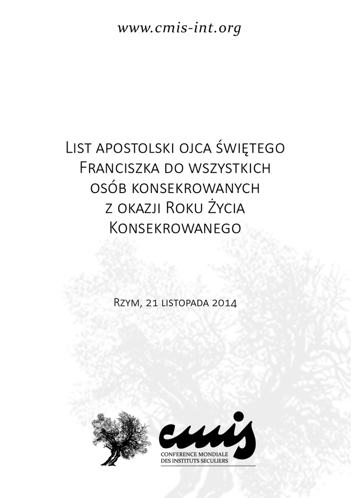List apostolski ojca świętego Franciszka do wszystkich osób konsekrowanych z okazji Roku Życia Konsekrowanego Rzym, 21 listopada 2014 List apostolski ojca świętego Franciszka do wszystkich osób konsekrowanych z okazji Roku Życia Konsekrowanego CONFÉRENCE MONDIALE DES INSTITUTS SÉCULIERS Najdrożsi kobiety i mężczyźni konsekrowani! Piszę do was jako Następca Piotra, któremu Pan Jezus powierzył zadanie umocnienia swoich braci w wierze (Łk 22,32), i piszę do was, jako wasz brat, konsekrowany Bogu, podobnie jak i wy. Razem dziękujemy Ojcu, który nas powołał do pójścia za Jezusem w pełnym posłuszeństwie Jego Ewangelii i w służbie Kościołowi oraz wlał w nasze serca Ducha Świętego, dającego nam radość i sprawiającego, że świadczymy całemu światu o Jego miłości i Jego miłosierdziu. Odpowiadając na odczucia wielu z was oraz Kongregacji ds. Instytutów Życia Konsekrowanego i Stowarzyszeń Życia Apostolskiego, z okazji 50. rocznicy Konstytucji dogmatycznej o Kościele Lumen gentium, która w rozdziale VI mówi o zakonnikach, a także dekretuPerfectae caritatis o odnowie życia zakonnego, postanowiłem ogłosić Rok Życia Konsekrowanego. Rozpocznie się on 30 listopada bieżącego roku, w pierwszą niedzielę Adwentu, a skończy się w święto Ofiarowania Pana Jezusa w Świątyni, 2 lutego 2016 r. Po wysłuchaniu opinii Kongregacji ds. Instytutów Życia Konsekrowanego i Stowarzyszeń Życia Apostolskiego, wskazałem jako cele tego roku te same, jakie święty Jan Paweł II zaproponował Kościołowi na początku trzeciego tysiąclecia, podejmując w pewien sposób to, co wskazał już w adhortacji posynodalnej Vita consecrata: „Powinniście nie tylko wspominać i opowiadać swoją chwalebną przeszłość, ale także budować nową wielką, historię! Wpatrujcie się w przyszłość, ku której kieruje was Duch, aby znów dokonać z wami wielkich dzieł” (n. 110). 3 www.cmis-int.org I - CELE ROKU ŻYCIA KONSEKROWANEGO 1. Pierwszym celem jest spojrzenie w przeszłość z wdzięcznością. Każdy nasz instytut jest owocem bogatej historii charyzmatycznej. U jego początków obecne jest działanie Boga, który w swoim Duchu powołuje niektóre osoby do bezpośredniego pójścia za Chrystusem, do przełożenia Ewangelii na szczególną formę życia, do odczytania oczyma wiary znaków czasu, do twórczego odpowiedzenia na potrzeby Kościoła. Doświadczenie początków następnie wzrosło i rozwinęło się wciągając innych członków w nowych kontekstach geograficznych i kulturowych, tworząc nowe sposoby realizacji charyzmatu, nowe inicjatywy i wyrazy miłości apostolskiej. Jest to jak ziarno, które staje się drzewem, rozprzestrzeniając swe gałęzie. Dobrze by było, aby w ciągu tego roku każda rodzina charyzmatyczna przypomniała swoje początki i swój historyczny rozwój, żeby podziękować Bogu, który dał Kościołowi tak wiele darów, czyniących go pięknym i wyposażonym do każdego dobrego dzieła (por.Lumen gentium, 12). Niezbędne jest opowiedzenie swojej historii, aby zachować żywą tożsamość, jak również umocnić jedność rodziny zakonnej i poczucie przynależności jej członków. Nie chodzi o robienie wykopalisk i kultywowanie bezużytecznych nostalgii, ale raczej o odkrycie na nowo drogi minionych pokoleń, aby uchwycić w niej inspirującą iskrę, ideowość, plany, wartości, które ją pobudzały począwszy od założycieli i założycielek, od pierwszych wspólnot. Jest to również sposób na uświadomienie sobie, jak przeżywano charyzmat na przestrzeni dziejów, jakie wyzwolił kreatywności, jakim trudnościom musiał stawić czoło i jak je przezwyciężono. Można będzie odkryć niekonsekwencje, owoc ludzkiej słabości, 4 CONFÉRENCE MONDIALE DES INSTITUTS SÉCULIERS czasem może nawet zapomnienie niektórych istotnych aspektów charyzmatu. Wszystko jest pouczające, a jednocześnie stanowi wezwanie do nawrócenia. Opowiadanie swej historii jest składaniem chwały Bogu i dziękczynieniem Jemu za wszystkie Jego dary. Dziękujemy Mu szczególnie za minione 50 lat, jakie nastąpiły po Soborze Watykańskim II, który stanowił „poryw” Ducha Świętego dla całego Kościoła. Dzięki niemu życie konsekrowane przeszło owocną drogę odnowy, która z jej blaskami i cieniami była czasem łaski, naznaczonym obecnością Ducha. Niech ten Rok Życia Konsekrowanego będzie również okazją do wyznania z pokorą, a równocześnie z wielką ufnością w Bogu, który jest Miłością (por. 1J 4,8), naszej kruchości oraz przeżywania jej jako doświadczenia miłosiernej miłości Pana; okazją do wołania do świata z mocą i świadczenia z radością o świętości i witalności większości tych, którzy zostali powołani do pójścia za Chrystusem w życiu konsekrowanym. 2. Ten Rok wzywa nas również, by przeżywać teraźniejszość z pasją. Wdzięczna pamięć o przeszłości pobudza nas, byśmy uważnie słuchając tego, co Duch mówi dziś do Kościoła, coraz głębiej realizowali konstytutywne aspekty naszego życia konsekrowanego. Od początków pierwszego monastycyzmu, aż po dzisiejsze „nowe wspólnoty”, każda forma życia konsekrowanego rodzi się z wezwania Ducha, by iść za Chrystusem, tak jak tego naucza Ewangelia (por. Perfectae caritatis, 2). Dla założycieli i założycielek absolutną regułą była Ewangelia, a wszelka inna reguła pragnęła być jedynie wyrazem Ewangelii i narzędziem, aby żyć nią w pełni. Ich ideałem był Chrystus, całkowite wewnętrzne przylgnięcie do Niego, aby móc powiedzieć wraz ze św. Pawłem: „Dla mnie żyć to Chrystus” (Flp 1, 21); śluby miały sens tylko po to, aby zrealizować tę ich namiętną miłość. 5 www.cmis-int.org W tym roku jesteśmy wezwani, by postawić sobie pytanie, które brzmi: czy i jak również my pozwalamy, by Ewangelia była dla nas wyzwaniem; czy jest ona dla nas rzeczywiście „vademecum” na każdy dzie