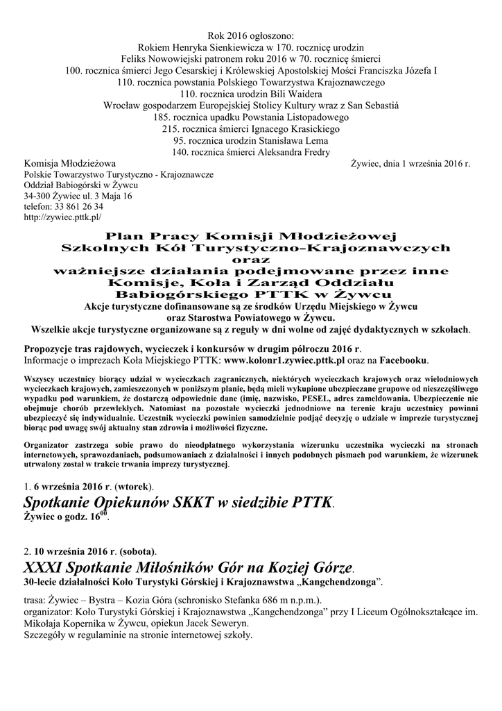 Rok 2016 ogłoszono: Rokiem Henryka Sienkiewicza w 170. rocznicę urodzin Feliks Nowowiejski patronem roku 2016 w 70. rocznicę śmierci 100. rocznica śmierci Jego Cesarskiej i Królewskiej Apostolskiej Mości Franciszka Józefa I 110. rocznica powstania Polskiego Towarzystwa Krajoznawczego 110. rocznica urodzin Bili Waidera Wrocław gospodarzem Europejskiej Stolicy Kultury wraz z San Sebastiá 185. rocznica upadku Powstania Listopadowego 215. rocznica śmierci Ignacego Krasickiego 95. rocznica urodzin Stanisława Lema 140. rocznica śmierci Aleksandra Fredry Komisja Młodzieżowa Żywiec, dnia 1 września 2016 r. Polskie Towarzystwo Turystyczno - Krajoznawcze Oddział Babiogórski w Żywcu 34-300 Żywiec ul. 3 Maja 16 telefon: 33 861 26 34 http://zywiec.pttk.pl/ Plan Pracy Komisji Młodzieżowej Szkolnych Kół Turystyczno-Krajoznawczych oraz ważniejsze działania podejmowane przez inne Komisje, Koła i Zarząd Oddziału Babiogórskiego PTTK w Żywcu Akcje turystyczne dofinansowane są ze środków Urzędu Miejskiego w Żywcu oraz Starostwa Powiatowego w Żywcu. Wszelkie akcje turystyczne organizowane są z reguły w dni wolne od zajęć dydaktycznych w szkołach. Propozycje tras rajdowych, wycieczek i konkursów w drugim półroczu 2016 r. Informacje o imprezach Koła Miejskiego PTTK: www.kolonr1.zywiec.pttk.pl oraz na Facebooku. Wszyscy uczestnicy biorący udział w wycieczkach zagranicznych, niektórych wycieczkach krajowych oraz wielodniowych wycieczkach krajowych, zamieszczonych w poniższym planie, będą mieli wykupione ubezpieczane grupowe od nieszczęśliwego wypadku pod warunkiem, że dostarczą odpowiednie dane (imię, nazwisko, PESEL, adres zameldowania. Ubezpieczenie nie obejmuje chorób przewlekłych. Natomiast na pozostałe wycieczki jednodniowe na terenie kraju uczestnicy powinni ubezpieczyć się indywidualnie. Uczestnik wycieczki powinien samodzielnie podjąć decyzję o udziale w imprezie turystycznej biorąc pod uwagę swój aktualny stan zdrowia i możliwości fizyczne. Organizator zastrzega sobie prawo do nieodpłatnego wykorzystania wizerunku uczestnika wycieczki na stronach internetowych, sprawozdaniach, podsumowaniach z działalności i innych podobnych pismach pod warunkiem, że wizerunek utrwalony został w trakcie trwania imprezy turystycznej. 1. 6 września 2016 r. (wtorek). Spotkanie Opiekunów SKKT w siedzibie PTTK. 00 Żywiec o godz. 16 . 2. 10 września 2016 r. (sobota). XXXI Spotkanie Miłośników Gór na Koziej Górze. 30-lecie działalności Koło Turystyki Górskiej i Krajoznawstwa „Kangchendzonga”. trasa: Żywiec – Bystra – Kozia Góra (schronisko Stefanka 686 m n.p.m.). organizator: Koło Turystyki Górskiej i Krajoznawstwa „Kangchendzonga” przy I Liceum Ogólnokształcące im. Mikołaja Kopernika w Żywcu, opiekun Jacek Seweryn. Szczegóły w regulaminie na stronie internetowej szkoły. 2 3. 15 września 2016 r. (czwartek). Wycieczka rekreacyjna do Parku Rozrywki Energylandia w Zatorze. trasa: Żywiec – Zator: pobyt w Parku Rozrywki Energylandia w godz. od 10 do około 16 – Żywiec Całkowita długość trasy przejazdu autokarem: około 110 km. (ST, 0,75; d 0,75) Wyjazd autokarem o godz. 900 z Żywca z parkingu przy Miejskim Centrum Kultury. Planowany powrót do Żywca około godz. 1730. Tylko we wrześniu wszystkie bilety szkolne (grupowe) taniej o 23% VAT! Taniej nawet o 16 złotych za osobę! Promocja obowiązuje na wycieczki organizowane od 1 do 15 września 2016 r. O promocji decyduje data przyjazdu, nie data rezerwacji. koszt: Szkoła Podstawowa – 39 zł Gimnazjum – 48 zł Do grupy 44 dzieci, 4 opiekunów, bilet za 1 zł, do grupy 45 dzieci, 5 opiekunów, bilet za 1 zł W ramach wycieczki organizator pokrywa koszty przejazdu autokarem, a uczestnicy płacą jedynie za bilety wstępu w zależności od powyższej grupy wiekowej. Planowany powrót do Żywca na godz. 17. organizator: Komisja Młodzieżowa Szkolnych Kół Turystyczno-Krajoznawczych PTTK Żywiec osoba prowadząca: Andrzej Szewczyk, e-mail: [email protected] Zapisy telefoniczne prowadzi Andrzej Szewczyk pod numerem 795279180 lub 33 8618494. informacje o strefie familijnej w Parku Rozrywki Energylandia można znaleźć na stronie internetowej: http://energylandia.pl/strefy/strefa-familijna/ Informacje o Parku Rozrywki Energylandia: to ogromny, nowoczesny kompleks rozrywkowy, pierwszy i jedyny tego typu obiekt w Polsce, zlokalizowany w urokliwym miasteczku Zator, nieopodal Oświęcimia. Atrakcje są podzielone na 3 Strefy: Dla Najmłodszych, Familijną oraz Ekstremalną. Park Rozrywki na ogromnej przestrzeni 26 hektarów oferuje aż 57 różnego rodzaju atrakcji i urządzeń i co bardzo ważne wszystkie dostępne są bez ograniczeń, w cenie jednego biletu! To system sprzedaży biletów znany z największych parków rozrywki nie tylko w Europie, ale i na całym świecie. Królują tutaj atrakcje wodne, takie jak: spływ rwącą rzeką, strzelanie z armatek wodnych, czy spływ łódką po specjalnym, wodnym torze. Oprócz tego dla rodzin czeka kolejka widokowa oraz duża wersja samochodzików. 4. 17 września 2016 r. (sobota). Wycieczka turystyczna do Ostrawy na XV jubileuszowe pokazy lotnicze. NATO Days in Ostrava & Czech Air Force Days. Republika Czeska – Lotnisko w Mośnovie. Show w powietrzu i na ziemi, pełne myśliwców i helikopterów oraz pokazów ćwiczeń specjalnych jednostek armii. trasa: Żywiec – Cieszyn, przekroczenie granicy polsko-czeskiej – Ostrawa: oglądanie pokazów lotniczych w port lotniczy Ostrawa im. Leoša Janáčka (dawniej Port lotniczy Ostrava-Mošnov) – Żywiec Całkowita długość trasy przejazdu autokarem: około 220 km. (ST, 1,1; d 0,2) Wyjazd autokarem o godz. 700 z Żywca z parkingu przy Miejskim Centrum Kultury. Planowany powrót do Żywca około godz. 19. koszt: około 30 zł. (cena obejmuje: przejazd autokarem, ubezpieczenie grupowe oraz opłatę parkingową, wstęp na pokazy jest wolny). Czas trwania pokazów w godz