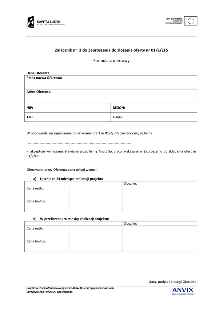 Załącznik nr 1 do Zaproszenia do złożenia oferty nr 01/Z/EFS Formularz ofertowy Dane Oferenta: Pełna nazwa Oferenta: Adres Oferenta: NIP: REGON: Tel.: e-mail: W odpowiedzi na zaproszenie do składania ofert nr 01/Z/EFS oświadczam, że firma ……………………………………………………………………………………………………………: - akceptuje wymagania stawiane przez firmę Anvix Sp. z o.o. wskazane w Zaproszeniu do składania ofert nr 01/Z/EFS Oferowana przez Oferenta cena usługi wynosi: a) Łącznie za 24 miesiące realizacji projektu Słownie: Cena netto: Cena brutto: b) W przeliczeniu za miesiąc realizacji projektu: Słownie: Cena netto: Cena brutto: data, podpis i pieczęd Oferenta Projekt jest współfinansowany ze środków Unii Europejskiej w ramach Europejskiego Funduszu Społecznego. Załącznik nr 2 do Zaproszenia do złożenia oferty nr 01/Z/EFS Oświadczenie i wykaz usług zrealizowanych w ramach wsparcia EFS w ciągu ostatnich 2 lat Dane Oferenta: Pełna nazwa Oferenta: Adres Oferenta: NIP: REGON: Tel.: e-mail: Oświadczam, iż Firma, którą reprezentuję, posiada doświadczenie w realizacji działao w ramach projektów współfinansowanych ze środków Europejskiego Funduszu Społecznego i w ciągu ostatnich 2 lat zrealizowała następujące działania w ramach projektów EFS (własnych i na zlecenie). Data realizacji Priorytet i działanie/ numer umowy Nazwa Beneficjenta Zakres działao w ramach projektu EFS data, podpis i pieczęd Wykonawcy Projekt jest współfinansowany ze środków Unii Europejskiej w ramach Europejskiego Funduszu Społecznego. Załącznik nr 3 do Zaproszenia do złożenia oferty nr 01/Z/EFS Oświadczenie i wykaz usług zrealizowanych w ramach realizacji projektów szkoleniowych otwartych w ciągu ostatnich 2 lat. Dane Oferenta: Pełna nazwa Oferenta: Adres Oferenta: NIP: REGON: Tel.: e-mail: Oświadczam, iż Firma, którą reprezentuję, posiada doświadczenie w realizacji działao w ramach projektów szkoleniowych otwartych i w ciągu ostatnich 2 lat zrealizowała następujące działania w ramach wskazanego typu projektów: Data realizacji Nazwa Zleceniodawcy Zakres działao w ramach szkoleniowego otwartego data, podpis i pieczęd Wykonawcy Projekt jest współfinansowany ze środków Unii Europejskiej w ramach Europejskiego Funduszu Społecznego. Załącznik nr 4 do Zaproszenia do złożenia oferty nr 01/Z/EFS Oświadczenie dot. potencjału organizacyjnego Oferenta. Dane Oferenta: Pełna nazwa Oferenta: Adres Oferenta: NIP: REGON: Tel.: e-mail: Oświadczam, iż Firma, którą reprezentuję, posiada potencjał organizacyjny pozwalający na prawidłową realizację projektu będącego przedmiotem postępowania nr 01/Z/EFS data, podpis i pieczęd Wykonawcy Projekt jest współfinansowany ze środków Unii Europejskiej w ramach Europejskiego Funduszu Społecznego. Załącznik nr 5 do Zaproszenia do złożenia oferty nr 01/Z/EFS Wykaz kadry skierowanej do realizacji projektu będącego przedmiotem postępowania. Dane Oferenta: Pełna nazwa Oferenta: Adres Oferenta: NIP: REGON: Tel.: e-mail: Oświadczam, iż Firma, którą reprezentuję, oddeleguje do realizacji projektu będącego przedmiotem postępowania następujący personel: Imię i nazwisko pracownika Oferenta Wykształcenie Doświadczenie zawodowe data, podpis i pieczęd Wykonawcy Projekt jest współfinansowany ze środków Unii Europejskiej w ramach Europejskiego Funduszu Społecznego.